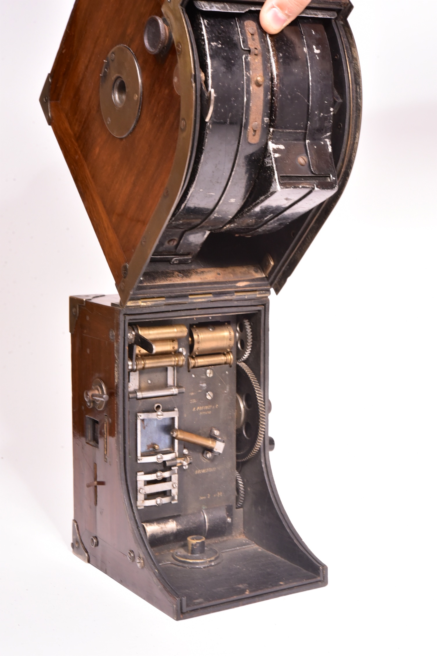 Rare caméra cinématographique italienne 35 mm fabriquée par Attilio Prevost à Milan. Numéro de série 28. Très belle construction, boitier en bois de palissandre. Prevost avait déposé le brevet italien N° 136 703 du 6 septembre 1913 pour cet appareil. La Cinémathèque Française possède un exemplaire de cette caméra, mais avec un boitier métallique. Elle y est qualifiée ainsi : « entraînement du film 35 mm par deux griffes ; deux débiteurs dentés ; emplacement intérieur pour deux magasins coaxiaux ; dispositif de poinçonnage sur la pellicule ; tourelle à deux objectifs ; viseur clair et pointeur ; obturateur deux pales réglables ; compteur métrique à aiguille ; niveau à bulle ; poignée cuir ; manivelle. ». Dimensions : 33x27x21 cm.