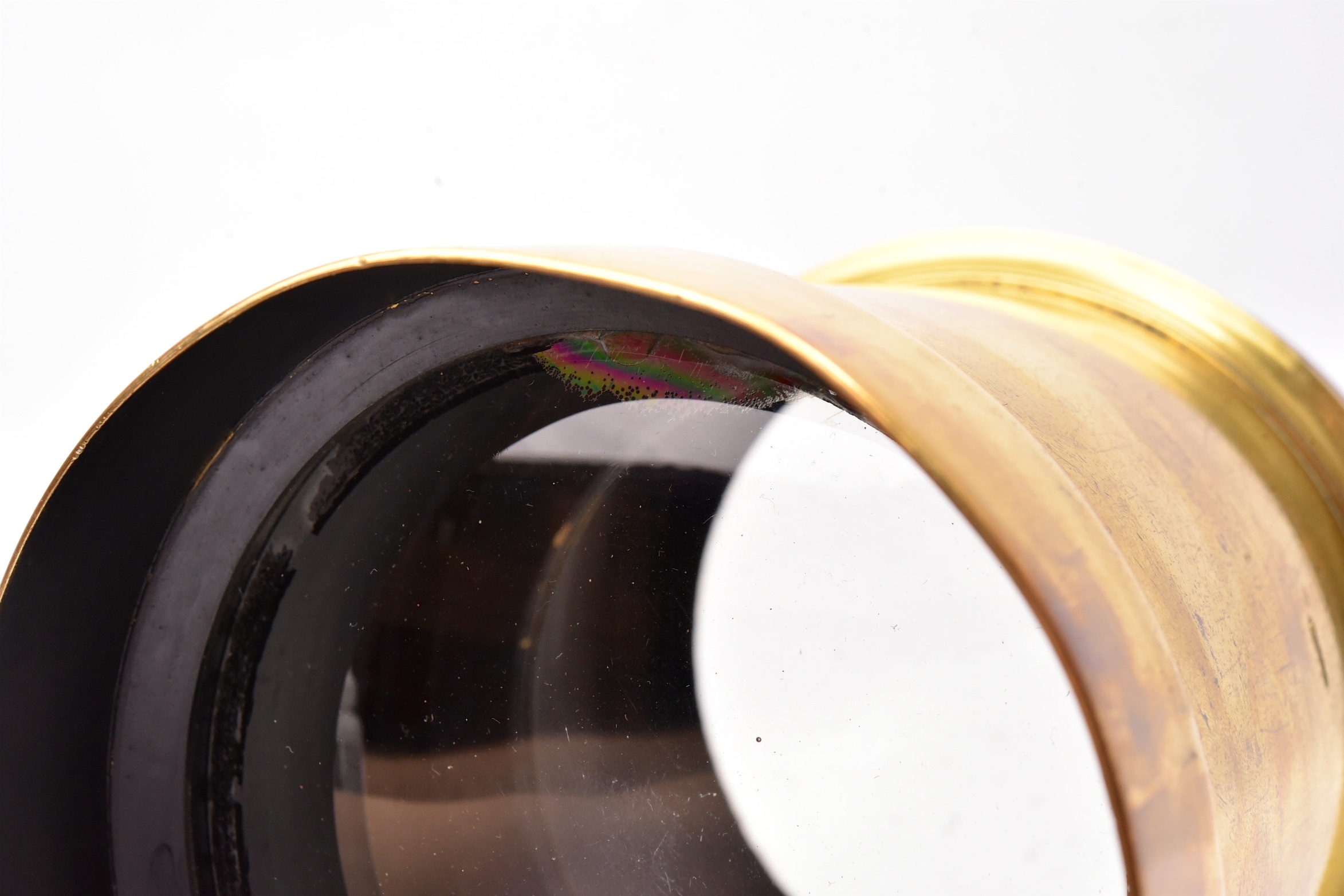 Objectif Ross London Actinic Doublet. 22 X 20 in. Diamètre avant : 13 cm. Hauteur : 17 cm. Focale : 600mm. Présence d’un diaphragme et du bouchon. L’objectif est l’un des premiers de type doublet non symétrique. Avec son numéro de série 12699, les relevés indiquent une production vers 1870.