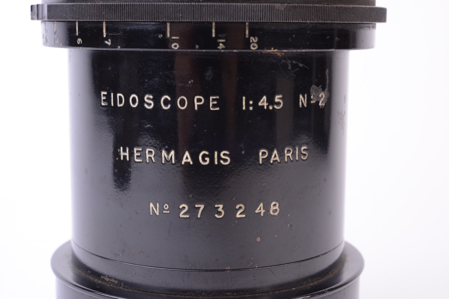 Objectif en laiton du fabricant français Hermagis en finition laquée noire. L'Eidoscope s'est imposé comme une référence pour le portrait. La longueur focale du n°2 est d'environ 375mm et l'ouverture maximale est de f/4.5. Il permet d'accommoder des chambres de format 18x24cm à 24x30cm. Le fut de l'objectif mesure 18,5cm de haut et les lentilles mesurent 83mm de diamètre. Diaphragme opérationnel. Pas de rayure, pas de brume, pas de champignon. Vient avec son pare-soleil, sa bague de fixation à cinq trous de vis et son bouchon. Numéro de série : 273248.