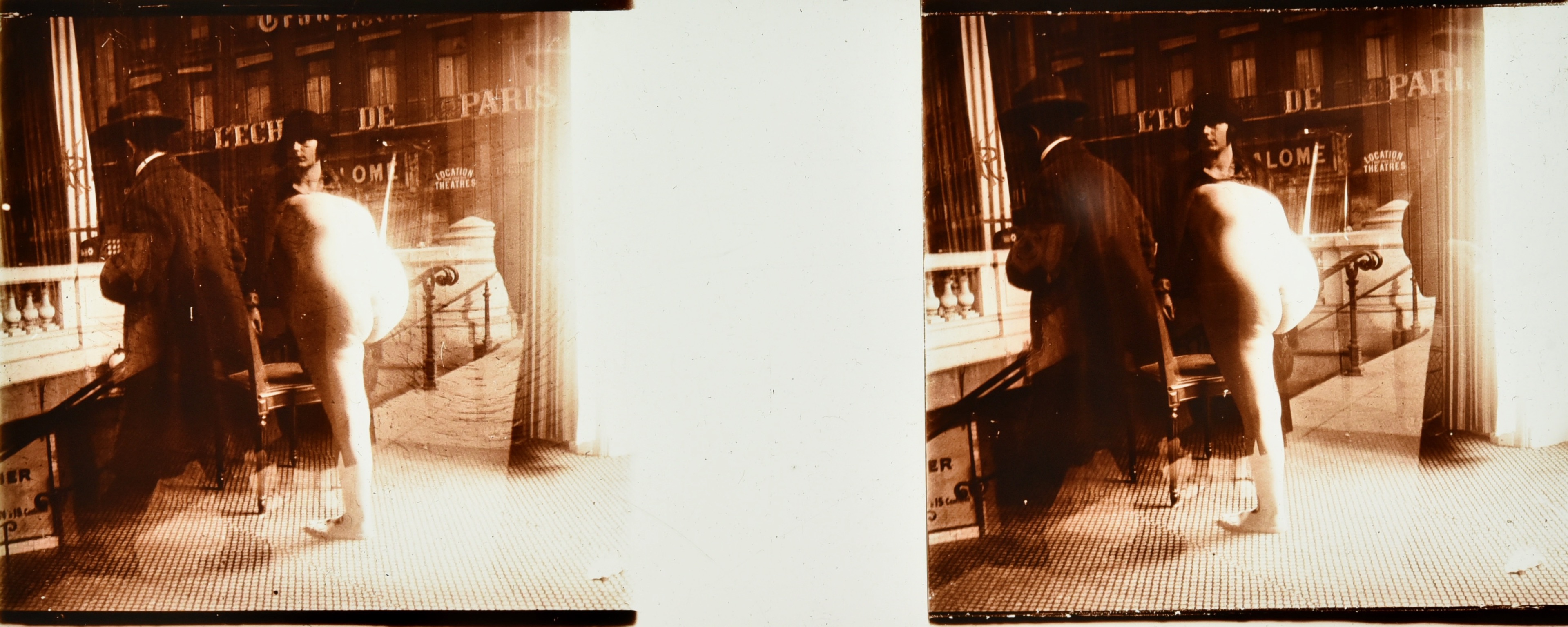 Vue stéréoscopique sur verre au format 45 x 107 mm. Double exposition figurant deux scènes : une femme penchée sur une chaise dévoilant un postérieur opulent et une entrée de métro parisien avec des passants. Juxtaposition insolite, surprenante, dans une veine quasi-surréaliste.