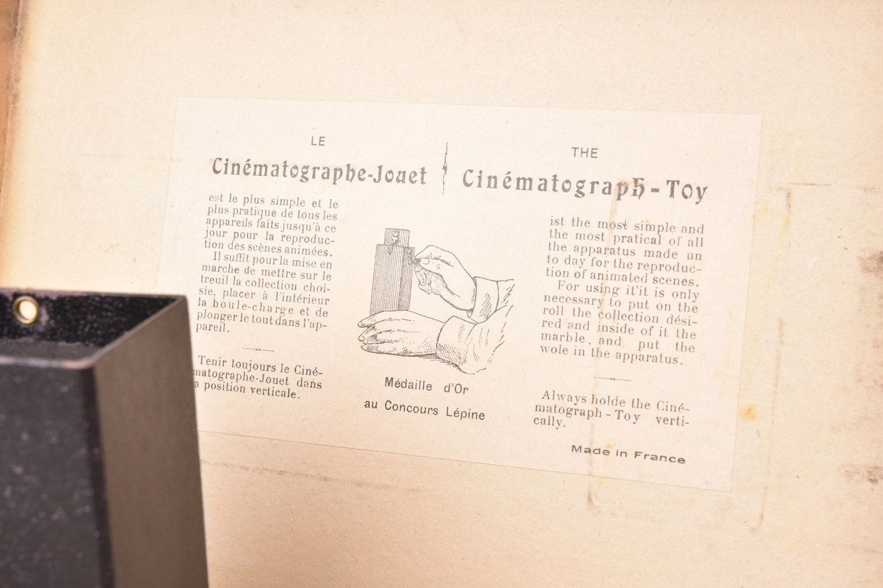 Cinématographe Jouet Déposé. Une telle invention reçut la médaille d'or au concours Lépine 1920. Ensemble complet de son armature, sa boule de lestage et six bandes de scénettes animées, le tout se renfermant dans une boite coffret. A l'intérieur du couvercle de la boite se trouve contrecollée une instruction d'emploi. Exemplaire complet et en bel état. Il s'agit ici de la version grande boite.
