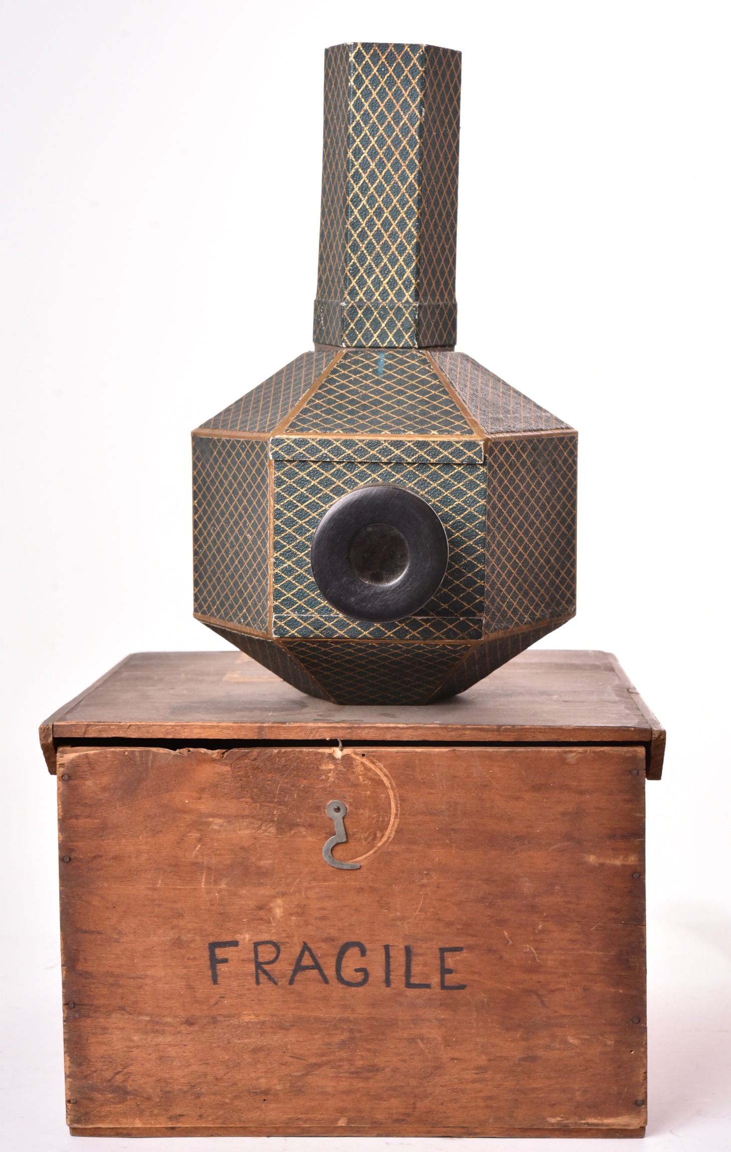 Lampascope hexagonal d'Alphonse Giroux. Il est construit tout en carton renforcé recouvert de papier avec motif géométrique sérigraphié (losanges dorés sur fond vert). Le Lampascope prenait place sur une lampe à pétrole de la maison pour servir de lanterne magique. Alphonse GIROUX avait la réputation de commercialiser ce type de lanterne au n°7 de la rue du Coq-Saint-Honoré à Paris, bien avant la présentation de la découverte de la photographie. La construction de cette lanterne est à comparer avec celle de son Miragioscope . Giroux le proposait en 1835. Il s’agissait d’une camera obscura pliable construite également en carton recouvert de papier possédant le même dessin à motif géométrique losange. Notre Lampascope date de 1830 environ. Venant dans sa boite de conditionnement en bois portant étiquette, il est en très bon état. Très rare pièce de collection.