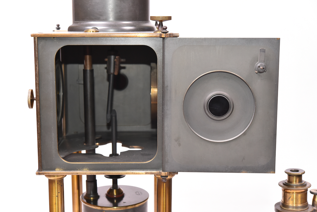 Ce modèle de lanterne photogénique Jules Duboscq a servi à la projection des dépêches microphotographiques sur gélatine au collodion durant le conflit de 1870. Ces dépêches étaient réalisées par le procédé photographique de Dagron pour être acheminées ensuite par pigeon voyageur. Cette lanterne est munie d’un système de lentilles de 85 mm de diamètre.  Dans l’intérieur de la lanterne, un miroir argenté fait converger les rayons émis en arrière de la source, de qui augmente considérablement l’intensité de la lumière. Le système de projection d’objet à caractère microscopique dérive du  principe du microscope solaire. Il  porte un jeu de lentilles achromatiques à court foyer, un mouvement rapide de mise au point au moyen d’un pignon et d’une crémaillère et un mouvement lent à vis de rappel micrométrique. La source de lumière est une lampe électrique à charbons à écartement variable. Présent dans le lot le miroir à deux faces dont l’une noircie. Il peut être utilisé avec la partie optique en tant que microscope solaire.  Hauteur 90 cm. Ensemble très peu courant, en particulier dans ce très bel état.