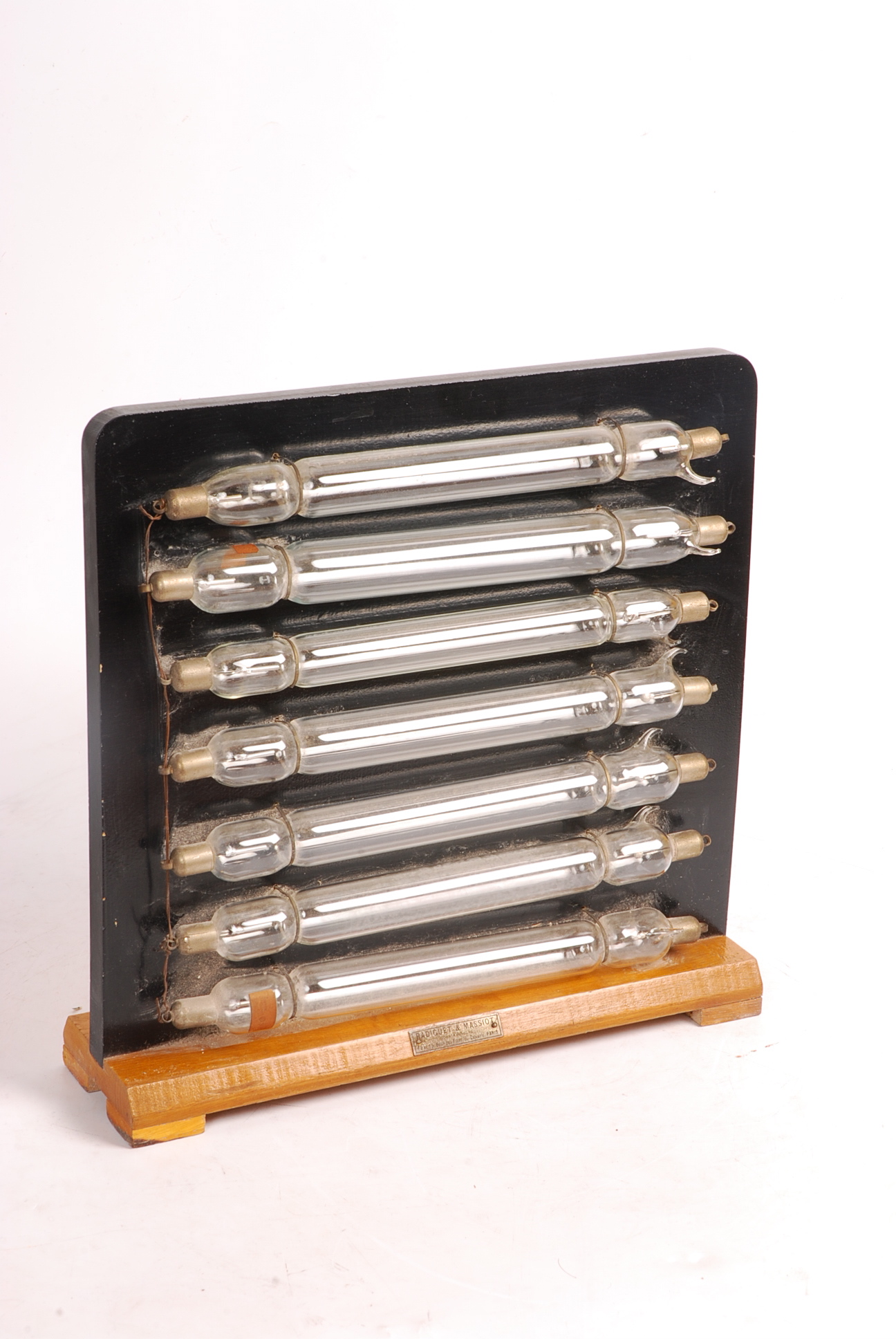 The apparatus consist of 7 tubes with different degrees of vacuum.