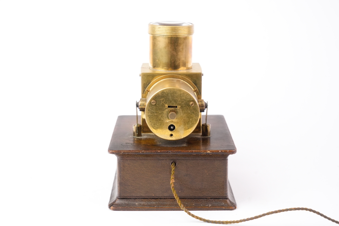Lampe à projection parfois appelée lampe de bordel qui permet de retransmettre au plafond l'heure indiquée dans le cadran. Les ampoules sont alimentées par des piles de 4V (non fournies). La projection ainsi obtenue est parfaitement lisible. construction en laiton verni et socle en bois gainé de cuir. Un cable relie l'appareil à l'interrupteur. Mouvement d'horloge A REGARDER DE PLUS PRÈS