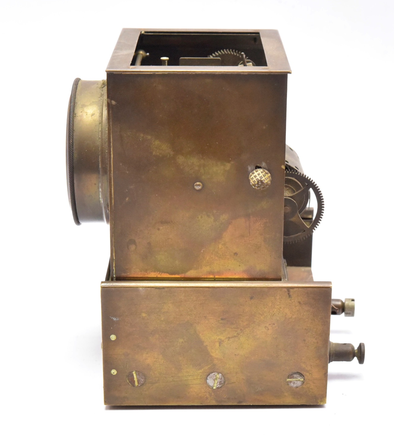 L’appareil que nous présentons date de la fin du XIXème siècle. Un dispositif d’horlogerie permet la lecture du temps. Le principe d’enregistrement des mesures s’effectue par impulsions électriques reçues sur un capteur agissant sur un système à base d’électro-aimants. Ces derniers agissent sur une mécanique à engrenages. Initialement, l’enregistrement s’effectuait par encre sur rouleau papier. Il a été modifié par la suite : l’une des bobines débitrices à rouleau papier a été remplacée par une bobine d’entrainement à roue crantée pouvant recevoir des rouleaux de film cinématographique 35mm avec perforations de type Edison. L’enregistrement se fait alors par action d’un stylet à pointe sèche sur le film. Un tel dispositif permettait ainsi un traitement photographique du support d’enregistrement autorisant ensuite la projection collégiale des graphismes enregistrés.