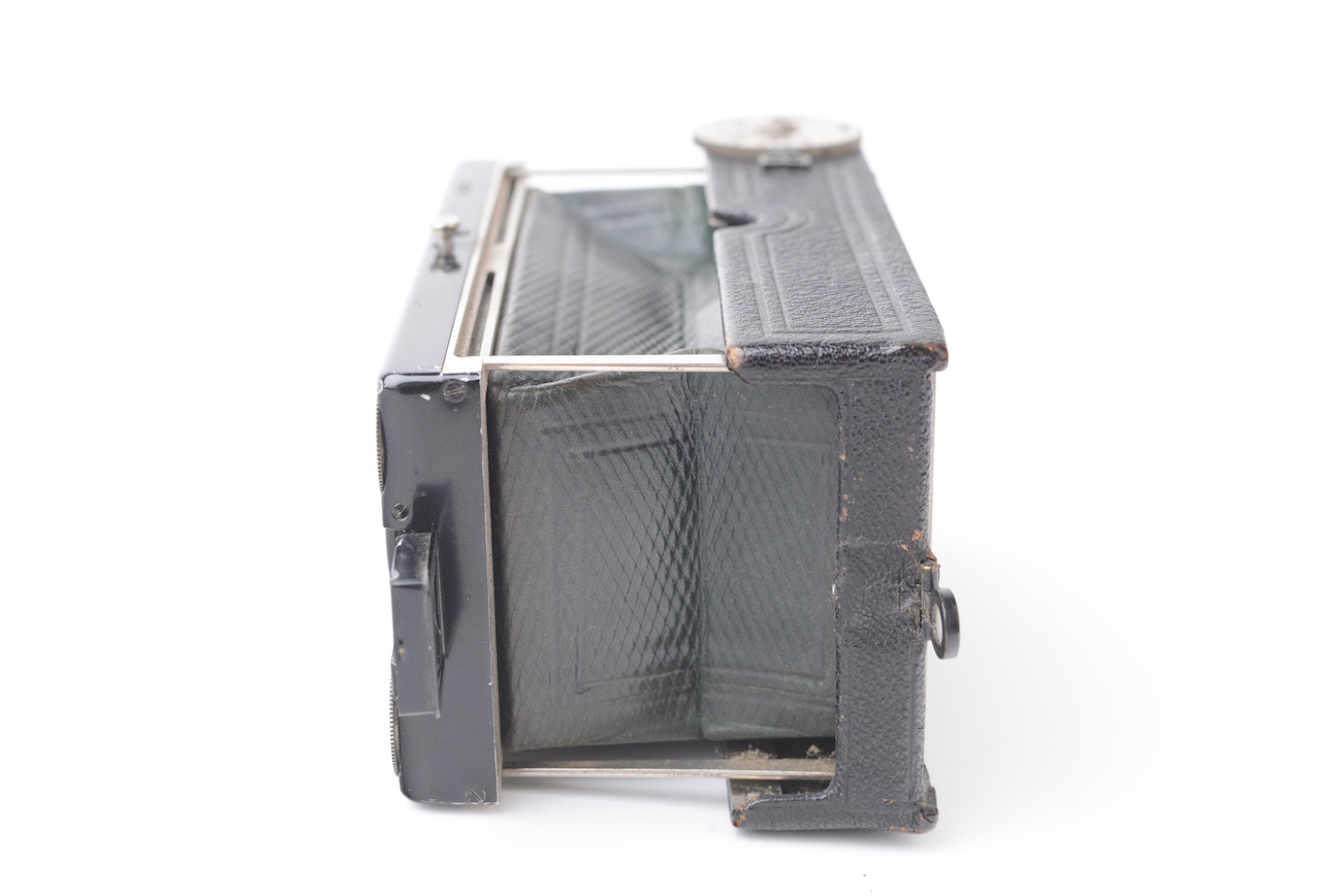 Version de luxe du Stereo Tenax standard présentant un beau soufflet couleur émeraude. Paire d'objectifs Dogmar 60mm f/4,5. Viseur sport pliant. La selection du diaphragme, l'armement et le déclenchement vérifiés. Trois choix B, T (Z ici) et M en conjonction avec le sélecteur de vitesses. Pour plaques de verre au format 6x13 cm. Rare.