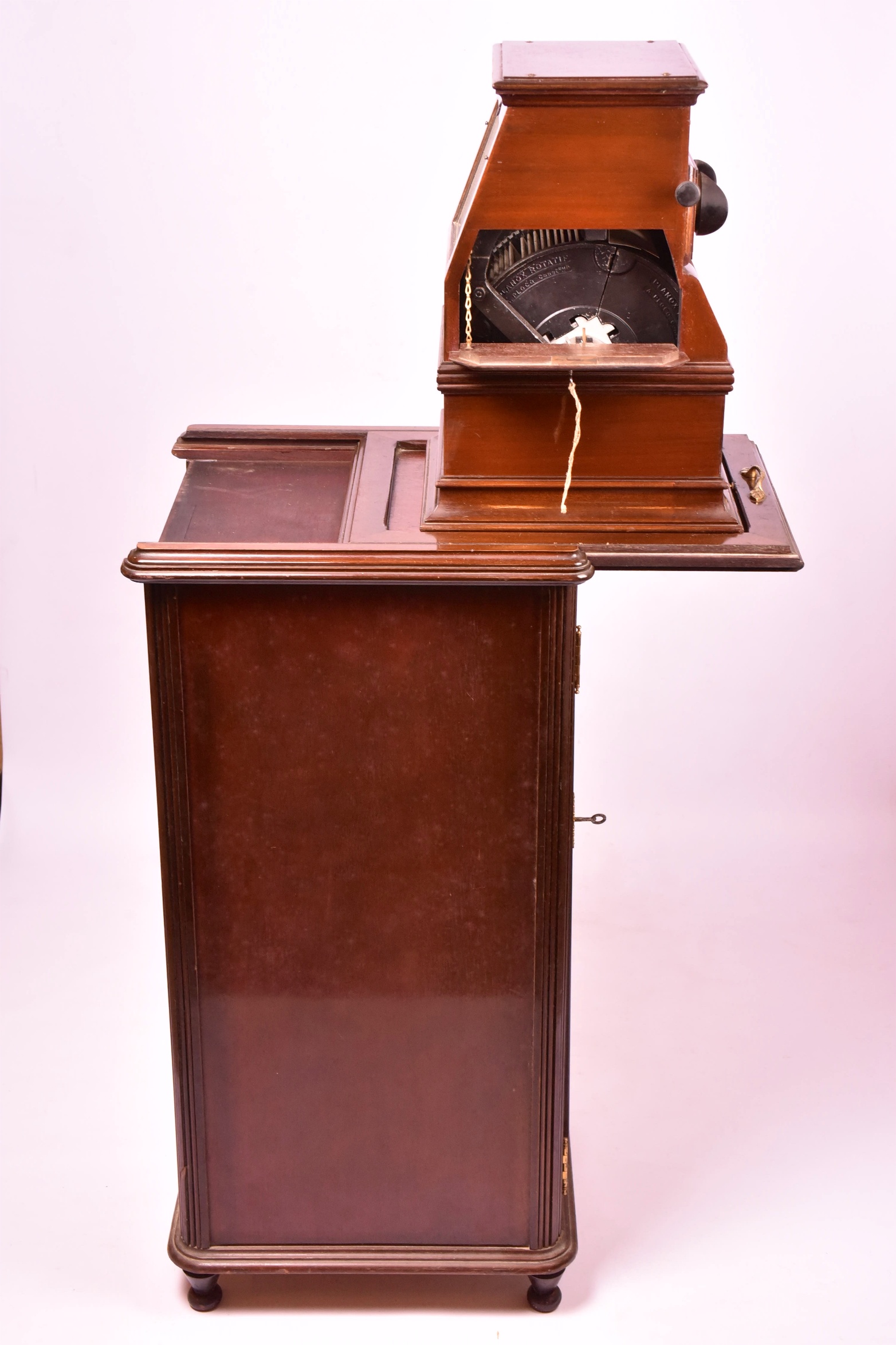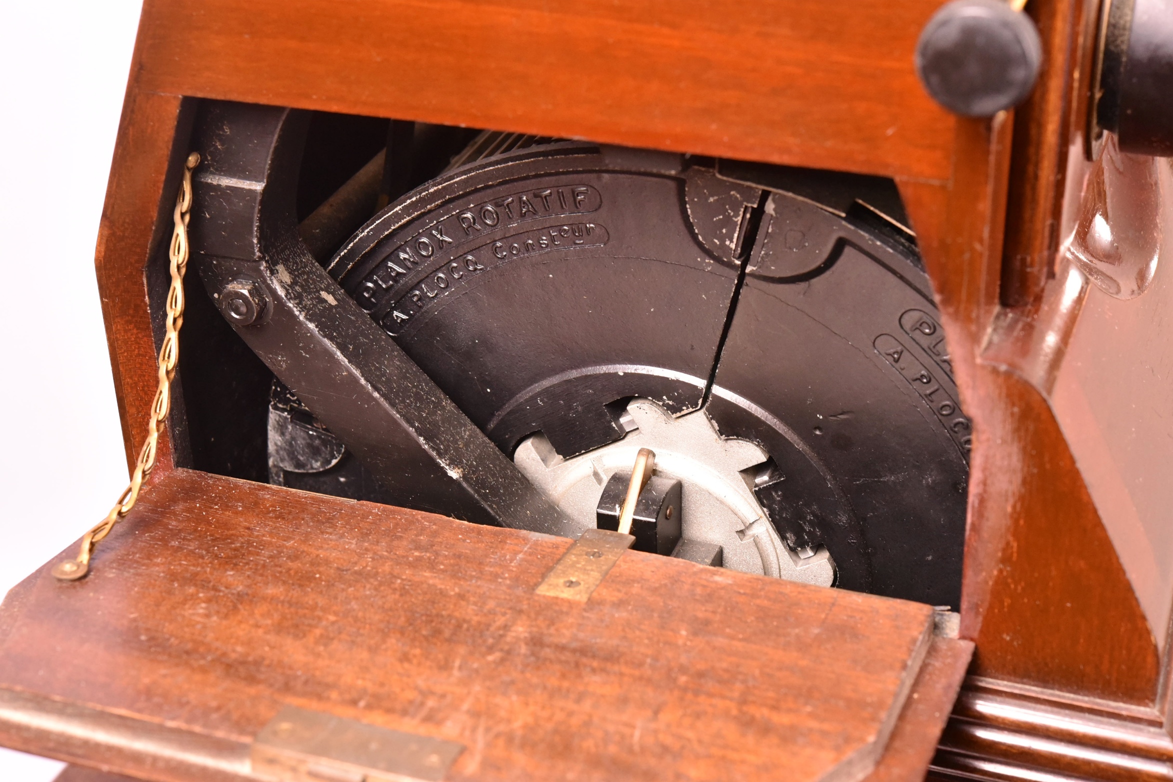 Le Meuble Colonne PLANOX avec stéréoscope « Rotatif » présente une très belle finition d'ensemble. Un système à coulisse permet d’amener vers soi l’appareil en éloignant les genoux du meuble, évitant ainsi d’être gêné. Le meuble contient 8 tiroirs. Le stéréoscope permet l’examen en relief d’une collection de clichés 6x13 ou 45x107 contenus dans des paniers de 25 vues. Ils se placent dans l’appareil au nombre de 4, composant une roue complète de 100 clichés ordinaires ou 52 autochromes doublés prêts à être examinés ou projetés ». Vers 1925. Très bel  ensemble.