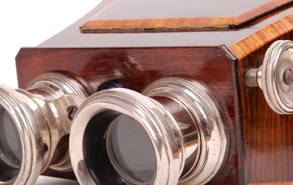 Palissandre and Rosewood Stereoviewer for glass or card views. Hinged mirror. Finely crafted in Palissandre wood, with rosewood edging. Nickel plated metal parts.