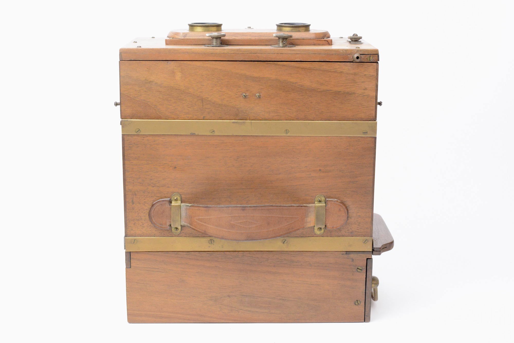 Stereo box camera, construction anonyme. Format 8,5x17 cm. Fabrication très soignée, en bois semi verni. L’appareil est équipé d’un dos magasin permettant le changement de plaque par escamotage. Les principales commandes sont réparties sur la face avant comprenant le bloc optique. La mise au point s’effectue par glissement du corps avant (système de tiroir). L’armement de l’obturateur s’effectue à l’aide d’une tirette à fil située en haut de la façade. Vers 1895. Bel appareil très peu courant.
