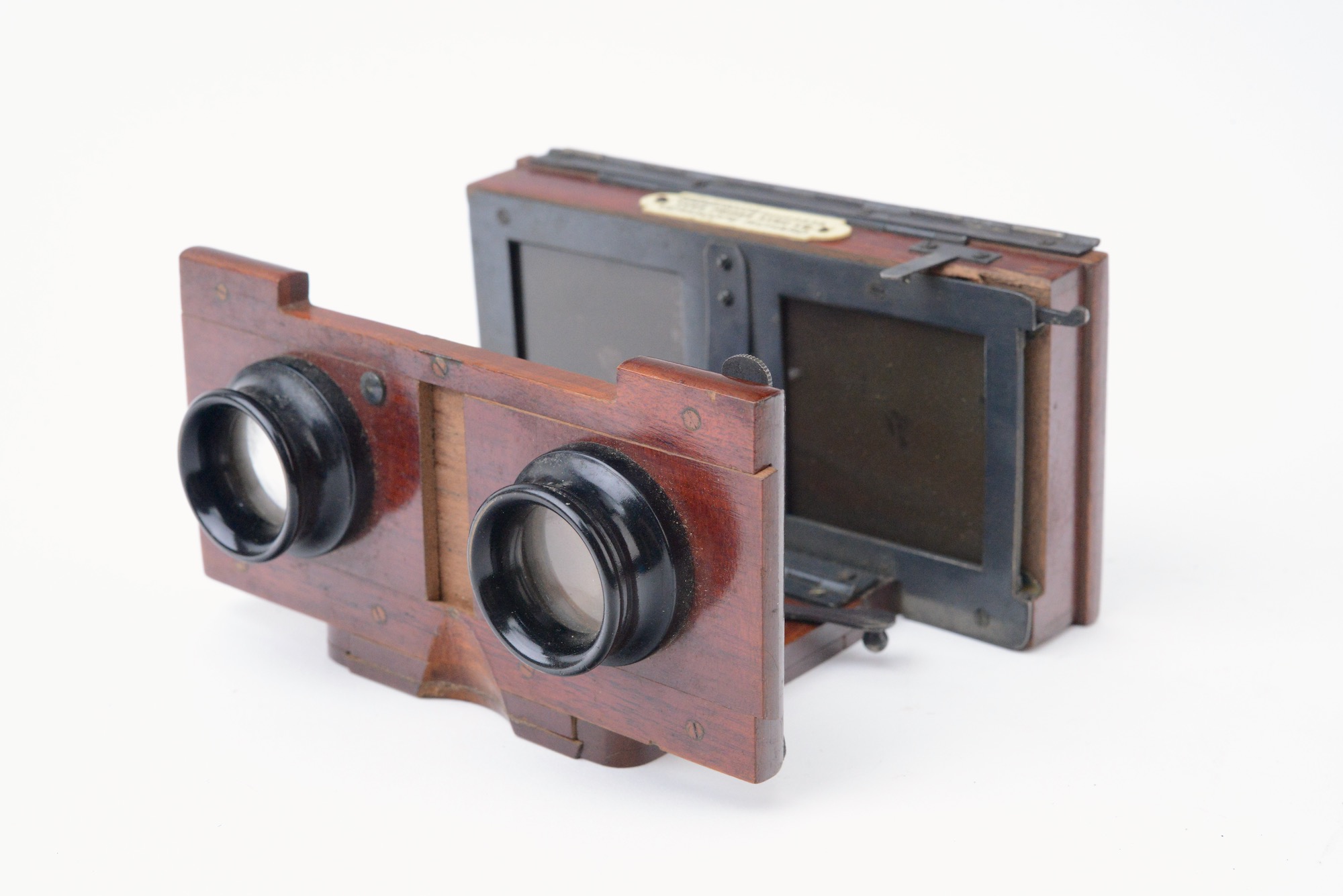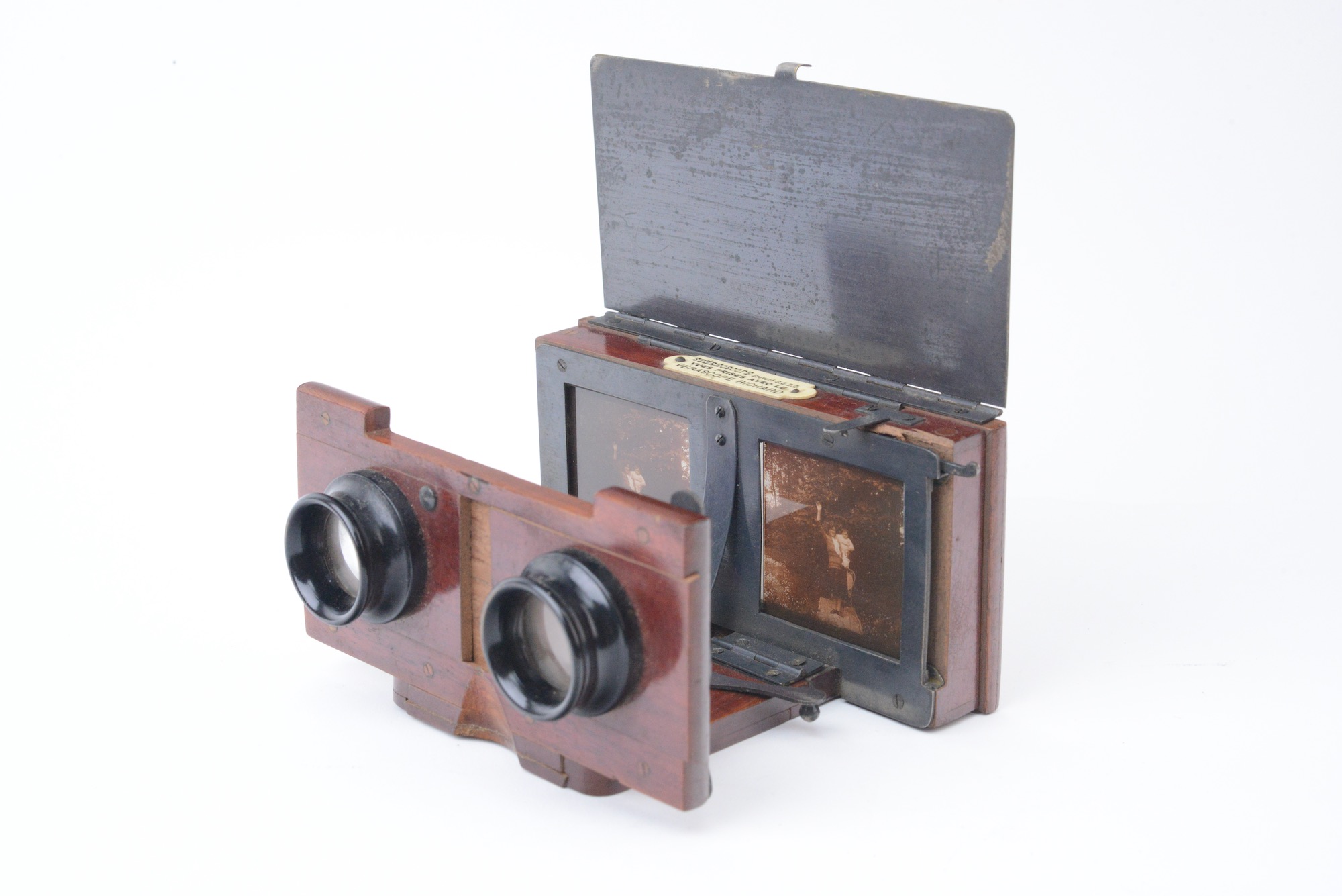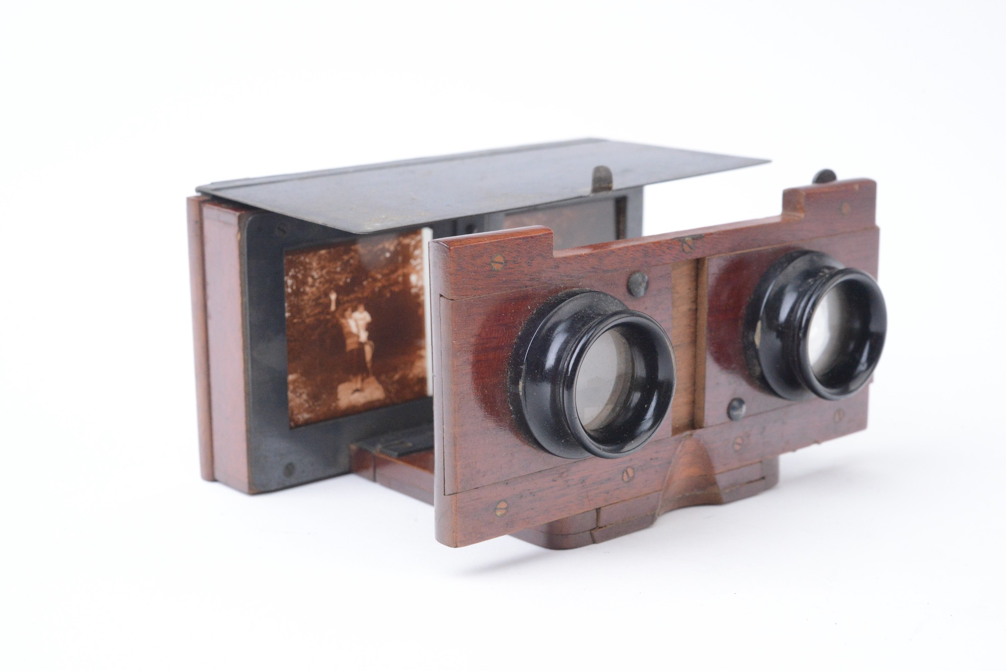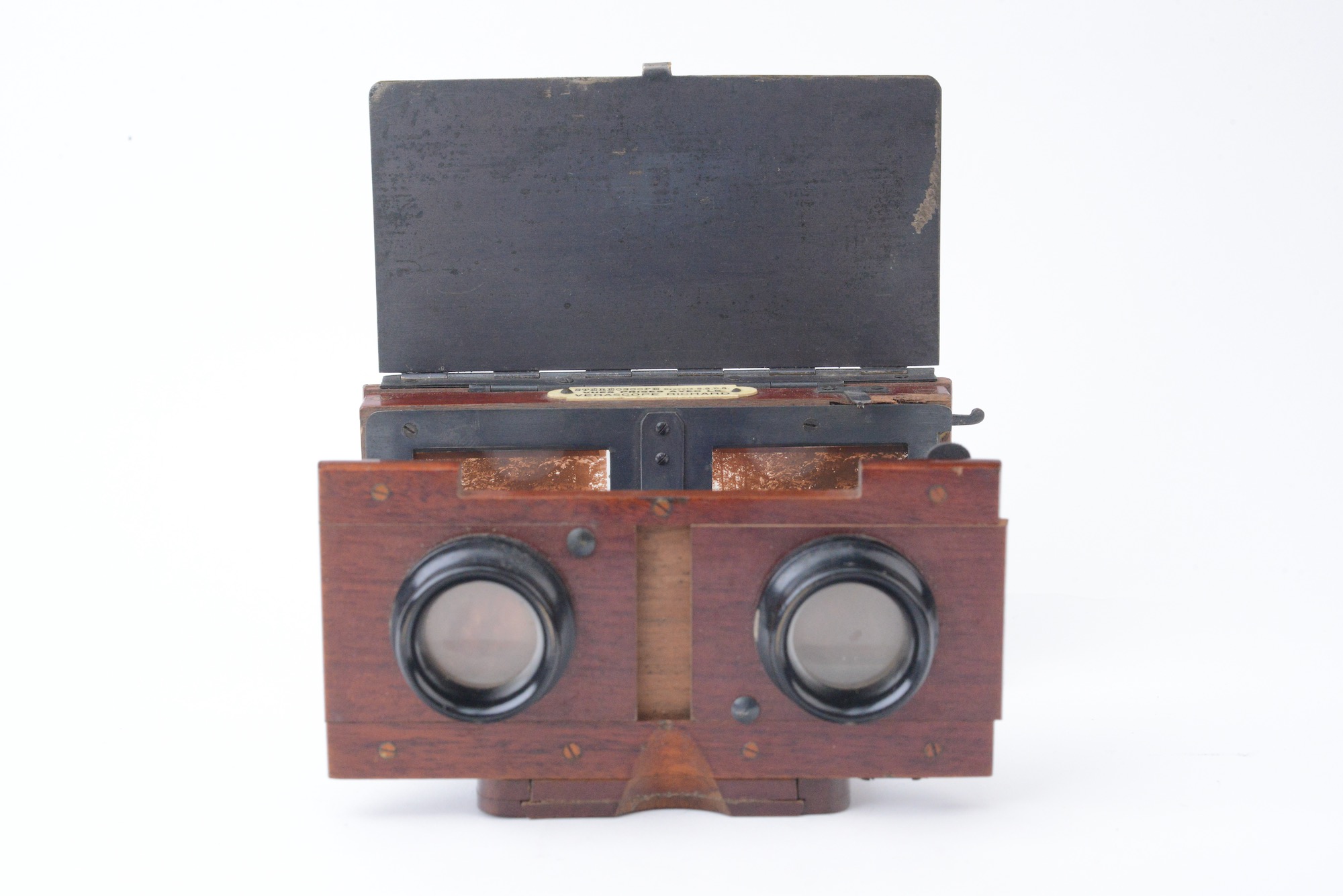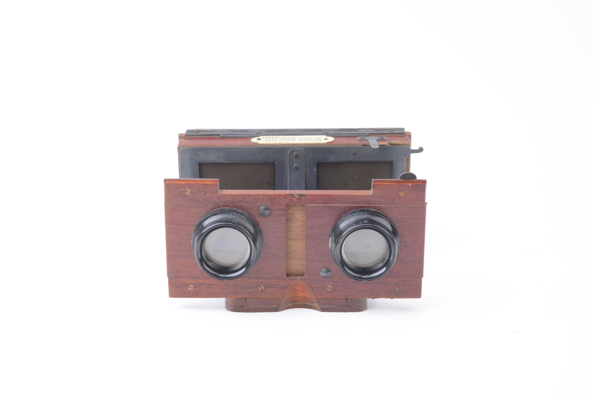 Stéréoscope pliant de poche Jules Richard. Format 45x107 mm. Belle fabrication en acajou. Mise au point et écartement variable des oculaires. D'après les publicités de l'époque,« Ne tenant pas plus de place qu’un portefeuille ». Vers 1900.