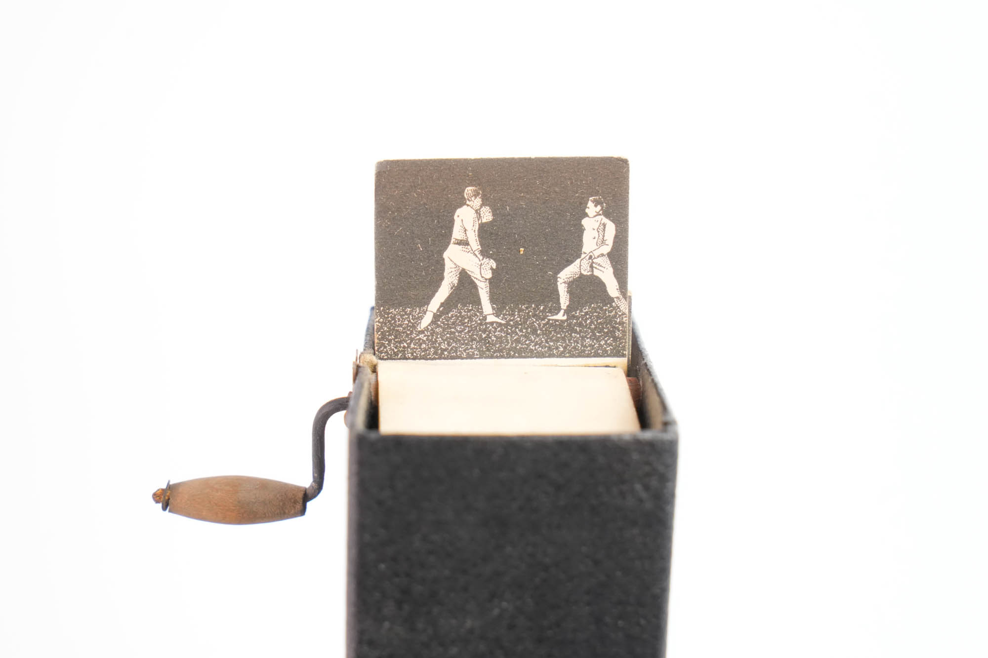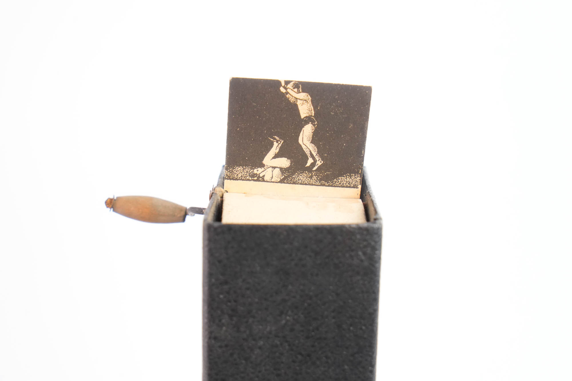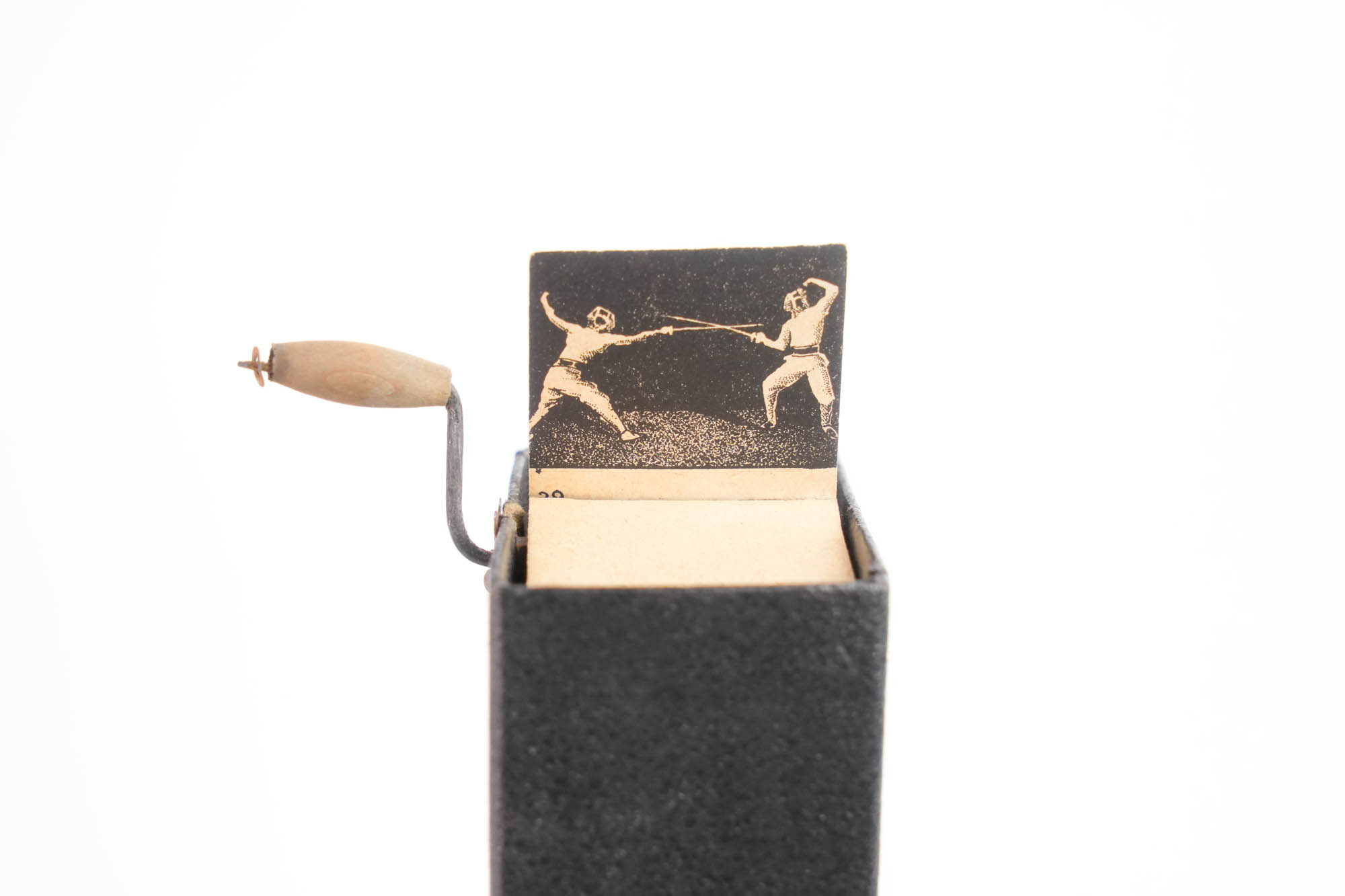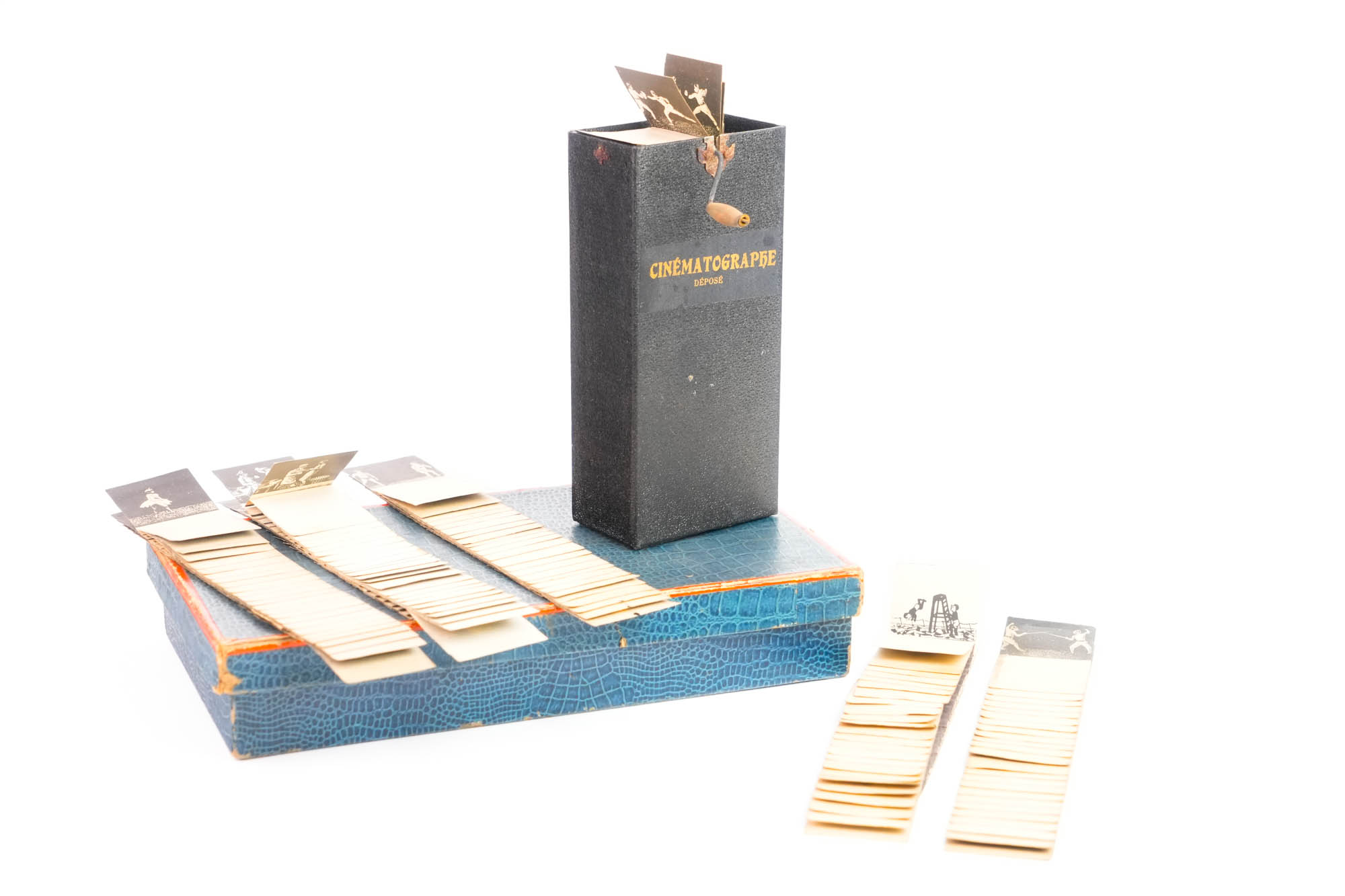 Cinématographe Jouet Déposé. Une telle invention reçut la médaille d'or au concours Lépine 1920. Ensemble complet de son armature, sa boule de lestage et cinq bandes de scénettes animées, le tout se renfermant dans une boite en carton d'origine.  À l'intérieur du couvercle de la boite se trouve contrecollée une instruction d'emploi. Exemplaire complet et en bel état. La boîte mesure 14 x 26 cm.