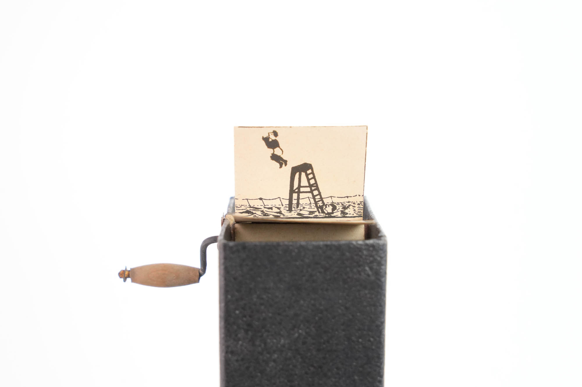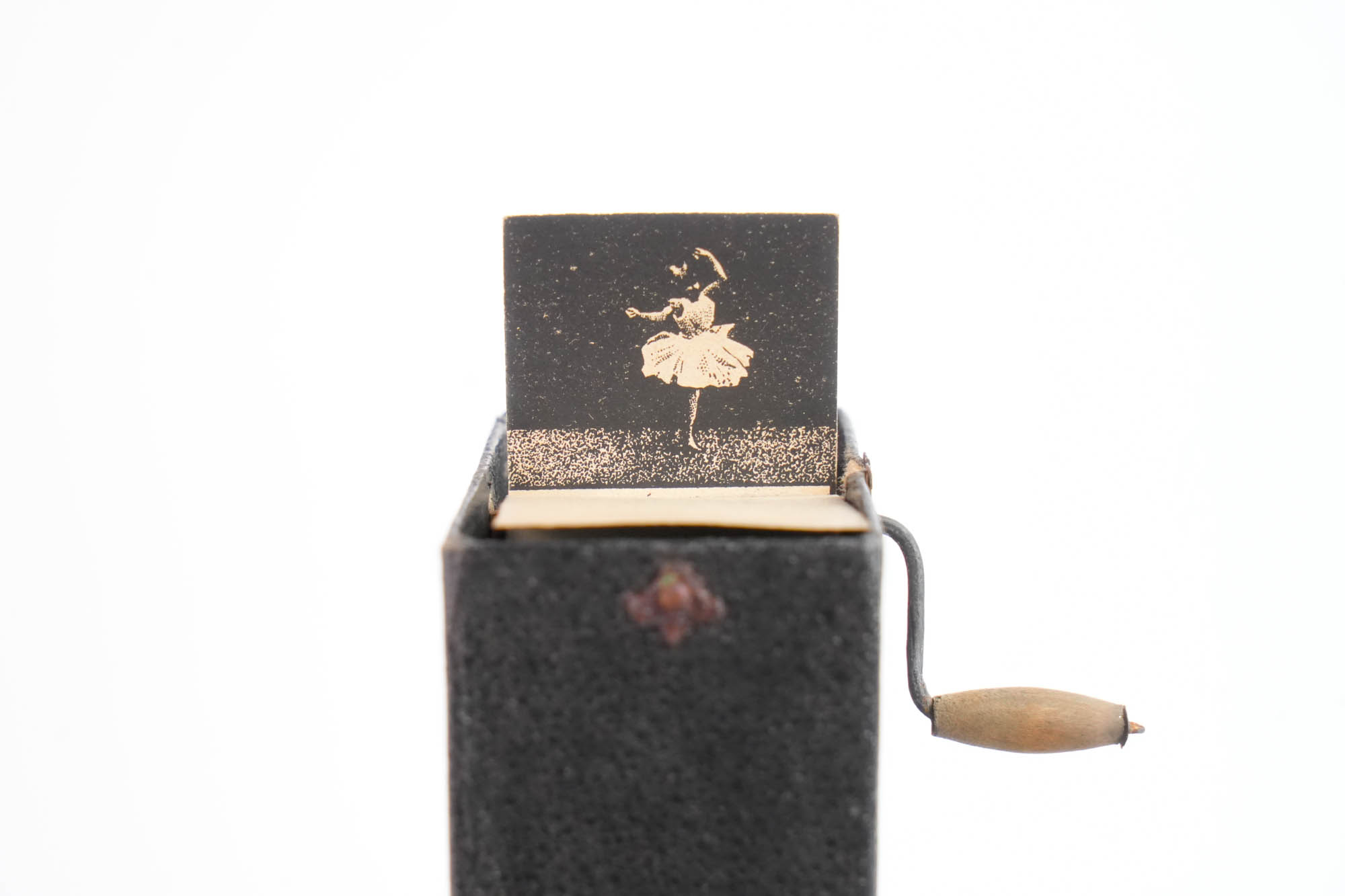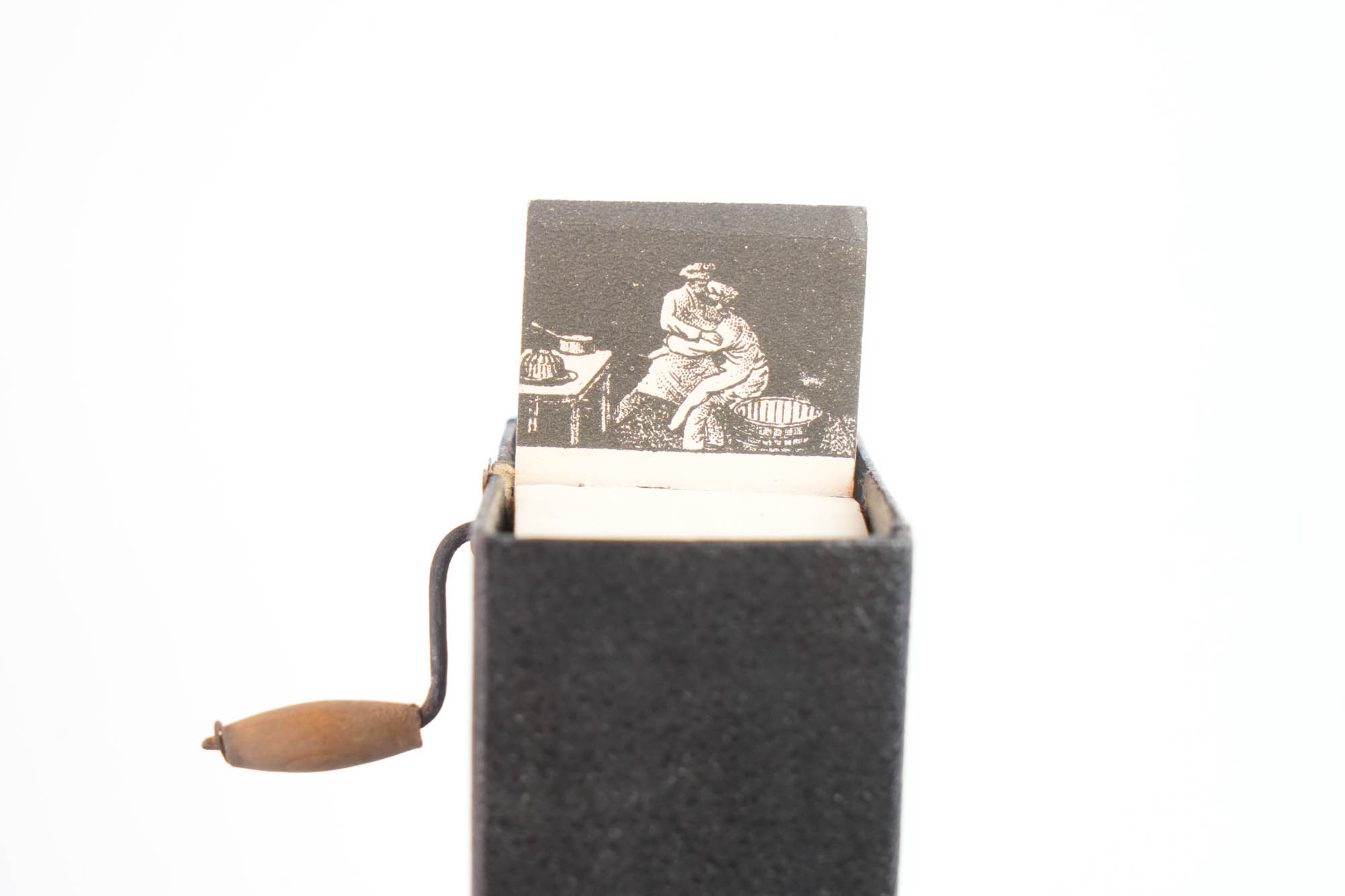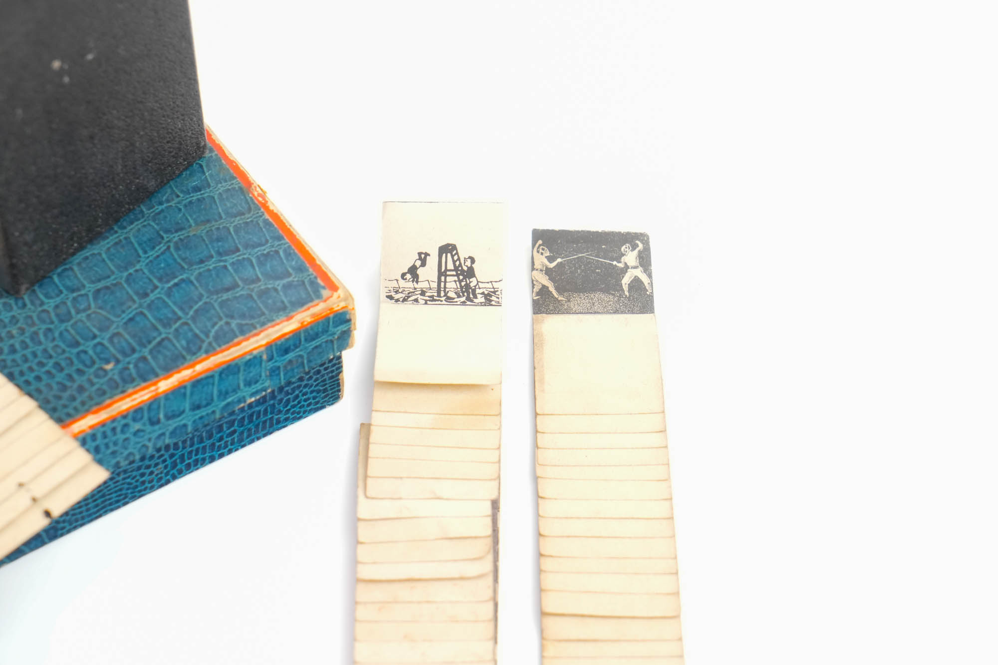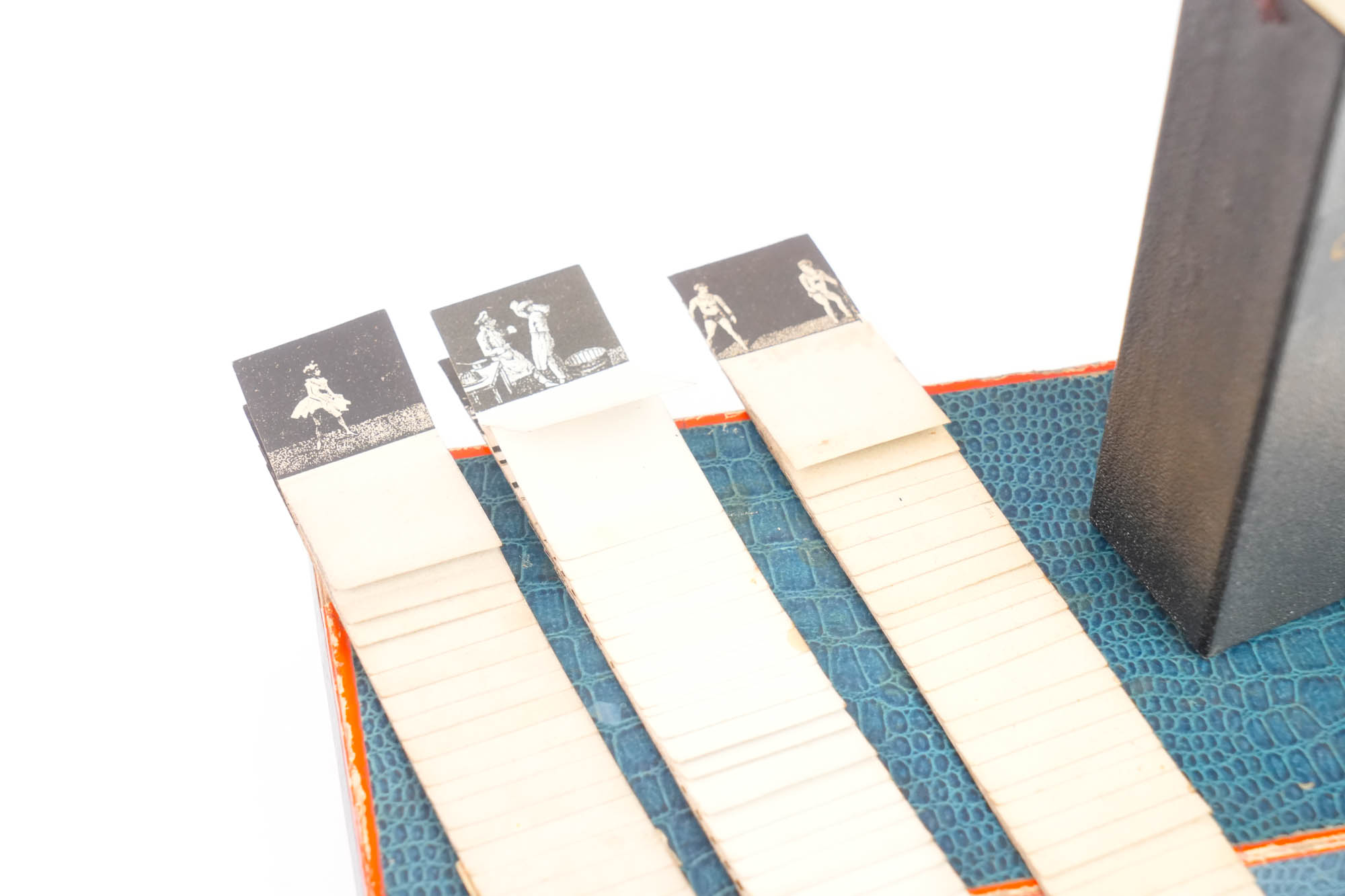 Cinématographe Jouet Déposé. Une telle invention reçut la médaille d'or au concours Lépine 1920. Ensemble complet de son armature, sa boule de lestage et cinq bandes de scénettes animées, le tout se renfermant dans une boite en carton d'origine.  À l'intérieur du couvercle de la boite se trouve contrecollée une instruction d'emploi. Exemplaire complet et en bel état. La boîte mesure 14 x 26 cm.