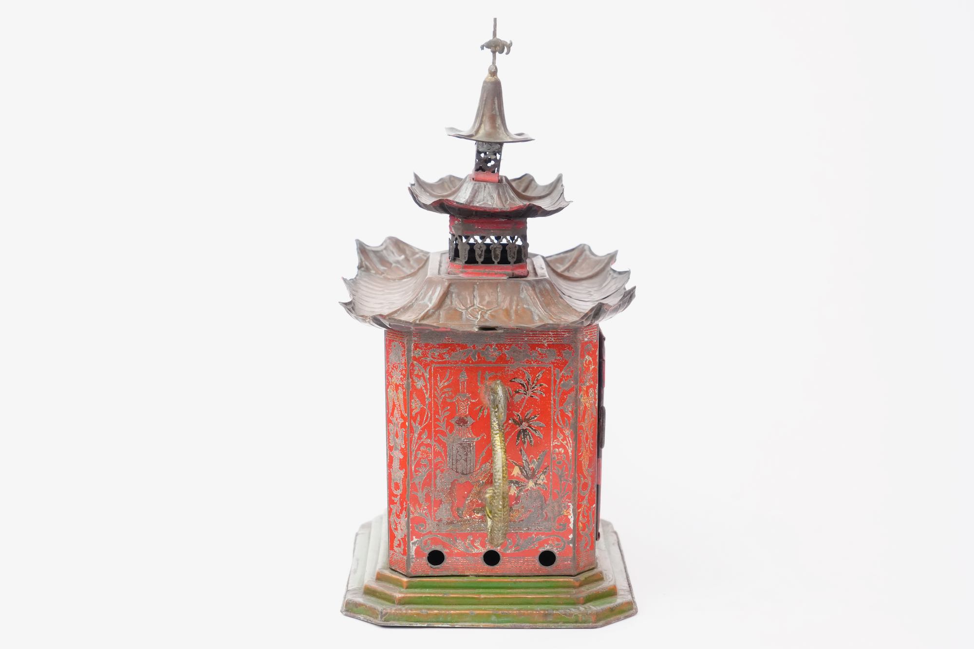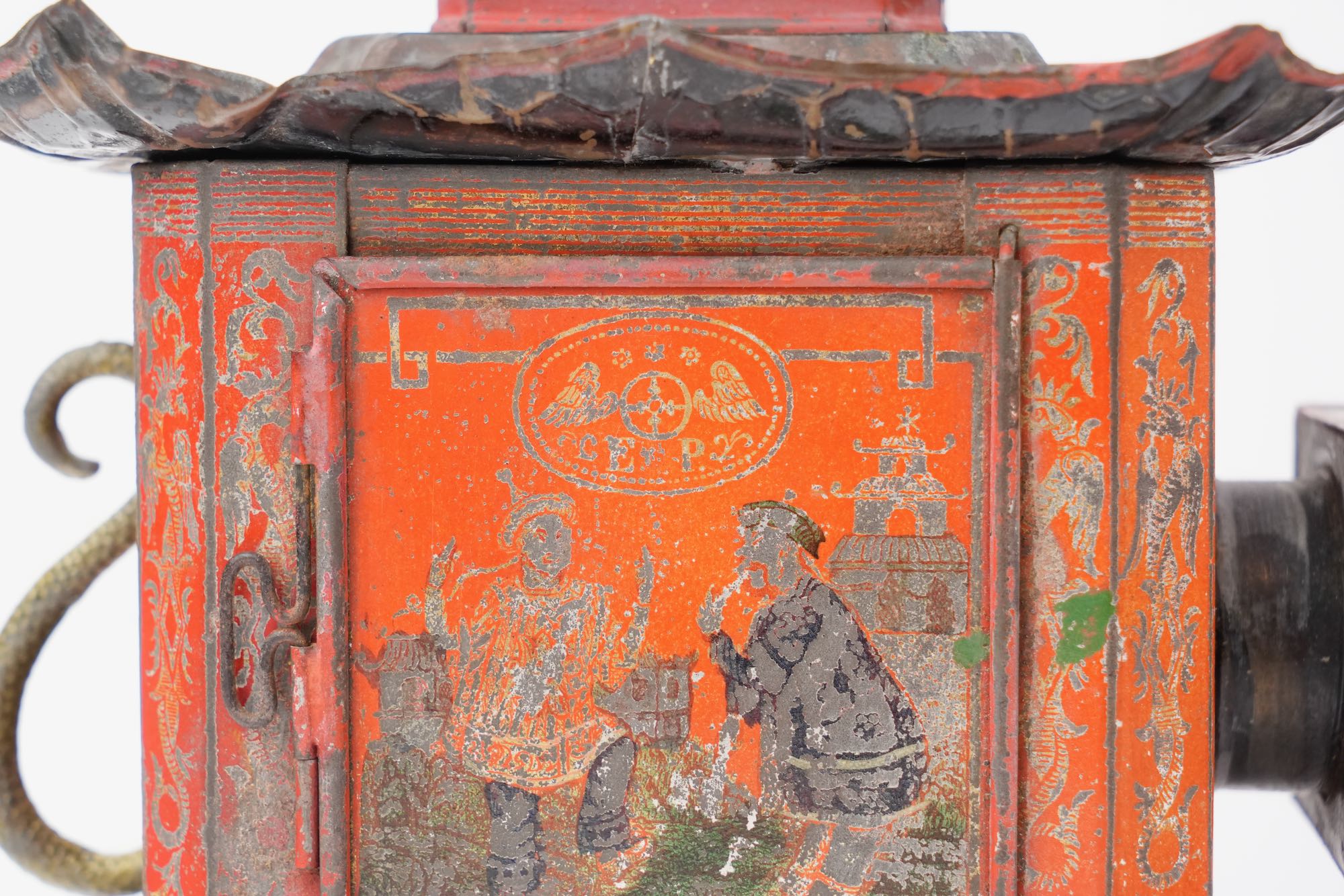<p data-start="0" data-end="558" data-is-last-node="" data-is-only-node="">Lanterne magique dite « La Pagode », fabriquée par Ernst Plank à Nuremberg à la fin du XIXᵉ siècle ; lanterne en tôle peinte, au socle vert et au corps à quatre faces rouges ornées de décors d’inspiration chinoise représentant personnages, architectures et motifs végétaux, tandis que la superstructure à toits superposés évoque la forme d’une pagode, reflet du goût européen pour l’exotisme et la chinoiserie ; destinée à l’usage de plaques de verre d’environ 4,5 cm de hauteur ; état de conservation moyen, avec usures et altérations de la polychromie.</p>