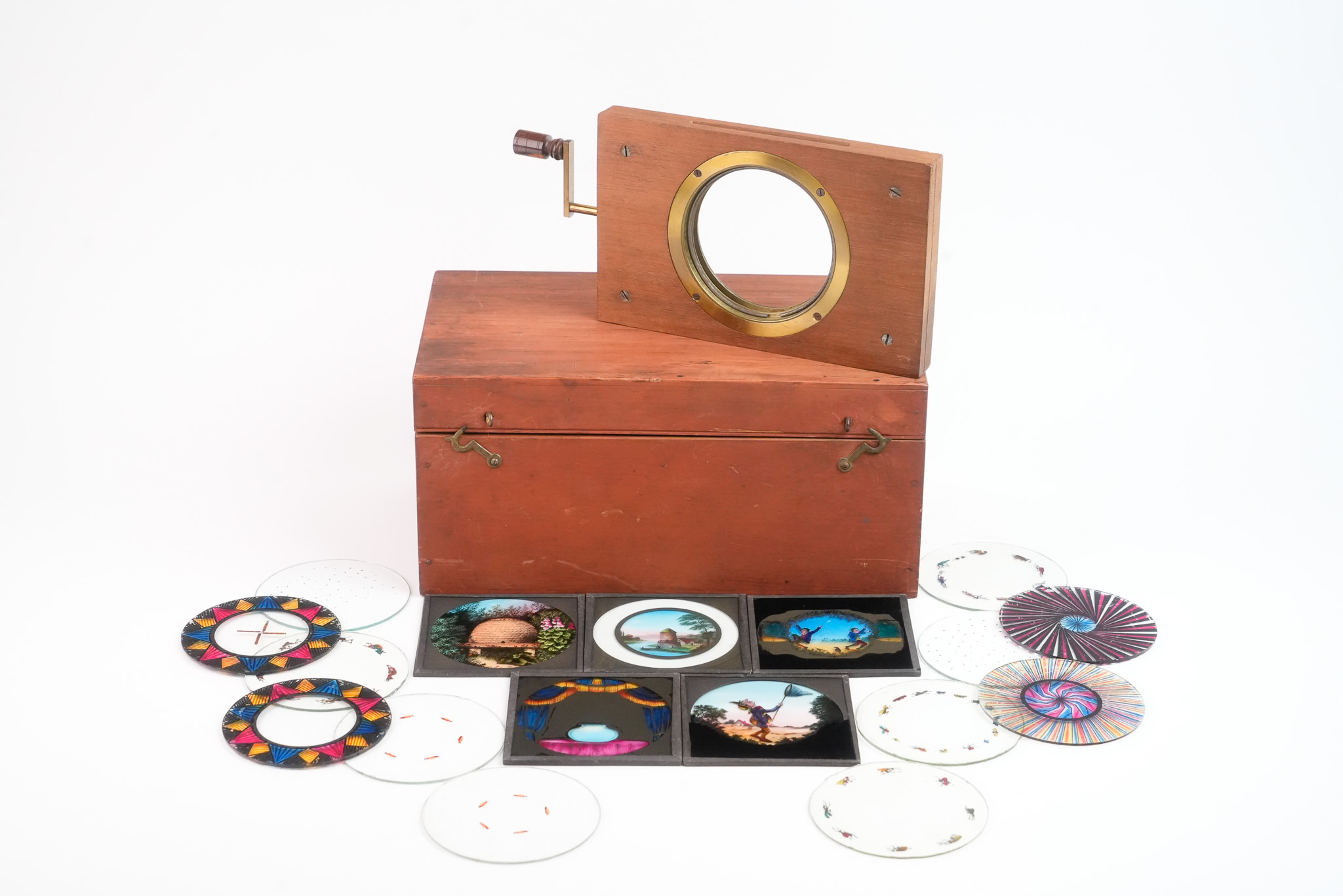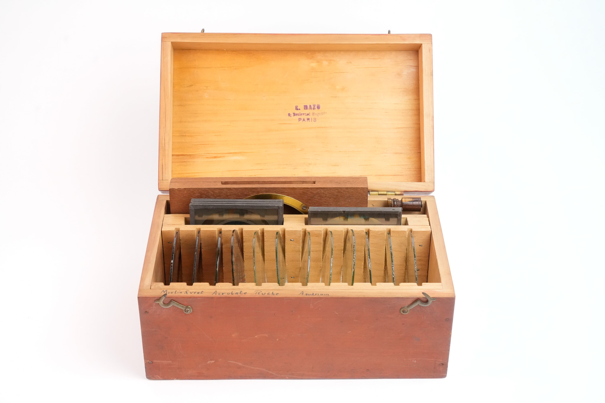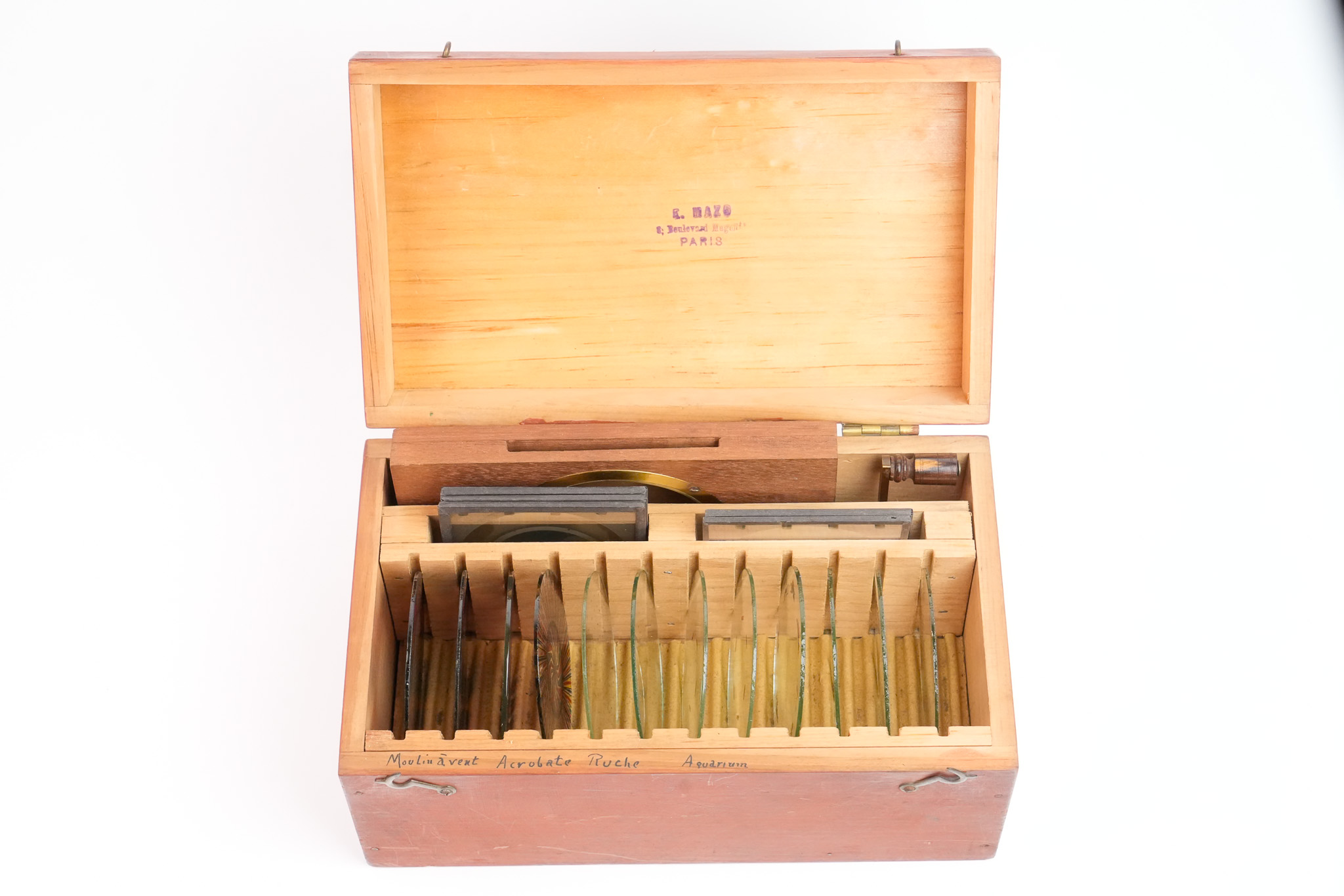 Cette boîte en bois compartimentée renferme un ensemble de plaques de verre destinées à la projection avec une lanterne magique, probablement produite à Paris à la fin du XIXe siècle par les établissements Mazo, dont le cachet figure à l’intérieur du couvercle. Elle constitue un ensemble cohérent d’accessoires dédiés aux plaques à combinaisons, dispositif spectaculaire reposant sur la superposition ou la rotation de plusieurs éléments peints afin de créer des effets animés.