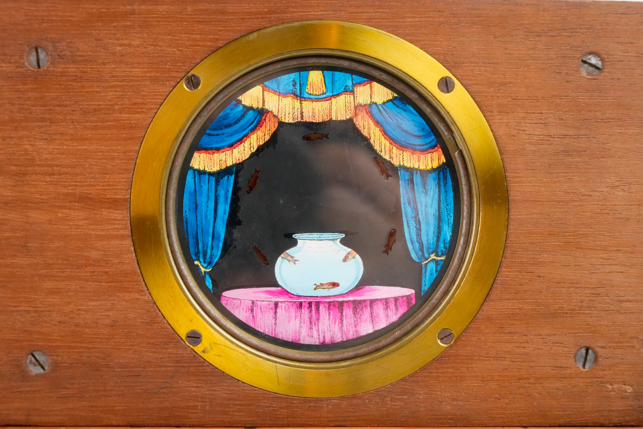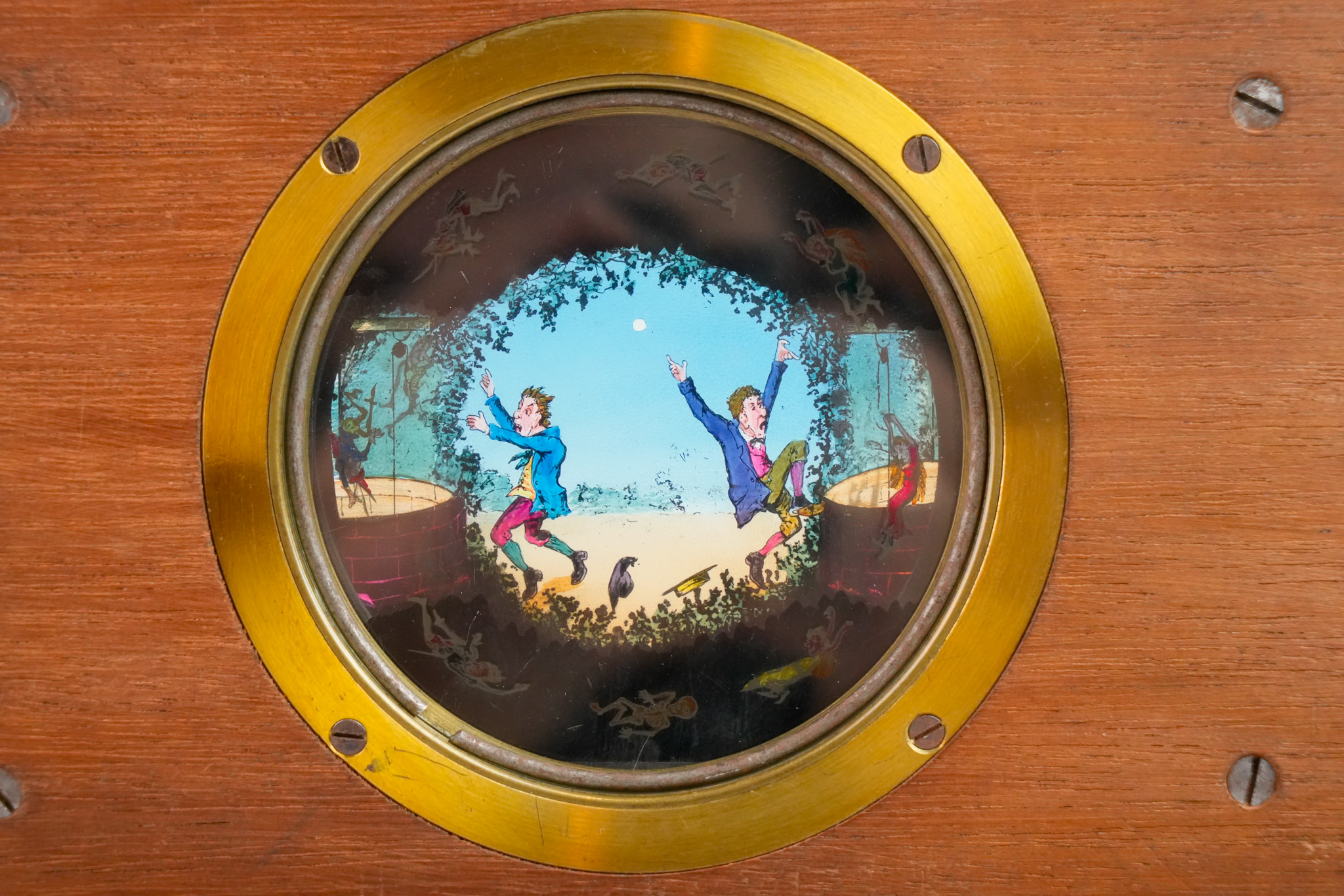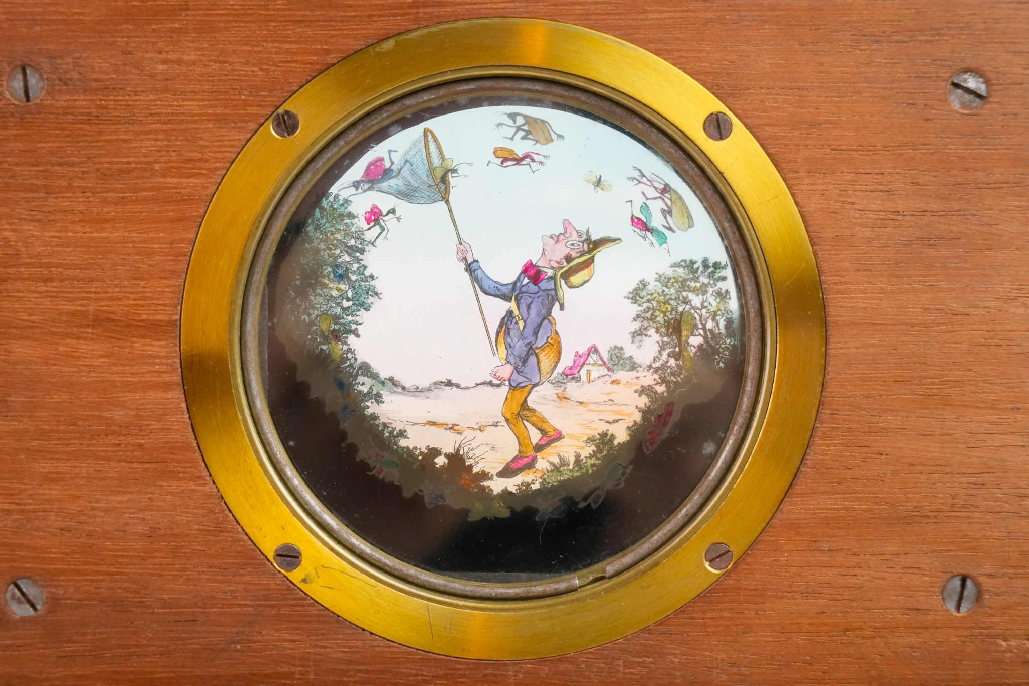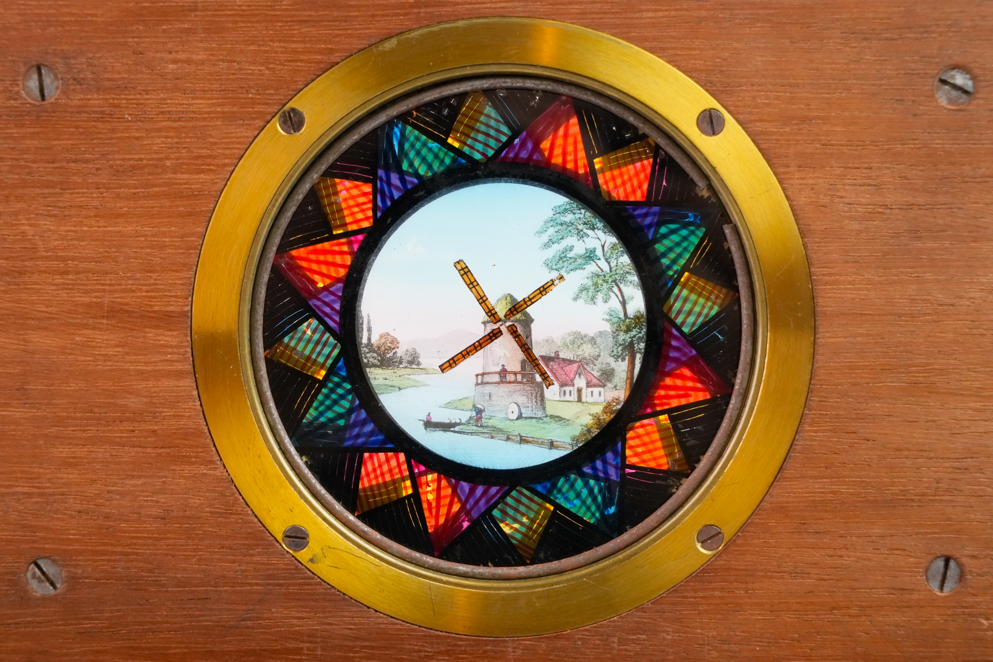 Un mécanisme indépendant permet la mise en rotation manuelle de certaines plaques circulaires grâce à une manivelle, transformant l’image fixe en un spectacle dynamique. Le moulin, la ruche, l'aquarium, l'entomologiste, personnages effrayés, Kaleidocope. Soit une seule plaque pour 5 décors.