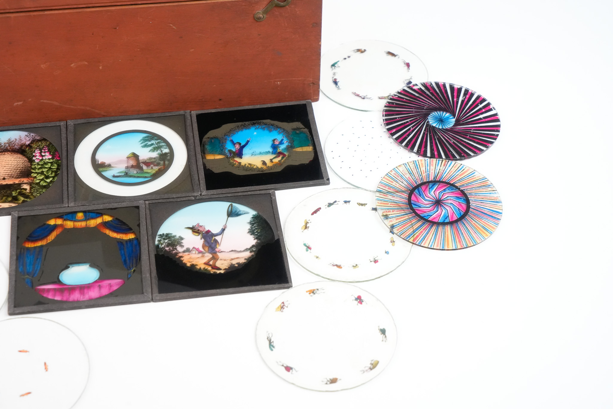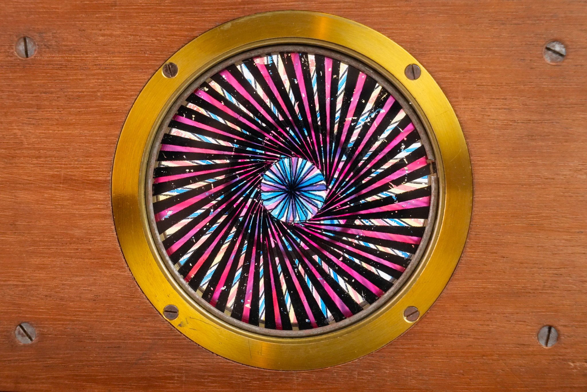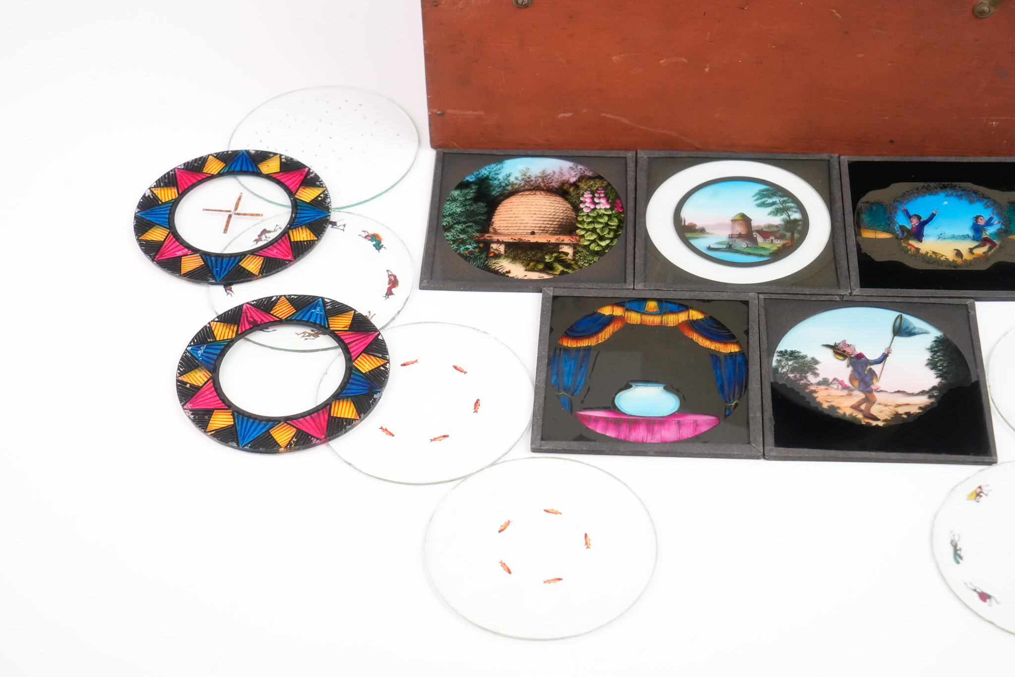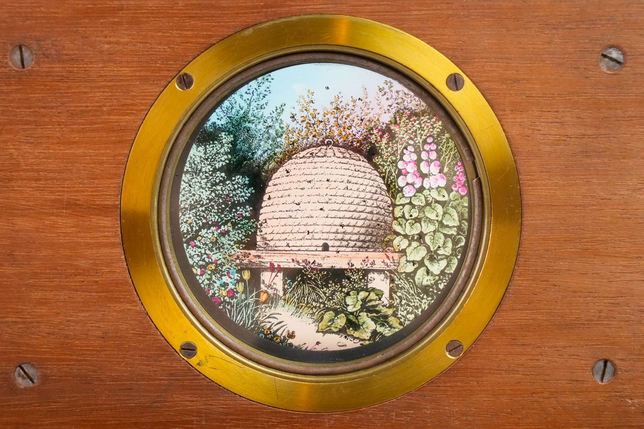 Un mécanisme indépendant permet la mise en rotation manuelle de certaines plaques circulaires grâce à une manivelle, transformant l’image fixe en un spectacle dynamique. Le moulin, la ruche, l'aquarium, l'entomologiste, personnages effrayés, Kaleidocope. Soit une seule plaque pour 5 décors.