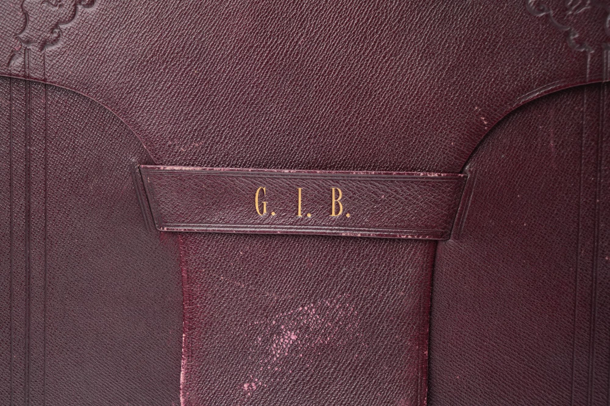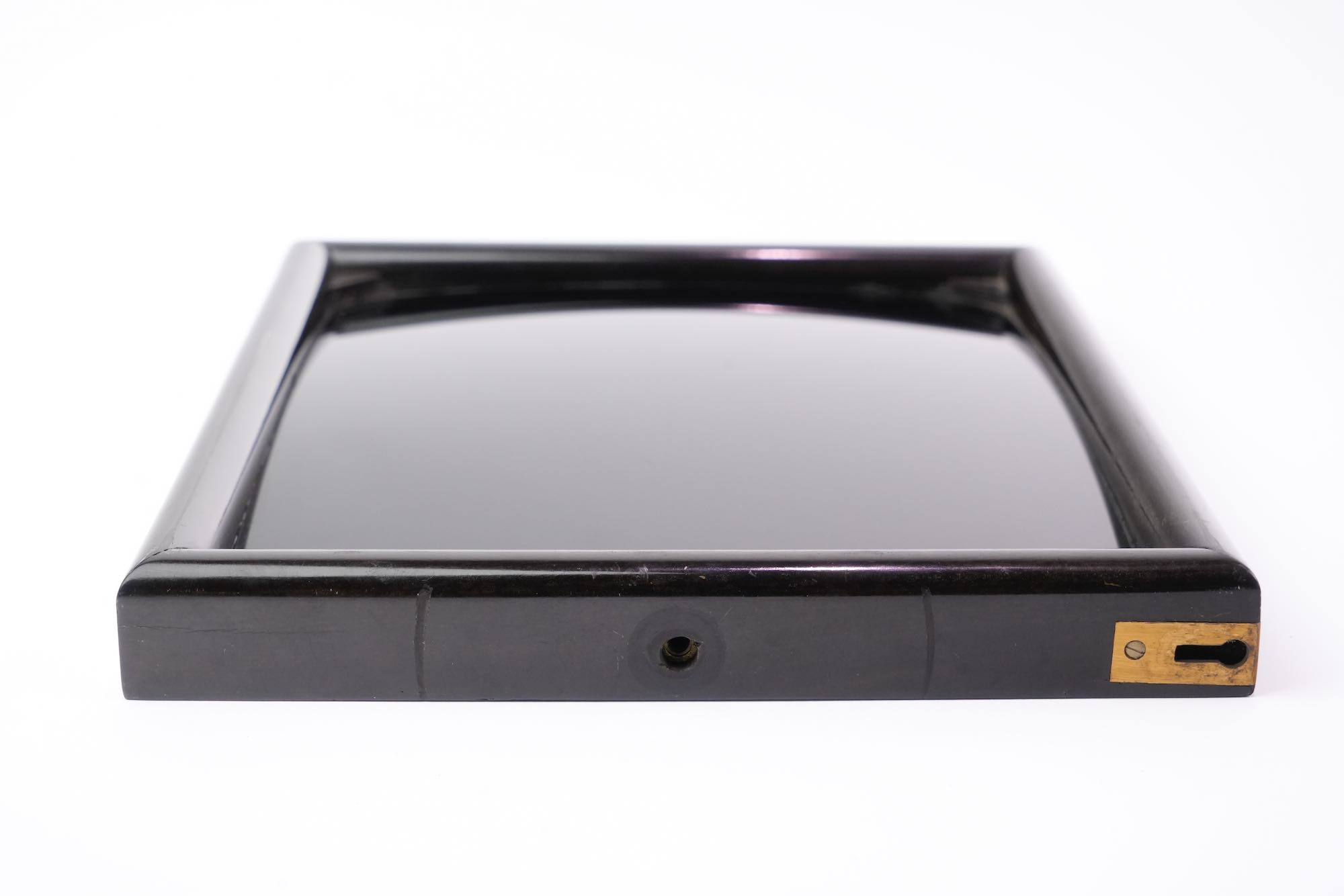 Miroir noir aussi appelé "miroir Lorrain" ou "miroir de Claude" du nom du peintre Claude Gelée (1602-1682) surnommé "Le Lorrain". Il s'agit d'un miroir convexe noir dont se servaient les peintres pour émuler le style de Gelée et décomposer leur tableau selon des nuances dégradées et des couleurs douces. La propriété optique de ce type de miroir convexe a aussi pour particularité de faire figurer le sujet principal comme isolé de son environnement. Franchement exceptionnel dans ces dimensions : 18 x 24 cm. Il vient dans un étui de maroquin bordeaux avec initiales dorées G.I.B.