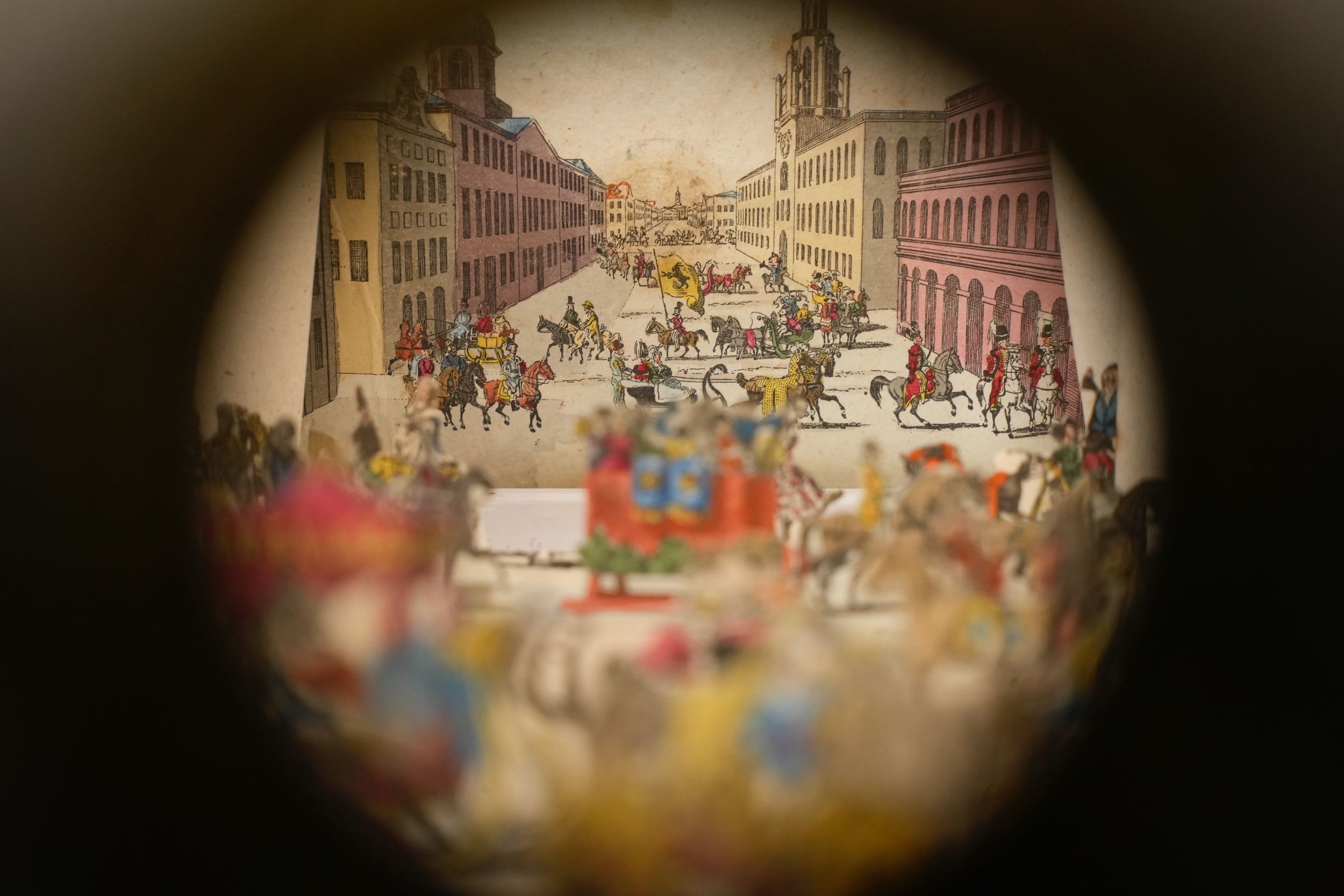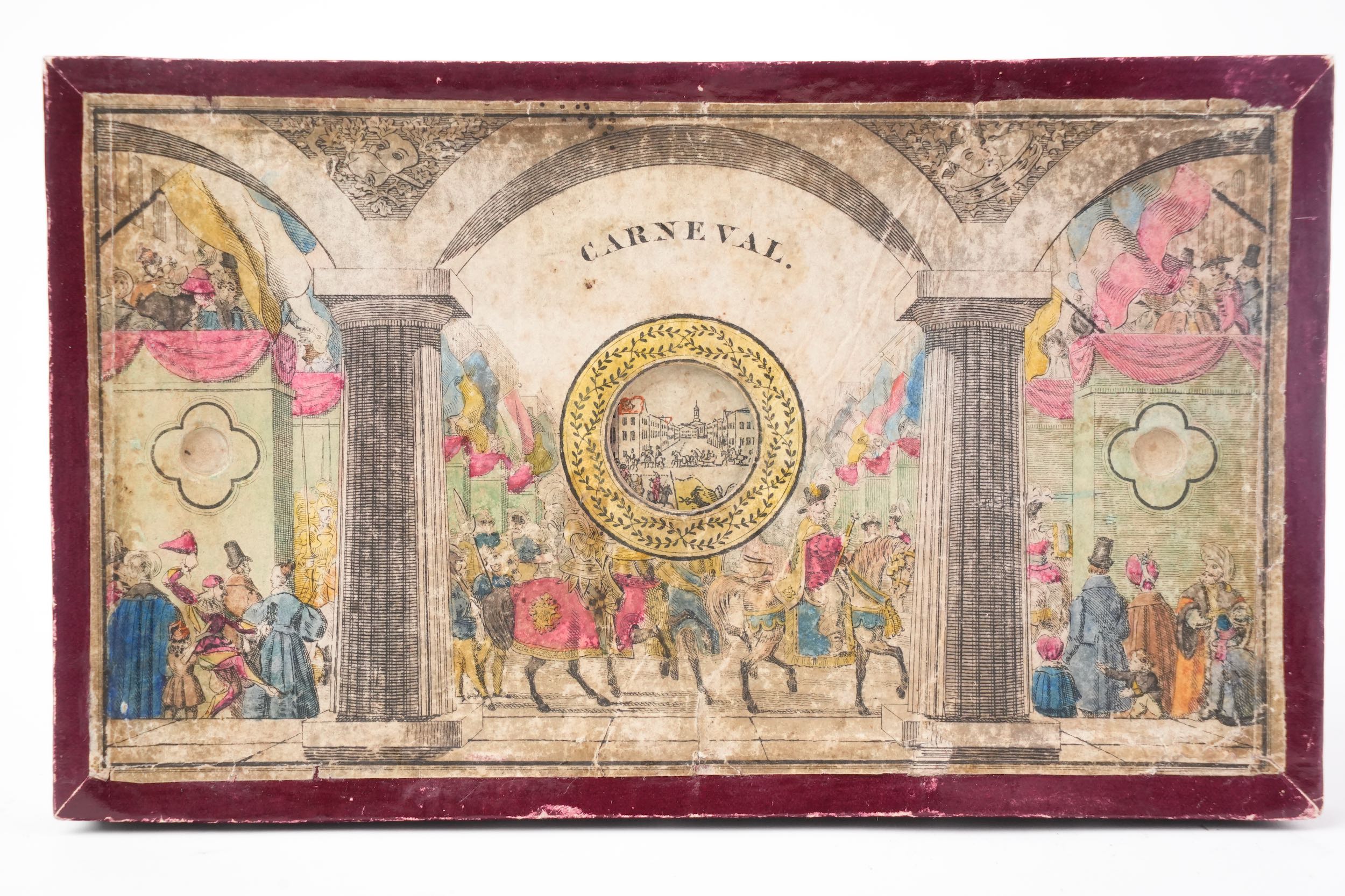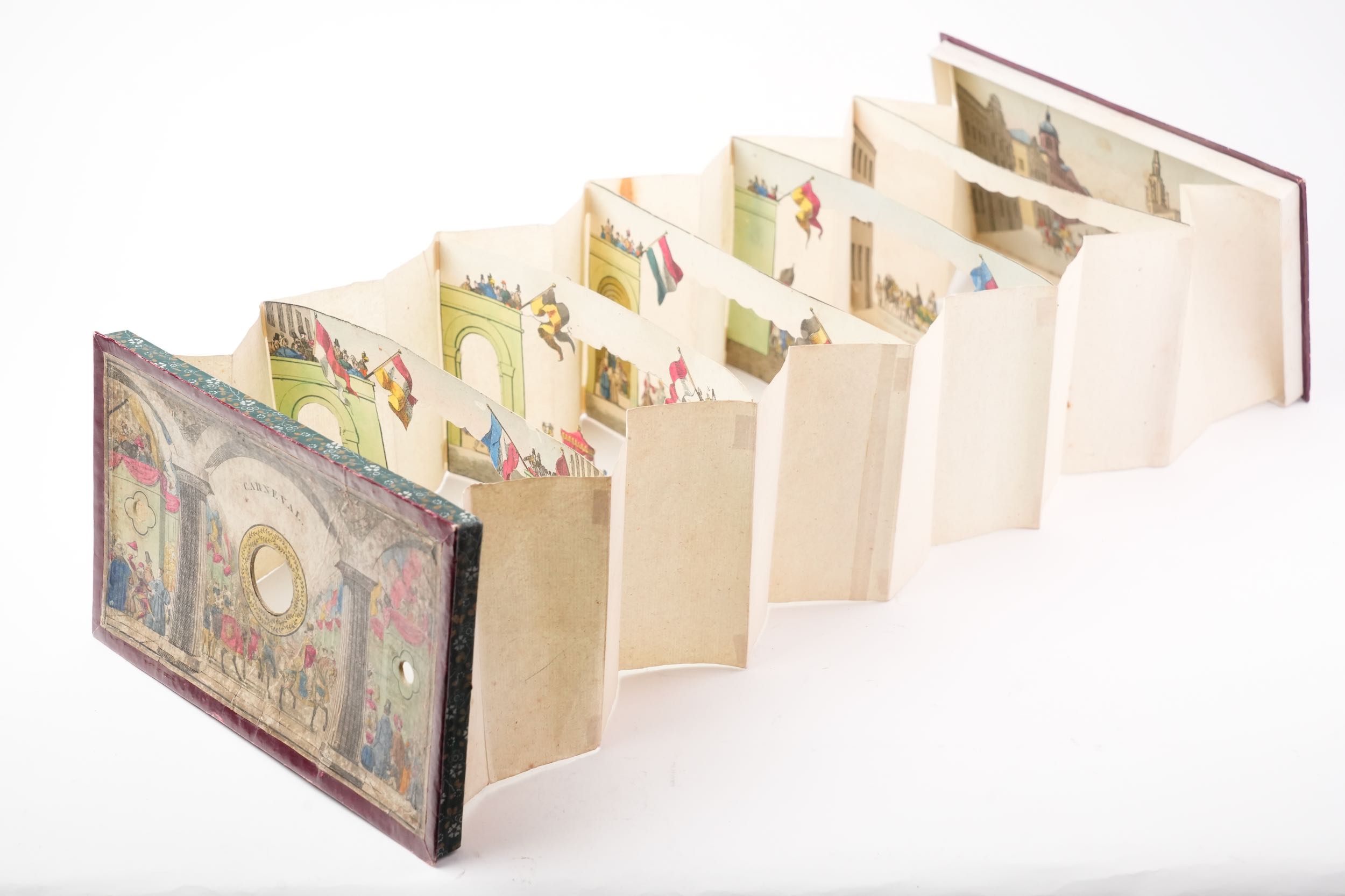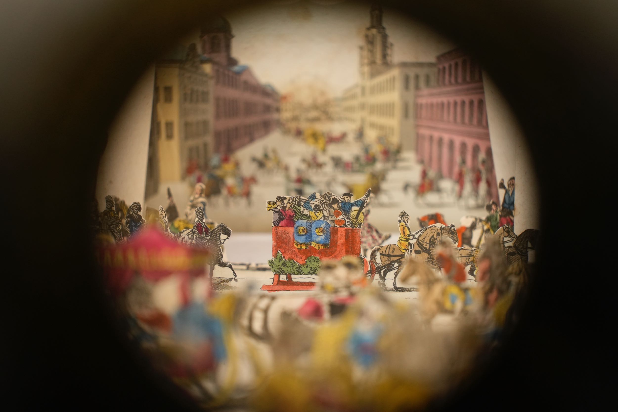 Peep show en accordéon (ou optique de papier), constitué de 6 plans découpés et coloriés à la main, figurant une procession carnavalesque à travers une ville bordée de bâtiments classiques.