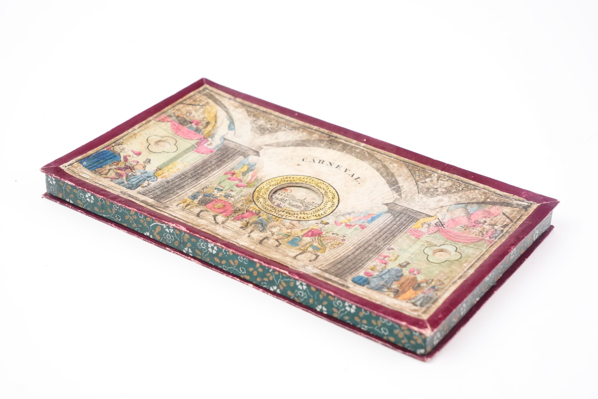 Boîte cartonnée recouverte de papier marbré et encadrement de papier rouge, avec sur la façade une gravure coloriée représentant des spectateurs sous des arcades. Au centre, une ouverture circulaire garnie d’un anneau doré permet la vision en profondeur de la scène.
