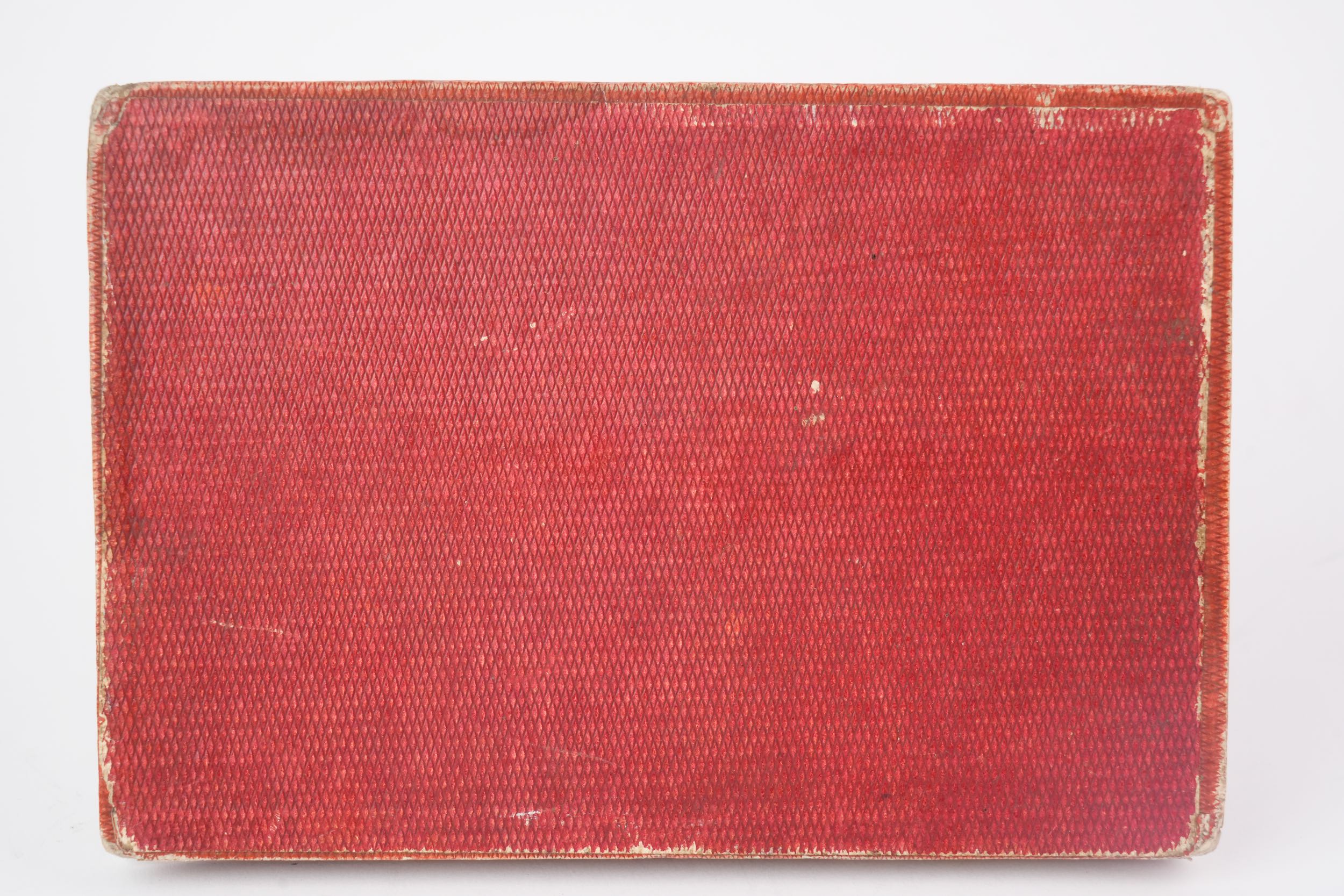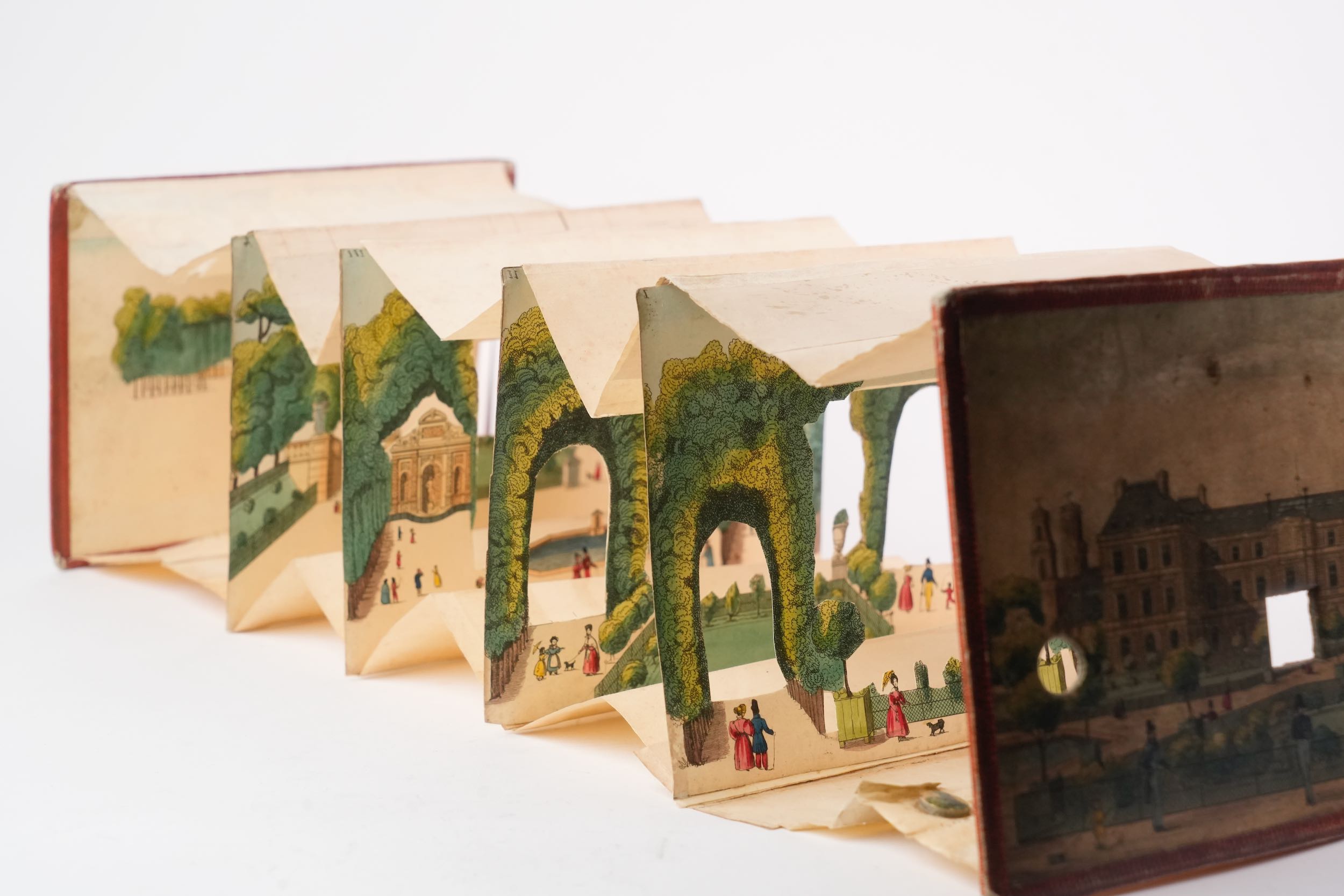Boîte-scène pliable en accordéon, [dimensions à préciser], cartonnage recouvert de papier colorié à la main, encadrement de tissu rouge.