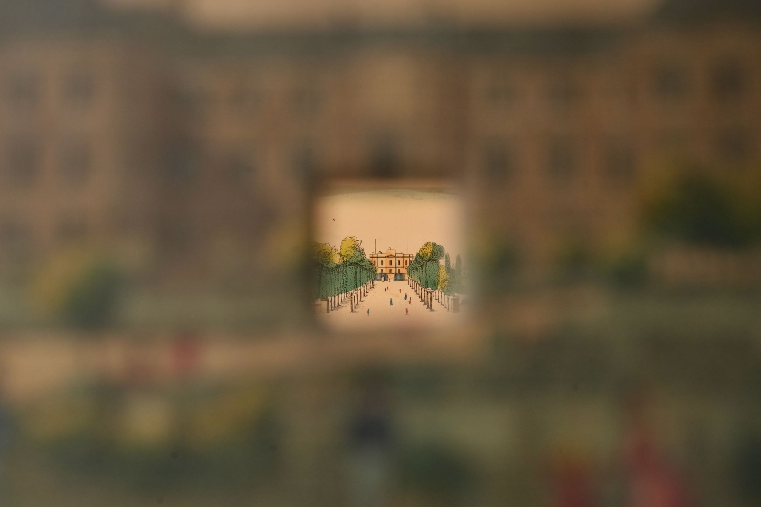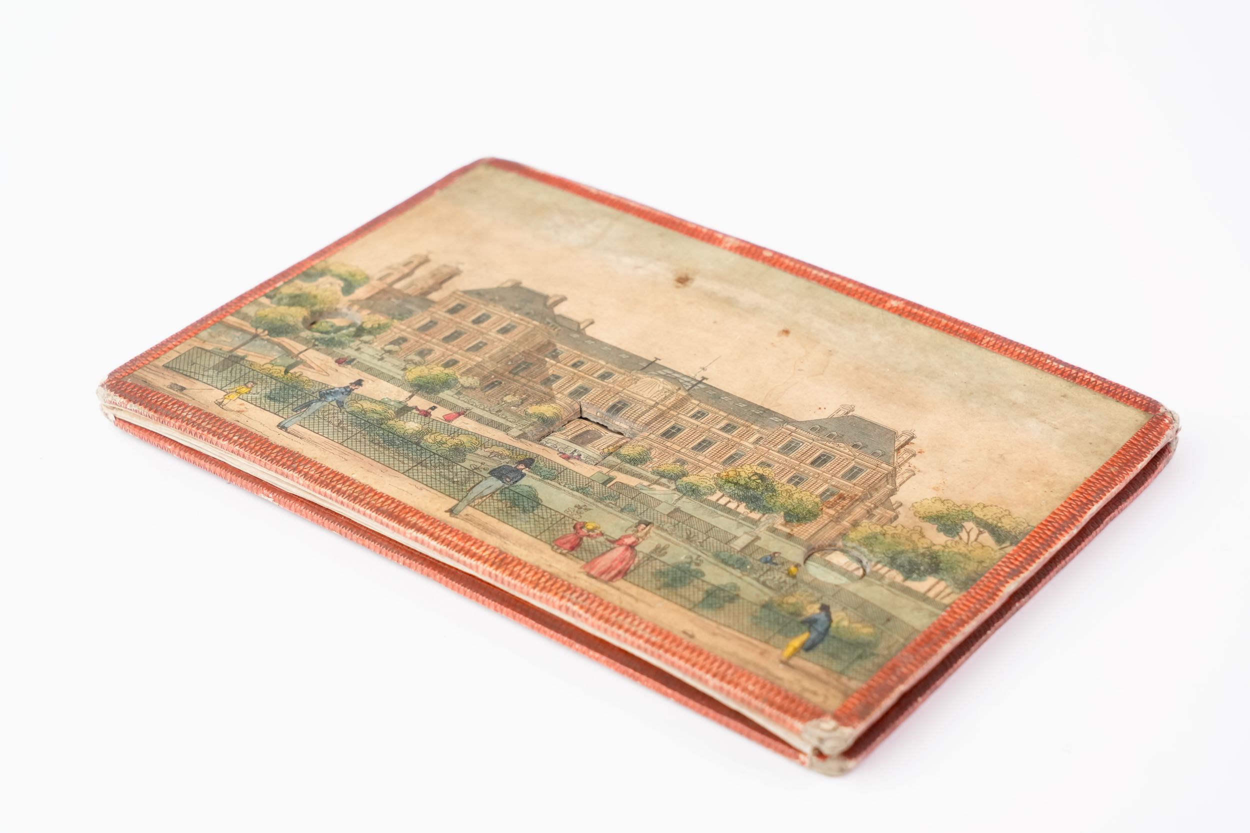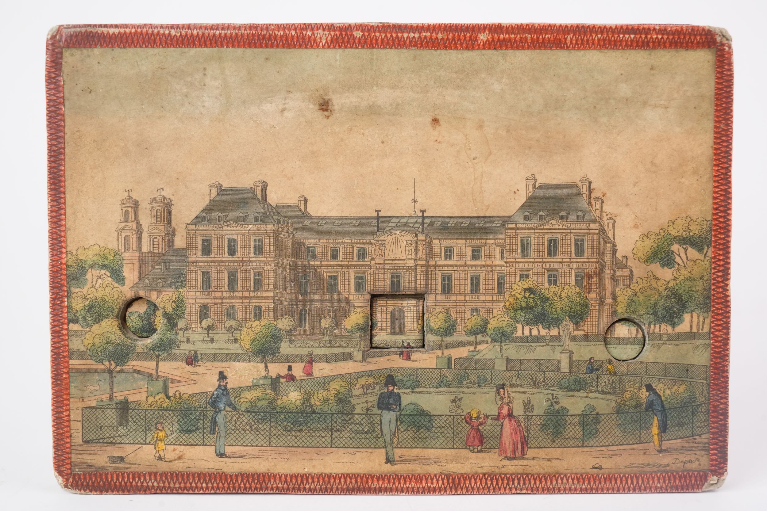Charmant théâtre optique figurant une vue animée des jardins du Luxembourg, reconnaissables à la façade du Palais du Luxembourg représentée sur le panneau avant. Le décor intérieur, composé de plusieurs plans découpés et soigneusement colorés, restitue la promenade élégante d’un public dans les allées du jardin, entre bassins, bosquets et fabriques. On distingue des couples flânant, des enfants jouant et diverses scènes de sociabilité urbaine sous la Monarchie de Juillet.