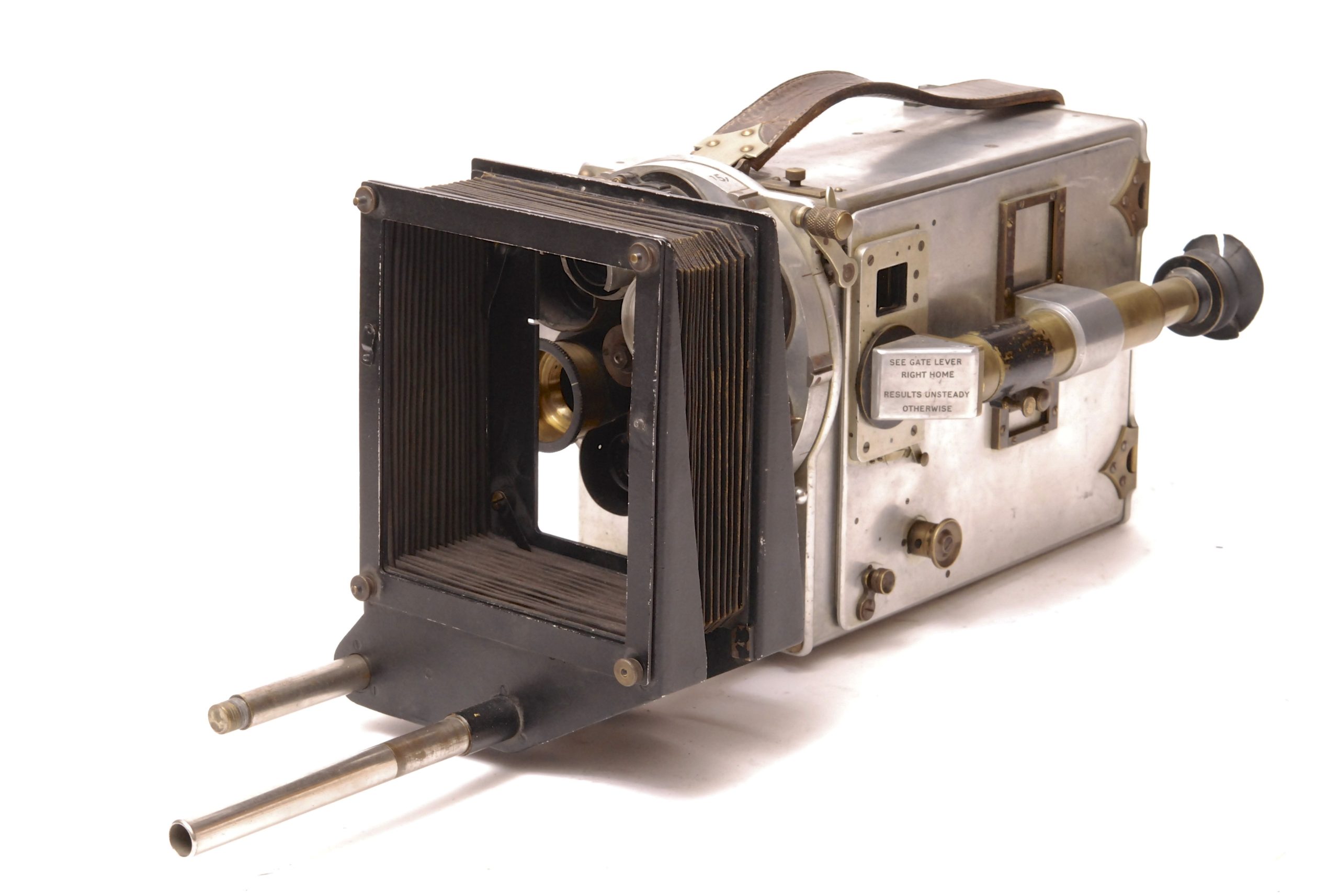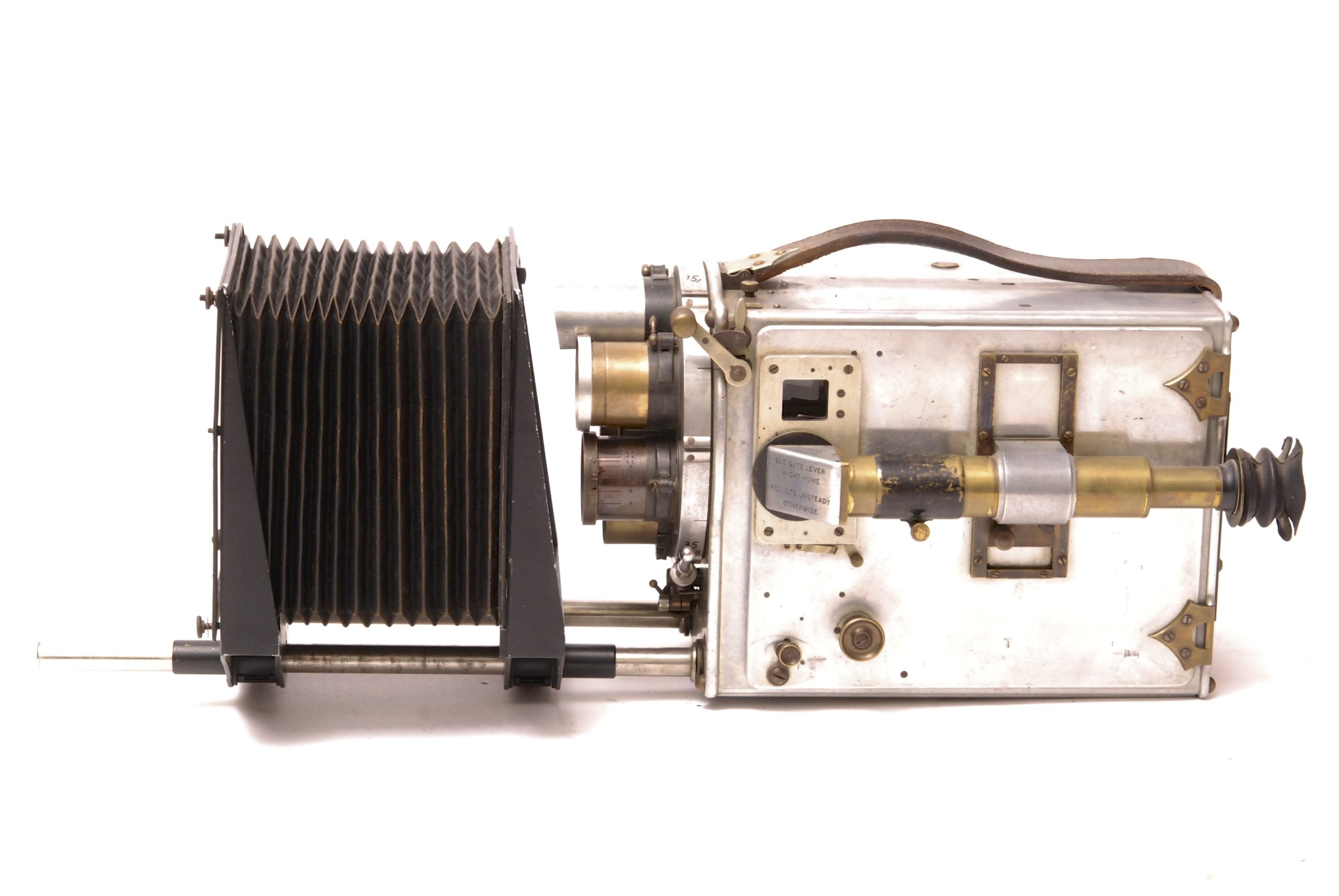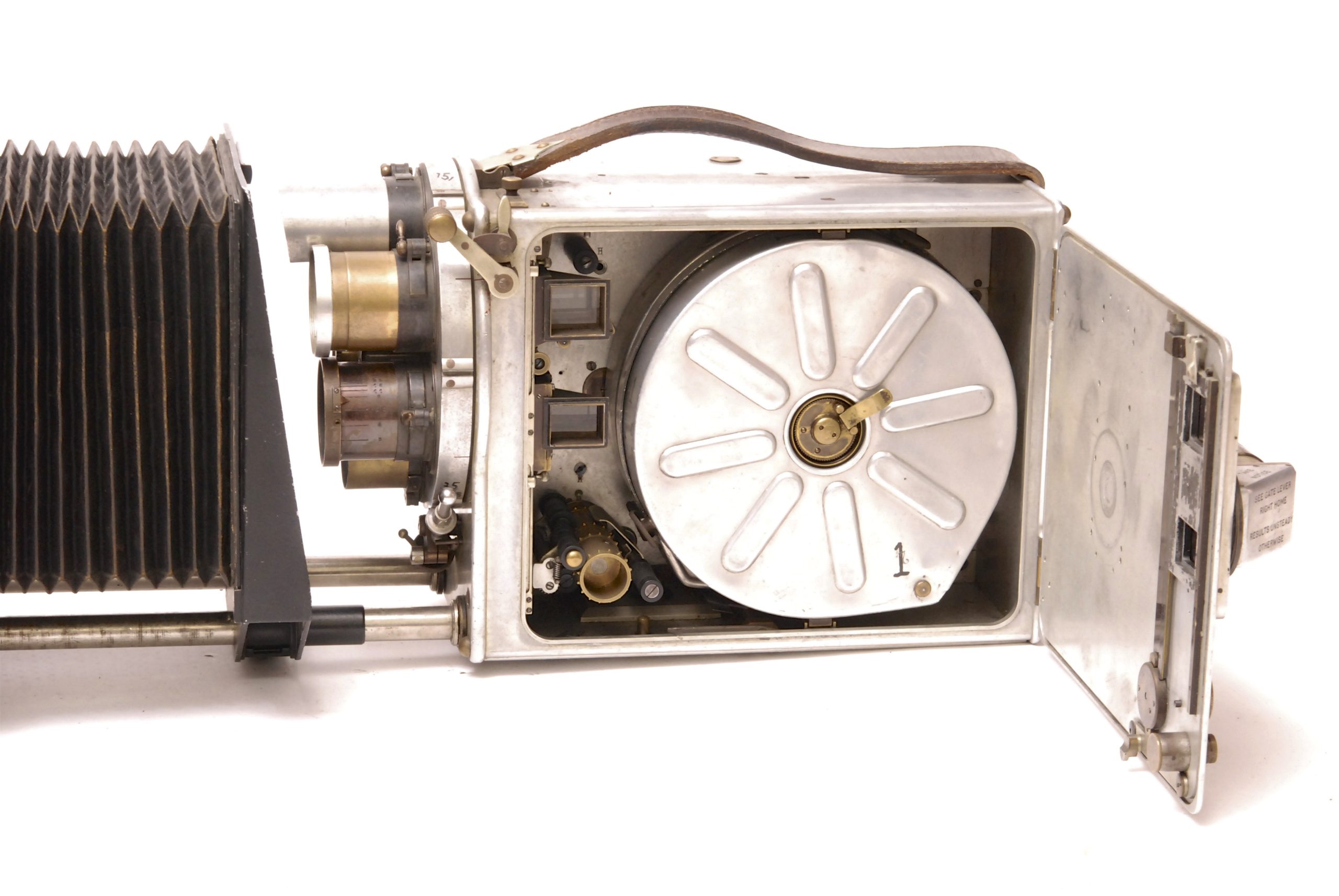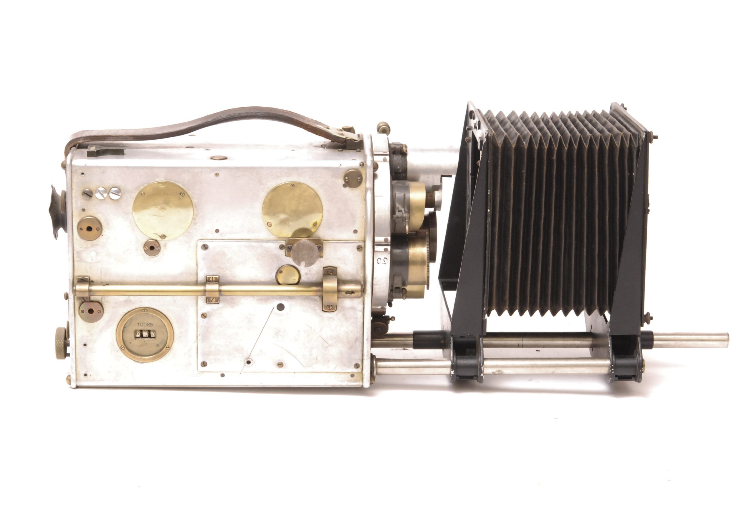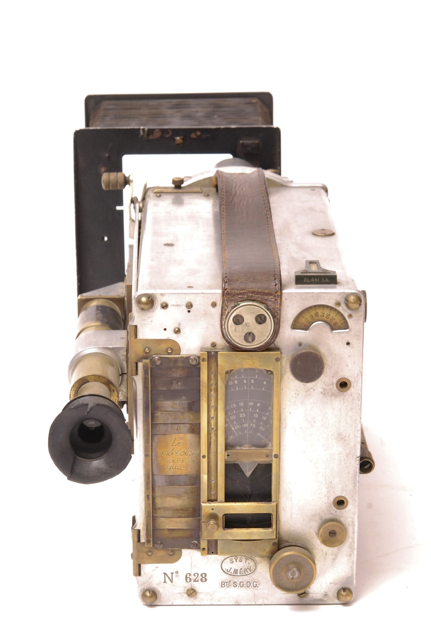 LE CAMÉRÉCLAIR de 1928 est un appareil de prise de vues pour les Professionnels. Il est doté du Système MERY, Breveté S.G.D.G. Possibilité d’utiliser des objectifs de foyers différents par rotation du disque qui les supporte. La caméra est décrite précisément par la Cinémathèque Française : "entraînement du film 35 mm par deux griffes et deux griffes de fixité ; presseur intermittent ; roue excentrique et rampe hélicoïdale ; deux débiteurs dentés ; deux magasins intérieurs pour 120 mètres de film ; tourelle rotative à six objectifs ; viseur ; compteur d'images ; compteur métrique ; compteur de tours ; obturateur réglable ; poinçon pour pellicule ; viseur clair avec hausse à trois trous ; une fenêtre en bas pour l'impression et mise au point par dépoli ou sur pellicule, une fenêtre en haut pour la mise au point par viseur à loupe, dépoli ou sur pellicule ; loupe de visée fixée sur la porte ; dispositif pour fondu automatique et prise de vue image par image ; poignée cuir ; au dos, cadran de distances pour mise au point ; porte-caches intérieur pour trucage ; caisson aluminium, polie et vernie au four".  Dimensions : l=36 cm-l=27 cm-H=27 cm. Le modèle que nous présentons comporte en plus son compendium originel. Remarque importante : Cette camera fait partie d'un lot de trois appareils provenant tous de la célèbre maison de films espagnole "Sevilla Film Sudios" située à l'époque près de Madrid (en 1955, il y fut tourné avec Orson Welles le film "Mr. Arkadin a.k.a. Confidentiel Report". Plus d'informations sur le site http://historias-matritenses.blogspot.fr/2012/04/los-estudios-de-cine-y-sus-jardines-ii.html  -  Ensemble en bel état.