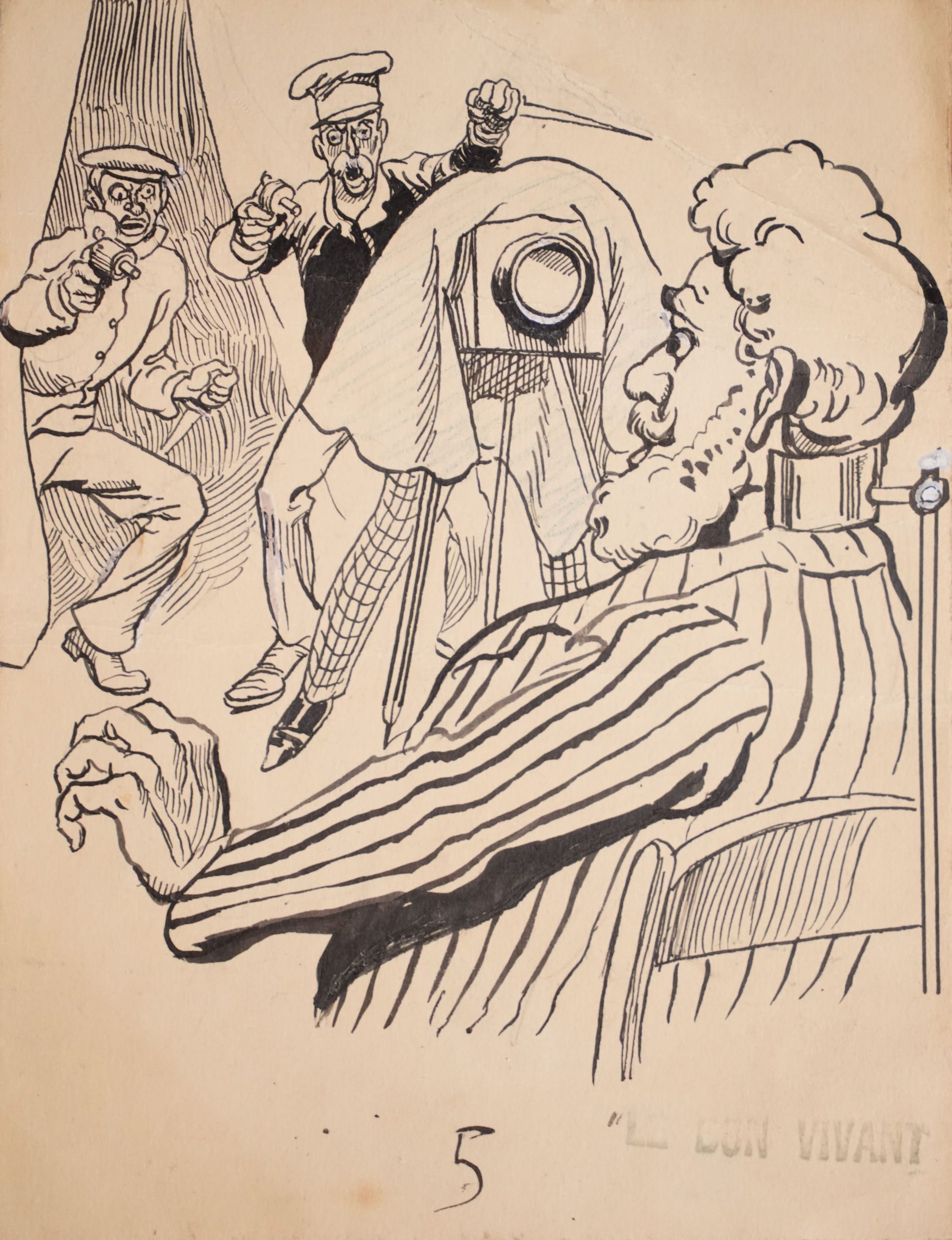 <p data-start="174" data-end="959">Cette scène humoristique, probablement destinée à la presse satirique ou à un périodique illustré du tournant du XXᵉ siècle, met en scène un photographe et ses modèles dans une situation burlesque : deux personnages gesticulants, peut-être marins ou artisans, interrompent la séance alors qu’un homme barbu prend la pose. Le trait nerveux et expressif, l’accent mis sur la gestuelle et les visages outrés évoquent la veine caricaturale populaire de la Belle Époque, telle qu’on la retrouvait dans les journaux humoristiques comme <em data-start="704" data-end="713">Le Rire</em>, <em data-start="715" data-end="729">Le Charivari</em> ou <em data-start="733" data-end="748">Le Bon Vivant</em> — ce dernier titre étant ici indiqué au tampon. Le dessin témoigne du regard ironique porté sur la photographie, art encore jeune et souvent tourné en dérision pour sa solennité et ses contraintes techniques. 14 X 18 cm. A noter, une pliure en haut à gauche. Encre de chine sur papier.</p>