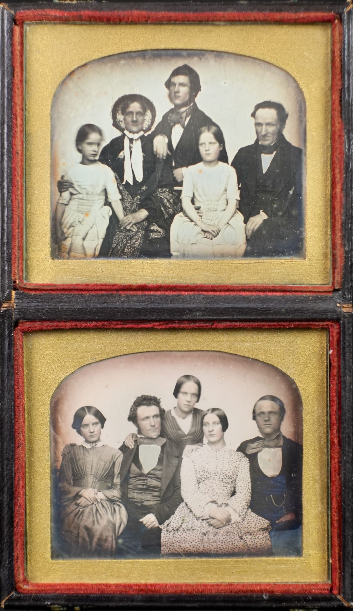 Daguerréotype, seizième de plaque double, vers 1850-1855. Étui pliant en cuir noir contenant deux portraits de groupe, chacun monté sous passe-partout ovale doré et encadré de velours rouge. La première plaque présente une composition familiale de cinq personnes : un couple âgé assis, entouré de trois enfants ou adolescents, disposés de manière symétrique. La seconde plaque montre un autre groupe de cinq individus, probablement apparentés, composé de deux hommes et trois femmes, réunis dans une pose serrée typique des portraits collectifs de petit format.