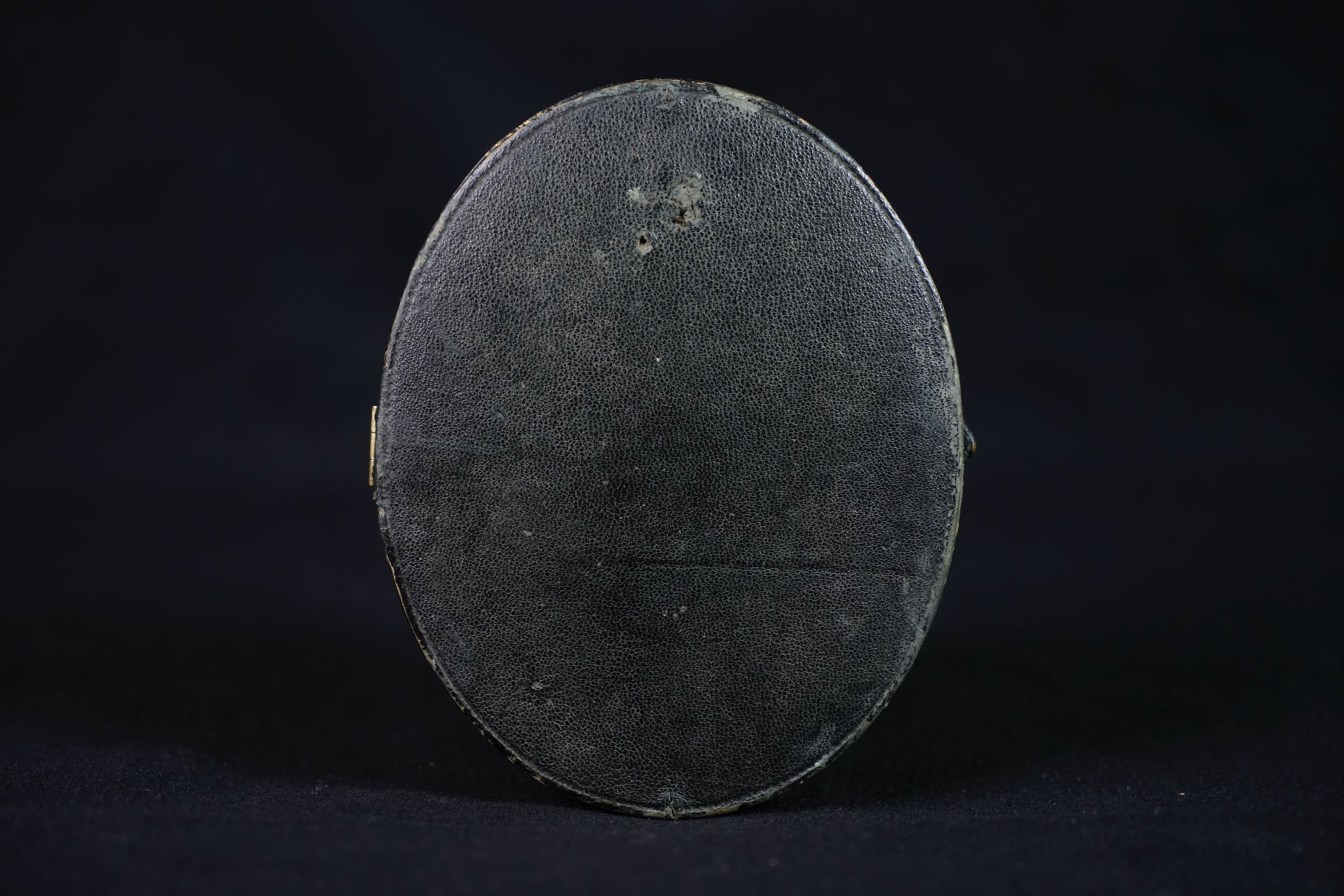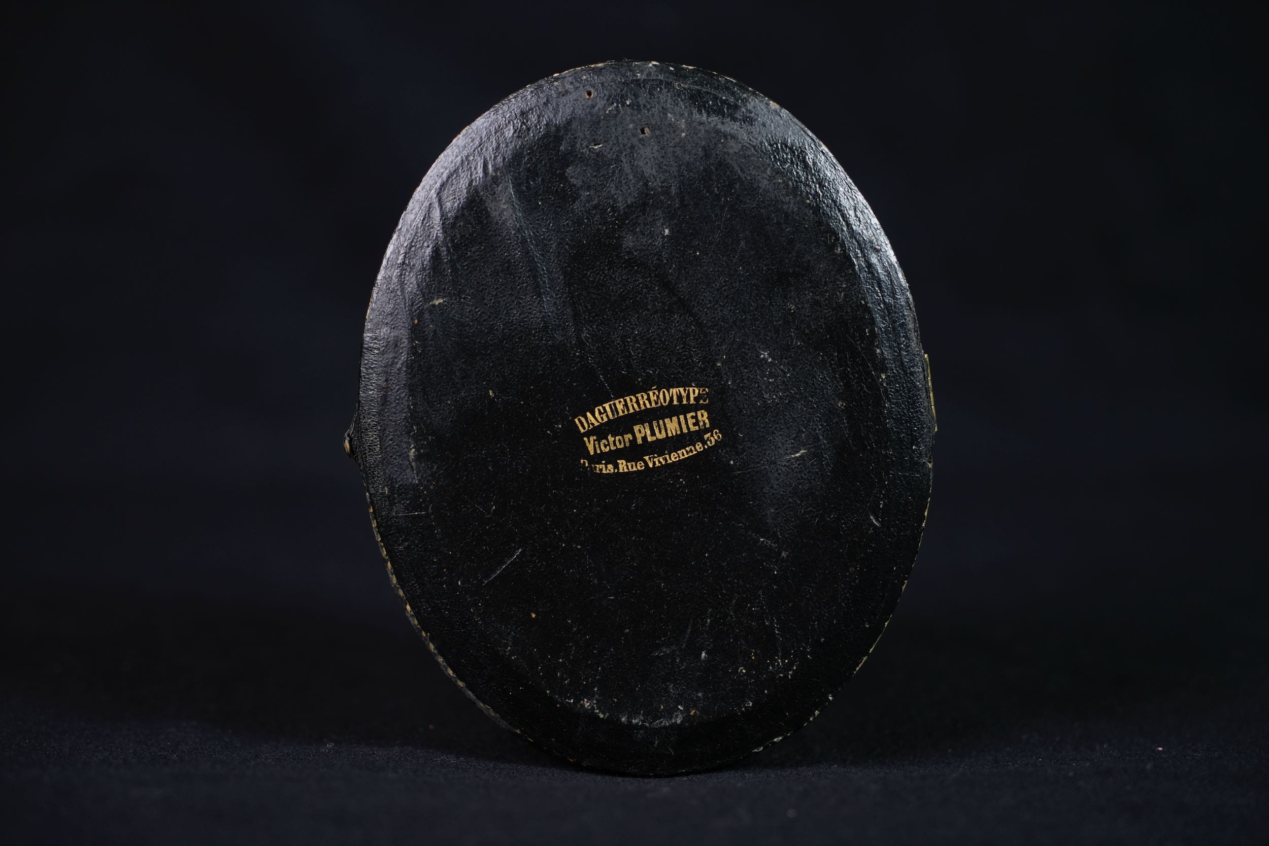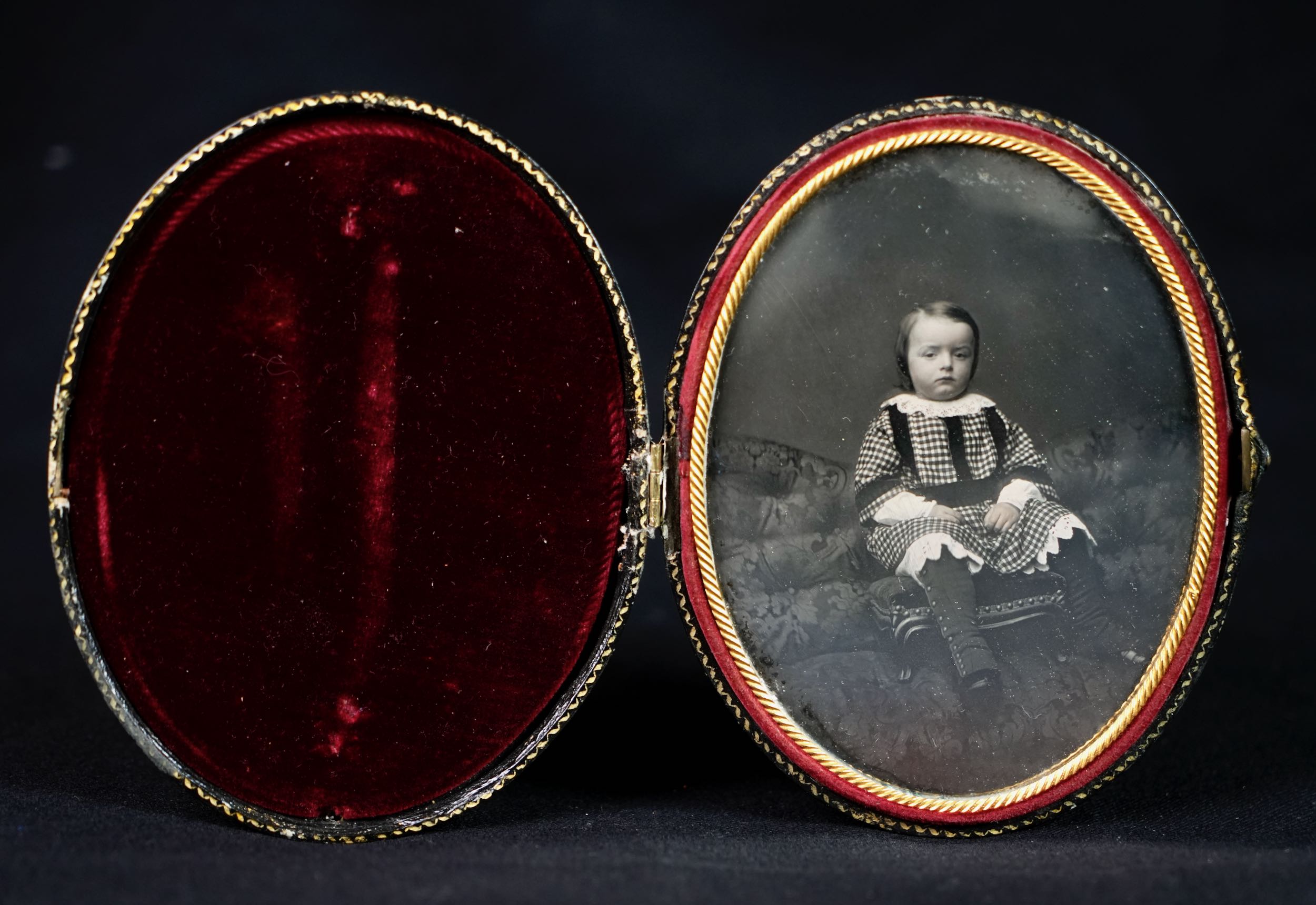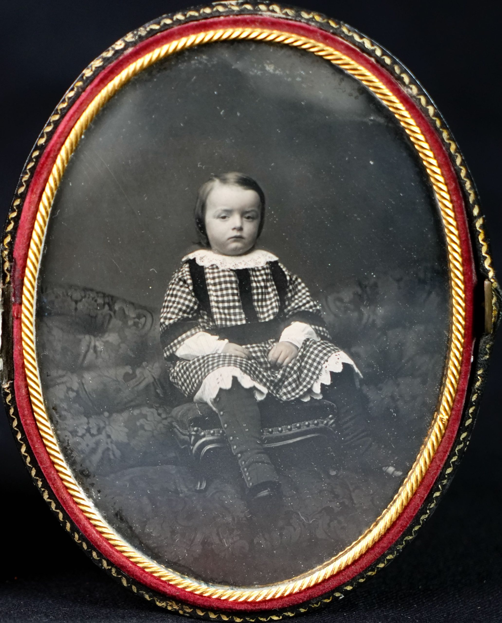 Daguerréotype, tiers de plaque, par Victor Plumier, Paris, vers 1850-1855. Portrait d’un jeune enfant assis sur un petit fauteuil de studio, présenté dans un écrin ovale gainé de cuir noir à intérieur de velours rouge et passe-partout doré. L’enfant, vêtu d’une robe à carreaux ornée de dentelle et de bottines montantes, adopte une pose frontale caractéristique des portraits d’enfants au daguerréotype. Le revers de l’écrin porte l’estampille dorée : « Daguerreotype – Victor Plumier, Paris, rue Vivienne, 56 »