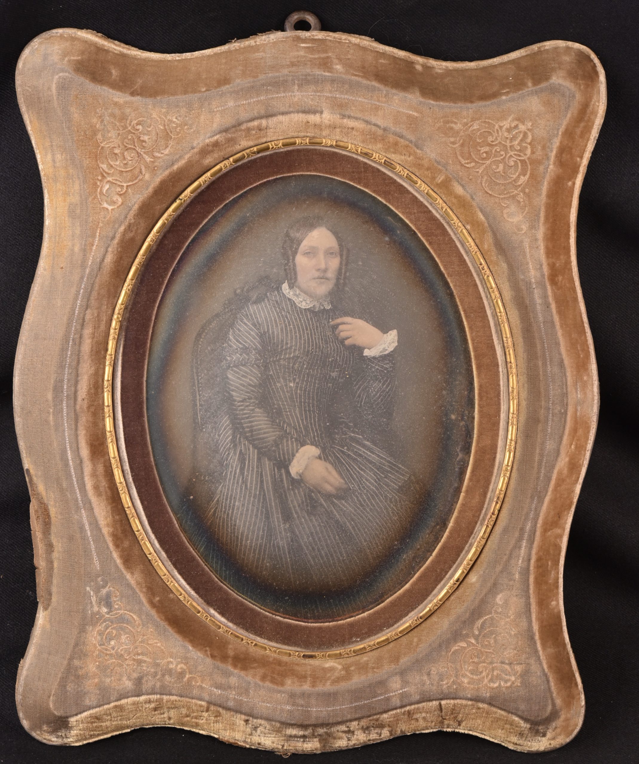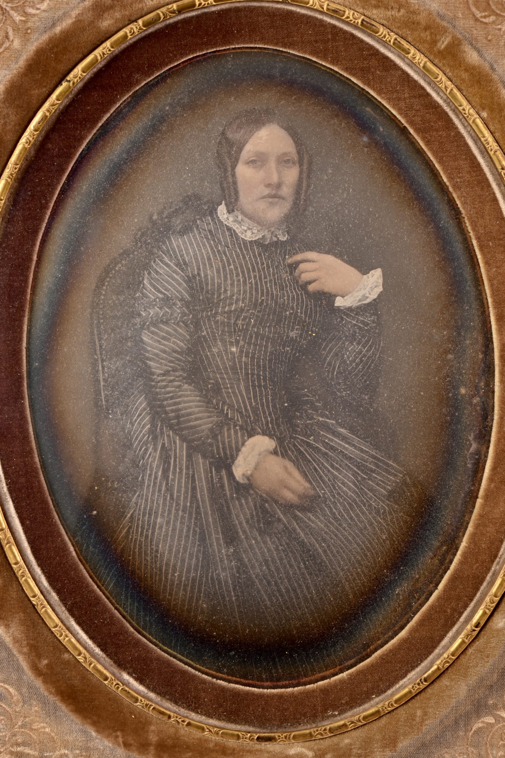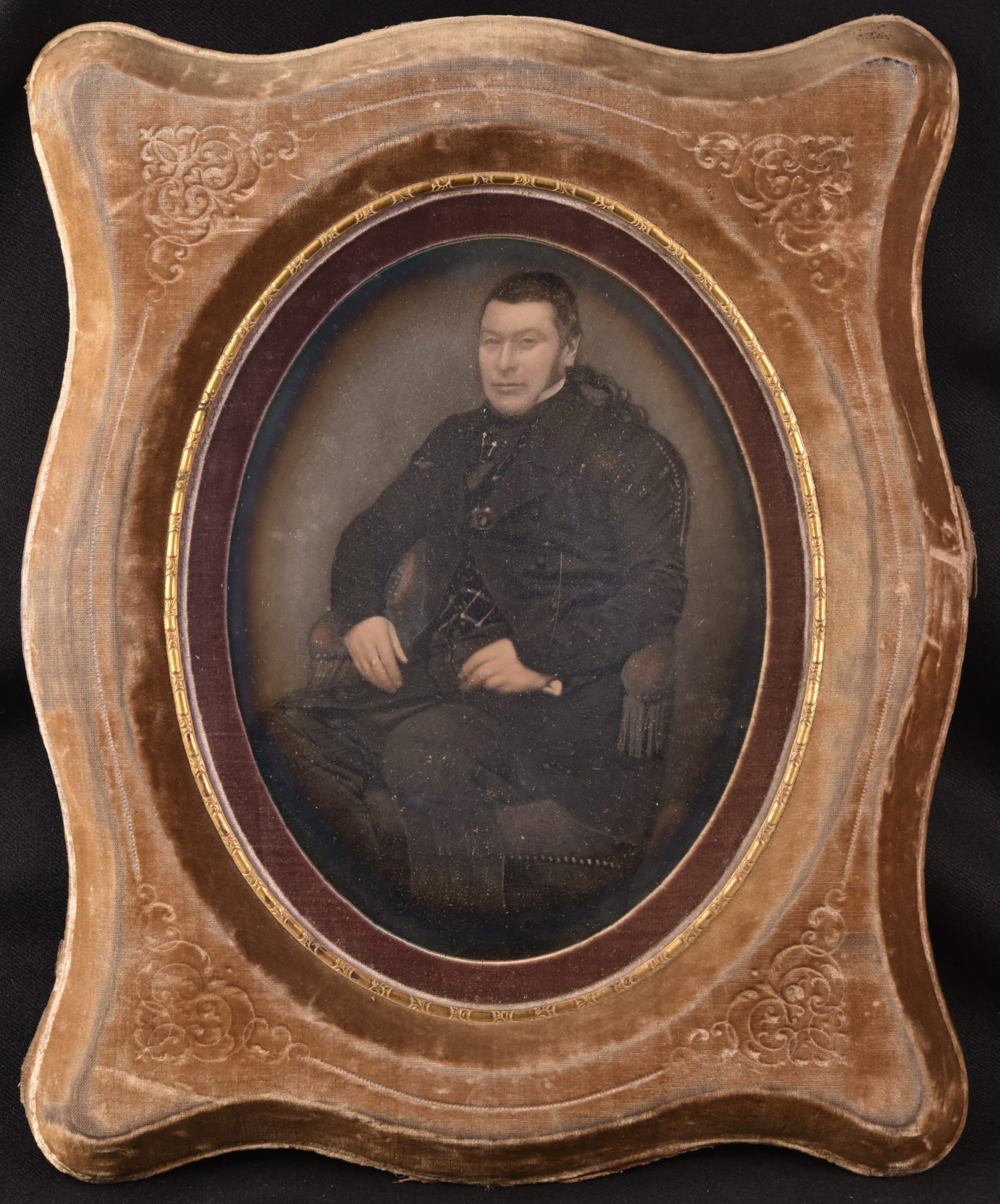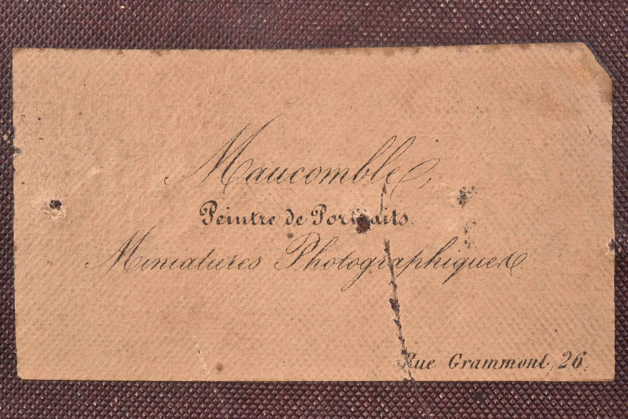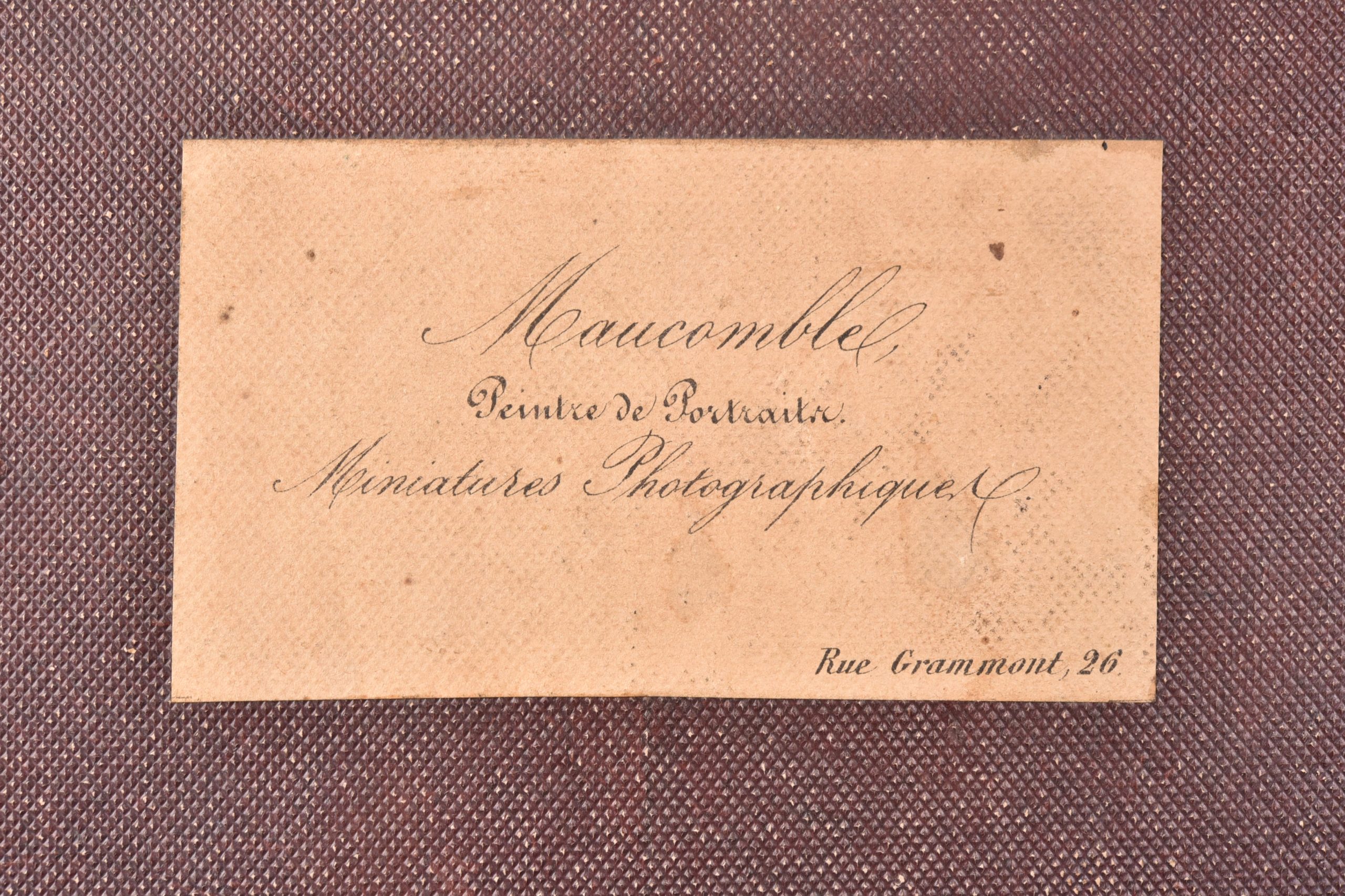 Deux daguerréotypes peints, cadres recouverts de velours avec motifs floraux et biseau plaqué d'or.  Couple de notables assis de trois quarts. Les individus sont saisis individuellement mais se répondent par l'orientation, à droite pour l'une et à gauche pour l'autre, qui invite à les disposer côte à côte. L'artiste Maucomble, installé au 26 rue Grammont à Paris, est peintre portraitiste et daguerréotypiste. Il est le contemporain de grands noms de l'iconogénie comme le brillant Jules Ziegler : <span style="font-size: 1rem;"> « En 1842, on commence à colorier des daguerréotypes. Quelques peintres miniaturistes comme Ziegler, Maucomble, Meyer, etc. acquirent un certain renom dans cette spécialité. » - Georges POTONNIÉE, Histoire de la découverte de la photographie, 1925, p.238 - </span>La colorisation des daguerréotypes est tardive dans l'histoire du procédé car quelques années plus tard, il sera supplanté par l'usage du collodion humide. Néanmoins, cette pratique crépusculaire fait se croiser deux arts que l'on aime à opposer d'ordinaire : la peinture et la "photographie". Excellent état, ensemble rare.