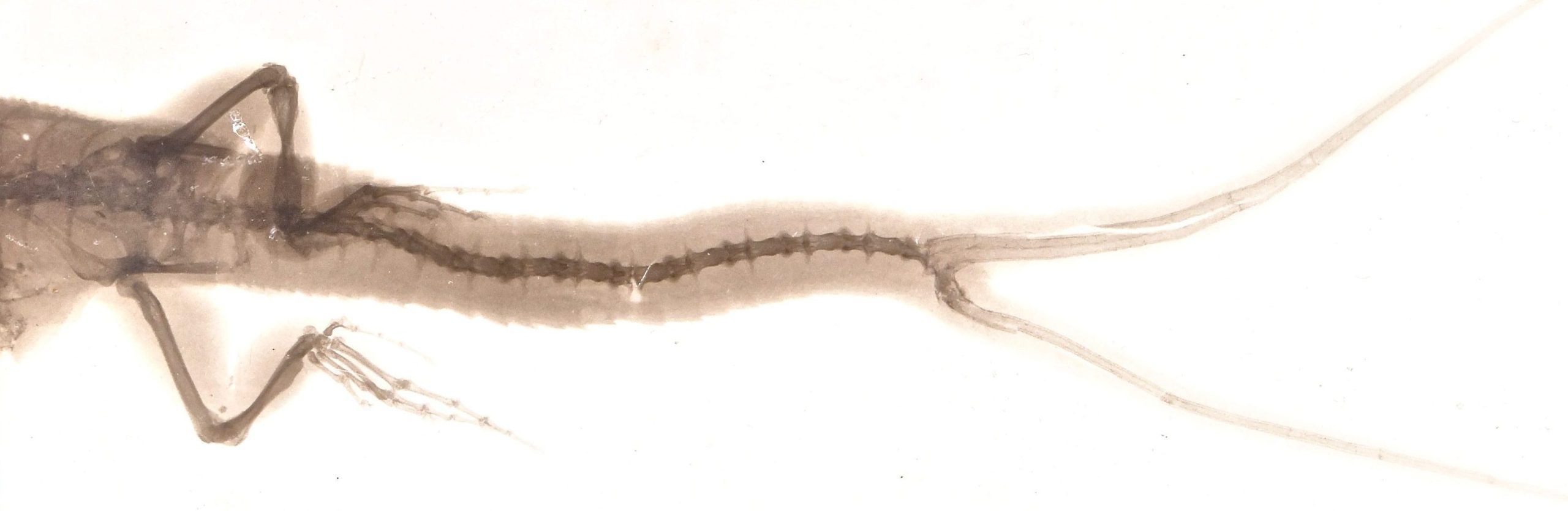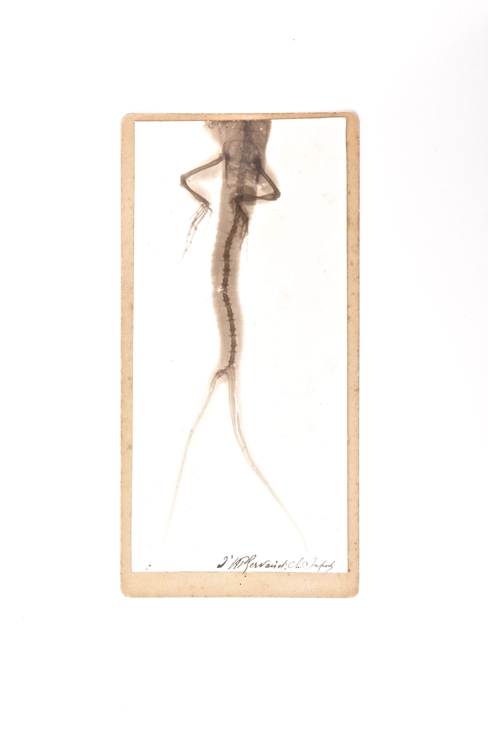 Deux épreuves argentiques contrecollées sur carton à caractère scientifique représentent un ou deux spécimens de lézard avec une queue fourchue. La singularité des sujets photographiés a sans doute motivé la prise de vue. Cette dernière constituant une tentative de compréhension du phénomène observé ou bien une façon de vérifier une hypothèse sur les causes du phénomène. Ce cliché est d'après une radiographie de Charles Infroit, préparateur puis directeur, à partir de 1903, du laboratoire photographique de l’hôpital de la Salpêtrière.