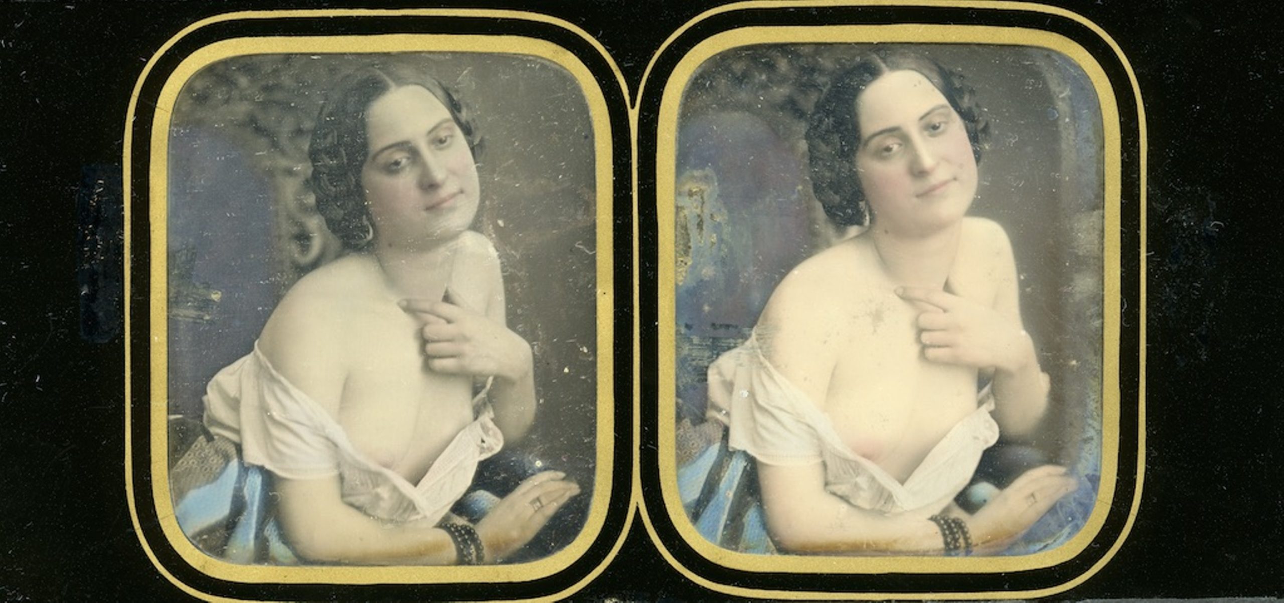 Daguerréotype stéréoscopique colorié 8,5 x 17,3cm France vers 1850.Ce produit m'intéresse -