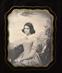 Daguerréotype quart de plaque : jeune femme assise posant devant un décor représentant un paysage de (...)Ce produit m'intéresse -