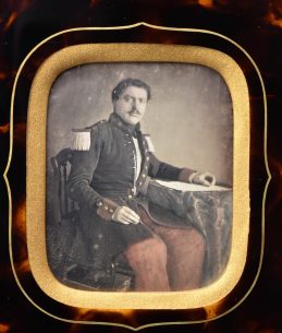 Daguerréotype quart de plaque légèrement colorisé : Militaire assis, accoudé à une tablette sur laquelle figure (...)Ce produit m'intéresse -