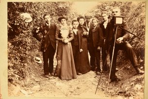 Groupe posant avec un photographe et son appareil, 1900