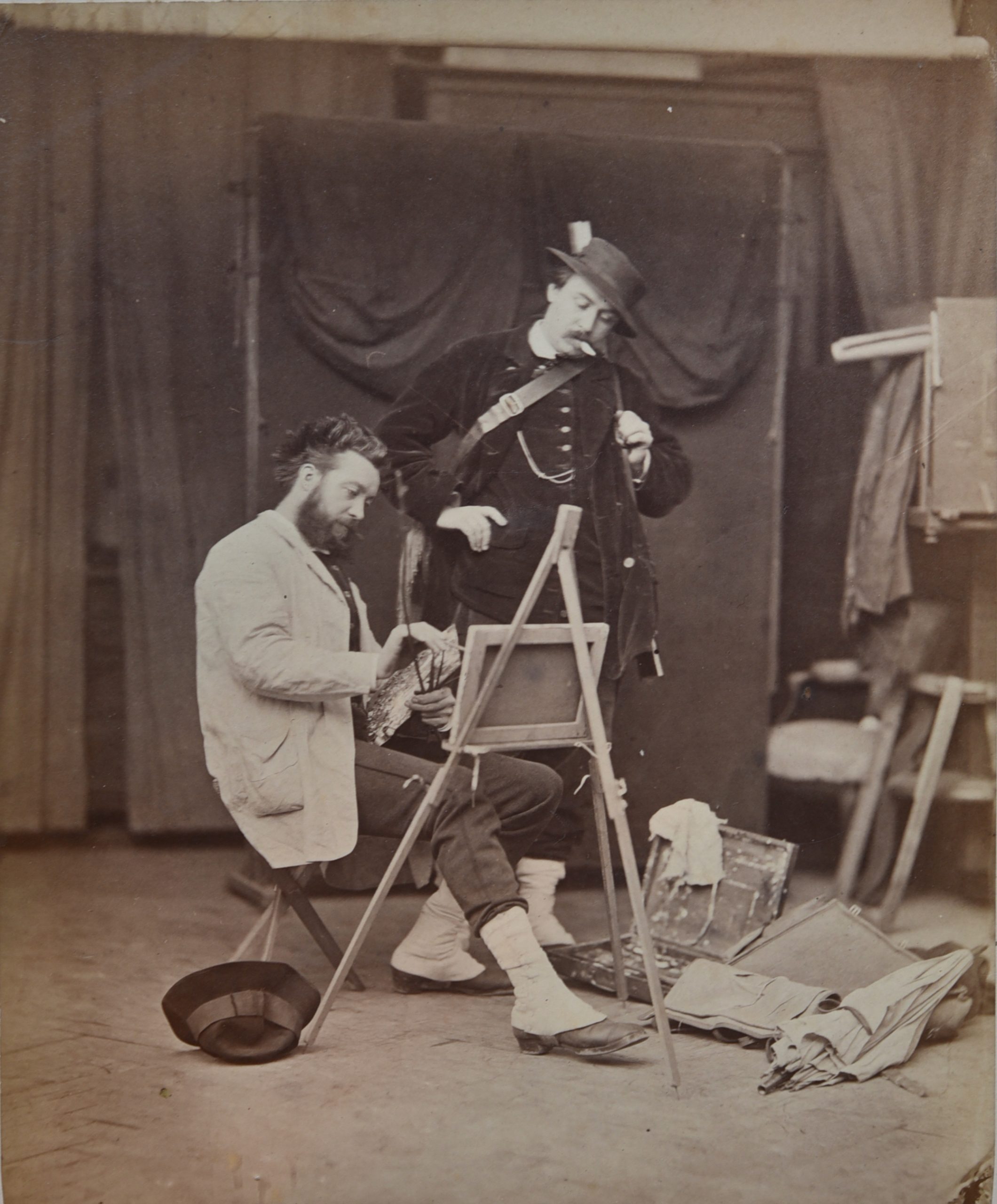 <span style="font-family: Times New Roman, serif;"><span style="font-size: medium;">This fantastic albumen paper photograph represents a painter at work in his studio. We see him adding a few strokes to his painting. Next to him, slightly removed, is a man standing in dark garb wearing a hat. The theme of the photograph and the time period make us think that the author of this photograph could very well be Alphonse Le Blondel (1814-1876). The image measures 19 x 23 cm, the carboard measures 24,5 x 31,5 cm. French.</span></span>