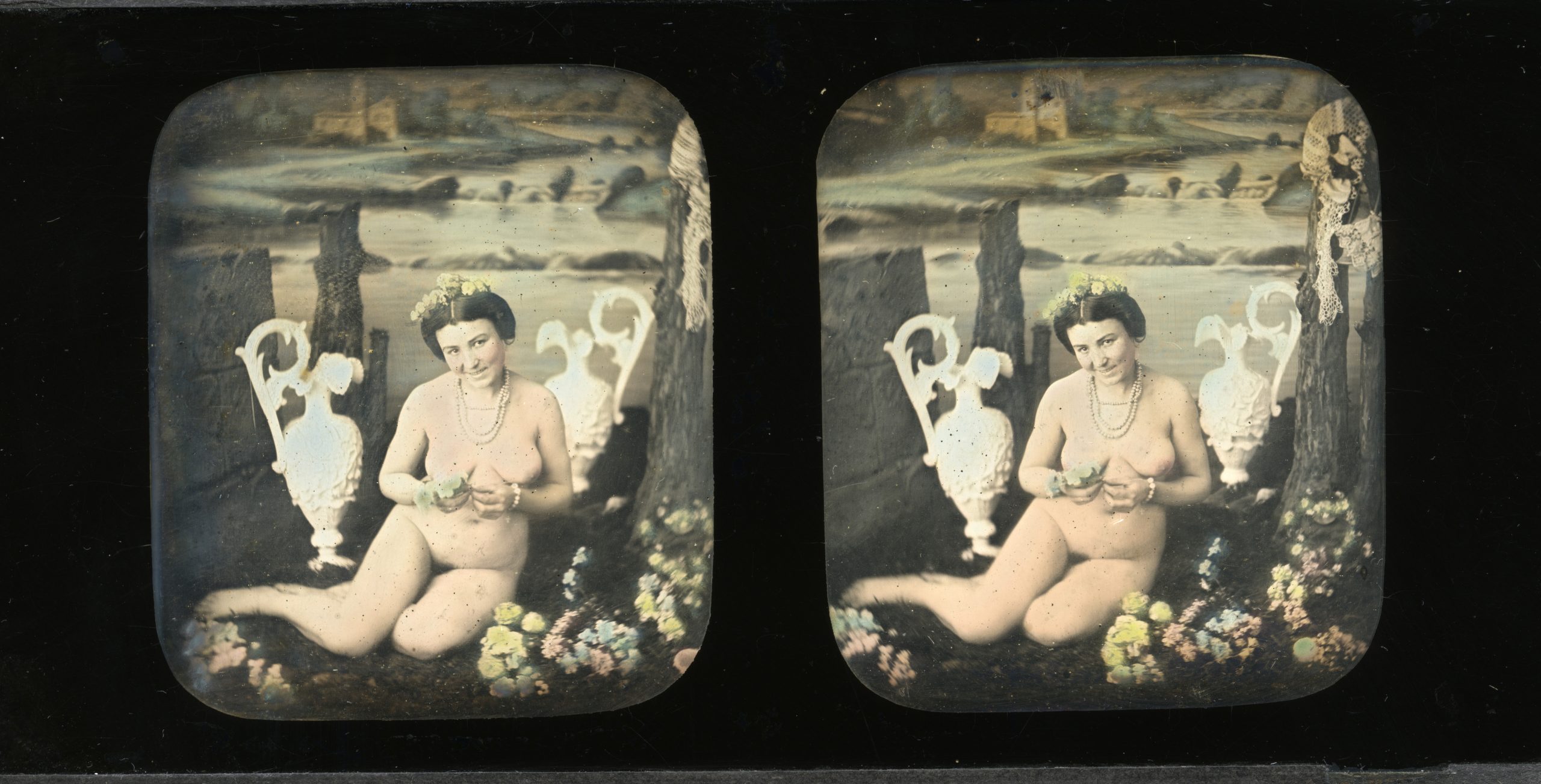 <span style="font-size: 1rem;">Stereoscopic colorized daguerreotype par Félix Jacques Antoine Moulin</span><span style="font-size: 1rem;">. It shows a naked woman seated in the foreground holding flowers in her hands. The idyllic setting, shown in the backdrop, is reminiscent of works from the romantic period, with amphorae, ruins and a river. The painted canvas also shows a building in the distance, possibly a mill or an inn. T</span><span style="font-size: 1rem;">he naked model somwhat clashes with this quaint evocation of romanticism, reinforcing this daguerreotype's unique character. France, around 1845.</span>