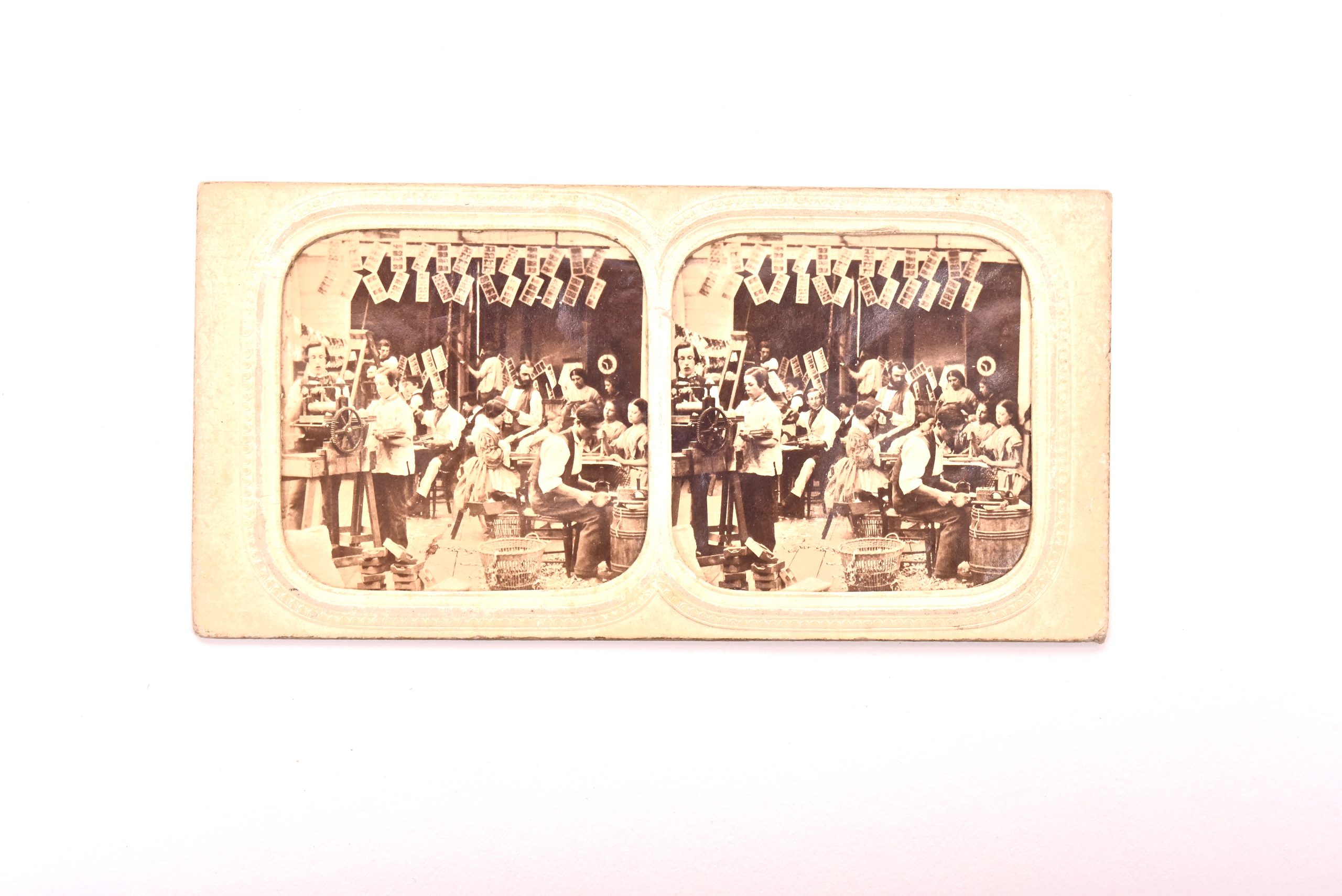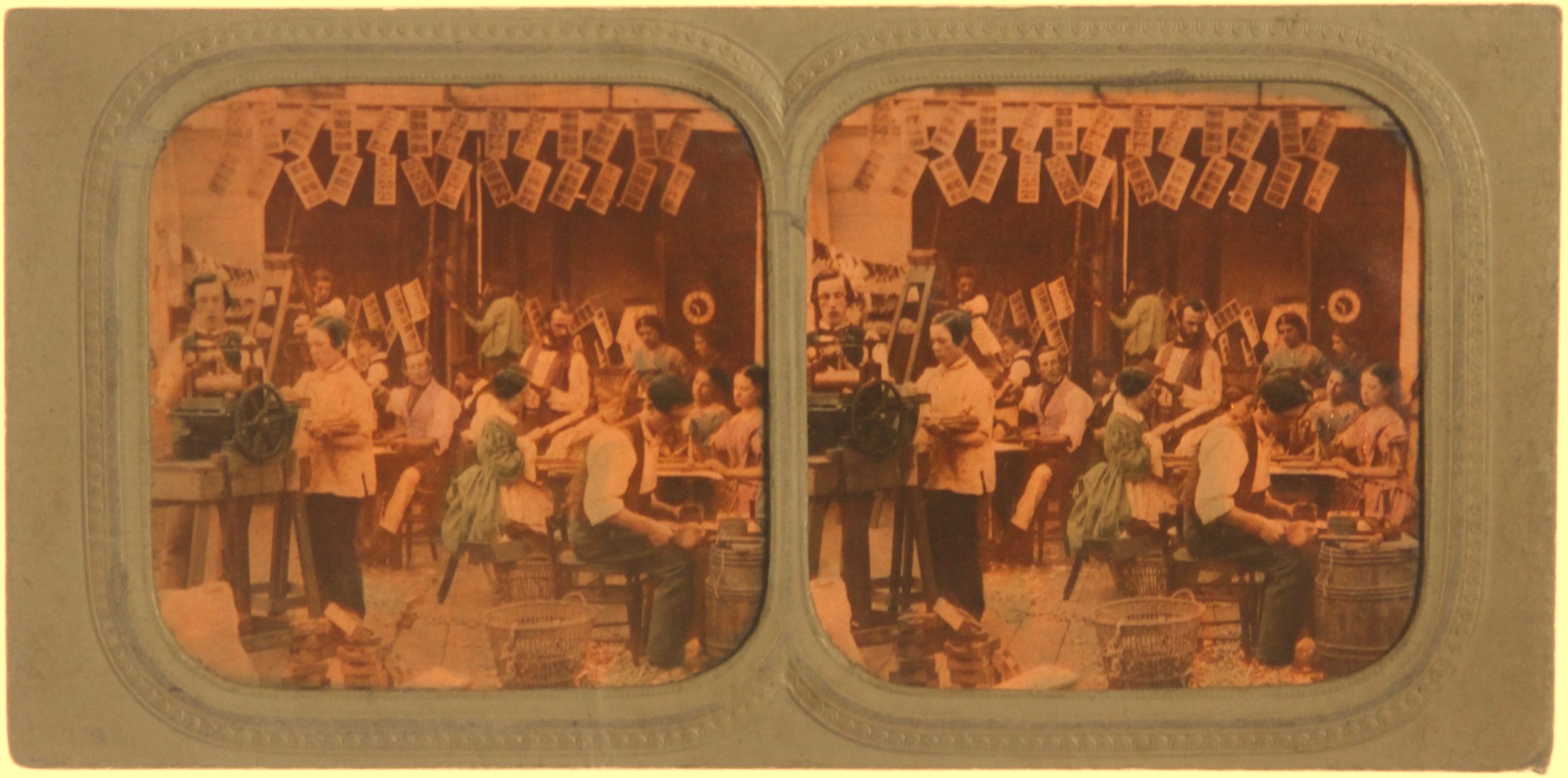 Cette vue stéréoscopique avec effet “jour / nuit” présente une scène rare : un atelier de fabrication de vues stéréoscopiques ! Outre la mise en abime évidente présentée par cette carte stéréoscopique, on y remarque l'arrangement des locaux, les outils et la division du travail qui règne dans l'atelier de confection. À l'avant, on aperçoit de l'outillage. Le sol est encombré de copeaux de carton que des paniers tentent en vain de retenir. Sur la gauche, on note ce qui ressemble fortement à une pile de châssis-presse. De jeunes hommes coupent et rabotent des vues. Assises à une table, de jeunes femmes semblent appliquer le gaufrage ou le sceau de l'éditeur. D'autres visages semblent être ceux des chefs d'atelier. La multitude de personnages et la prolifération des activités rendent cette vue fascinante. Un trésor à contempler encore et encore.