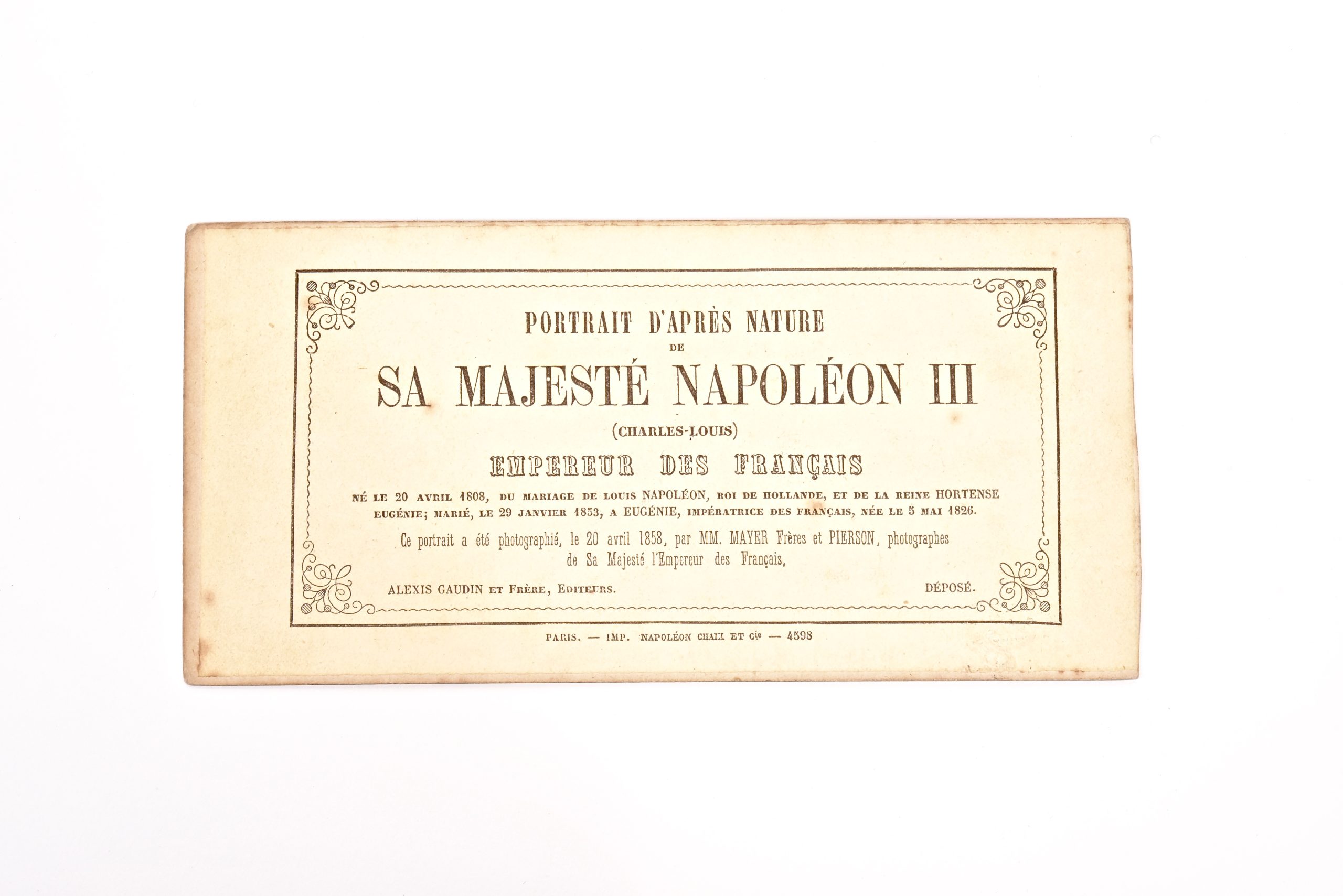 Cette vue stéréoscopique est un célèbre « Portrait d'après nature de Sa Majesté (Charles Louis) Napoléon III Empereur des Français ». La légende à l'arrière de la vue continue : « Né le 20 avril 1808, du mariage de Louis Napoléon, roi de Hollande, et de la Reine Hortense Eugénie; marié, le 29 janvier 1853, à Eugénie, impératrice des français, née le 5 mai 1826. Ce portrait a été photographié, le 20 avril 1858 par MM. Mayer Frères et Pierson , photographes de Sa Majesté l'Empereur des Français ».