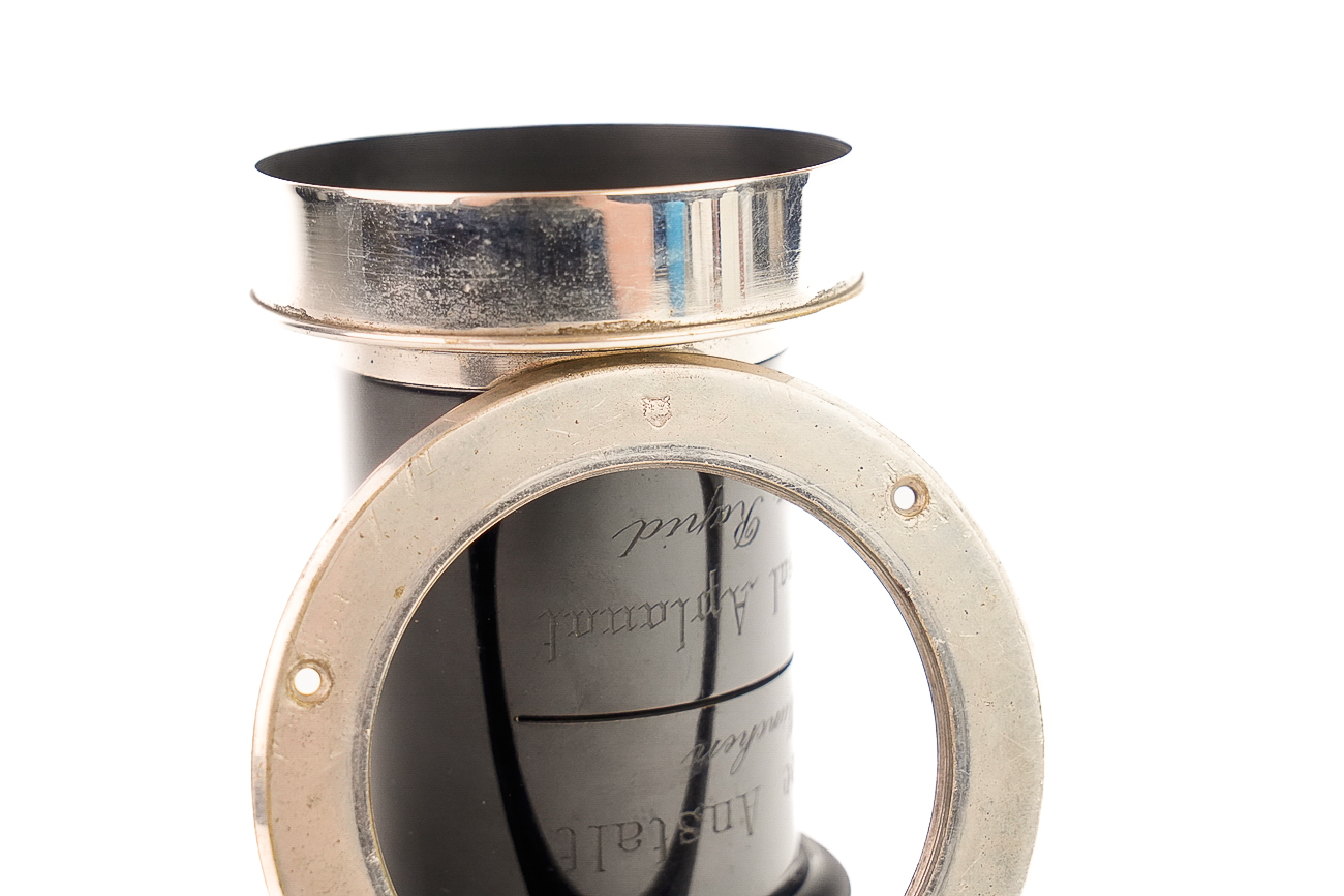 Objectif en laiton nickelé pour le portrait. Il mesure 11,3 cm de hauteur. Environ 400mm de focale, ouverture maximale autour de f/7,7. Le diamètre des lentilles est de 52mm. Couvre le 24x30 cm (10x12"). Lentilles propres, pas de décollement, pas de champignon, pas de rayure profonde, pas de brume. On note de légères rayures de nettoyage. Vers 1900. Objectif N°13715.