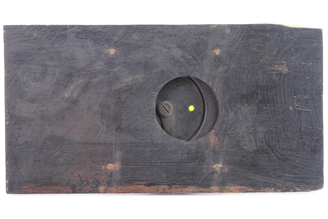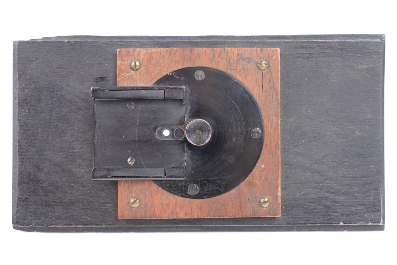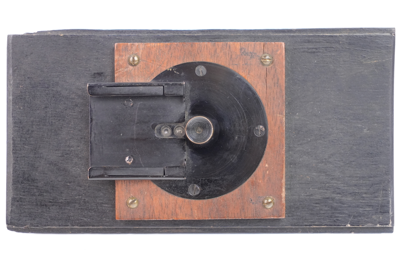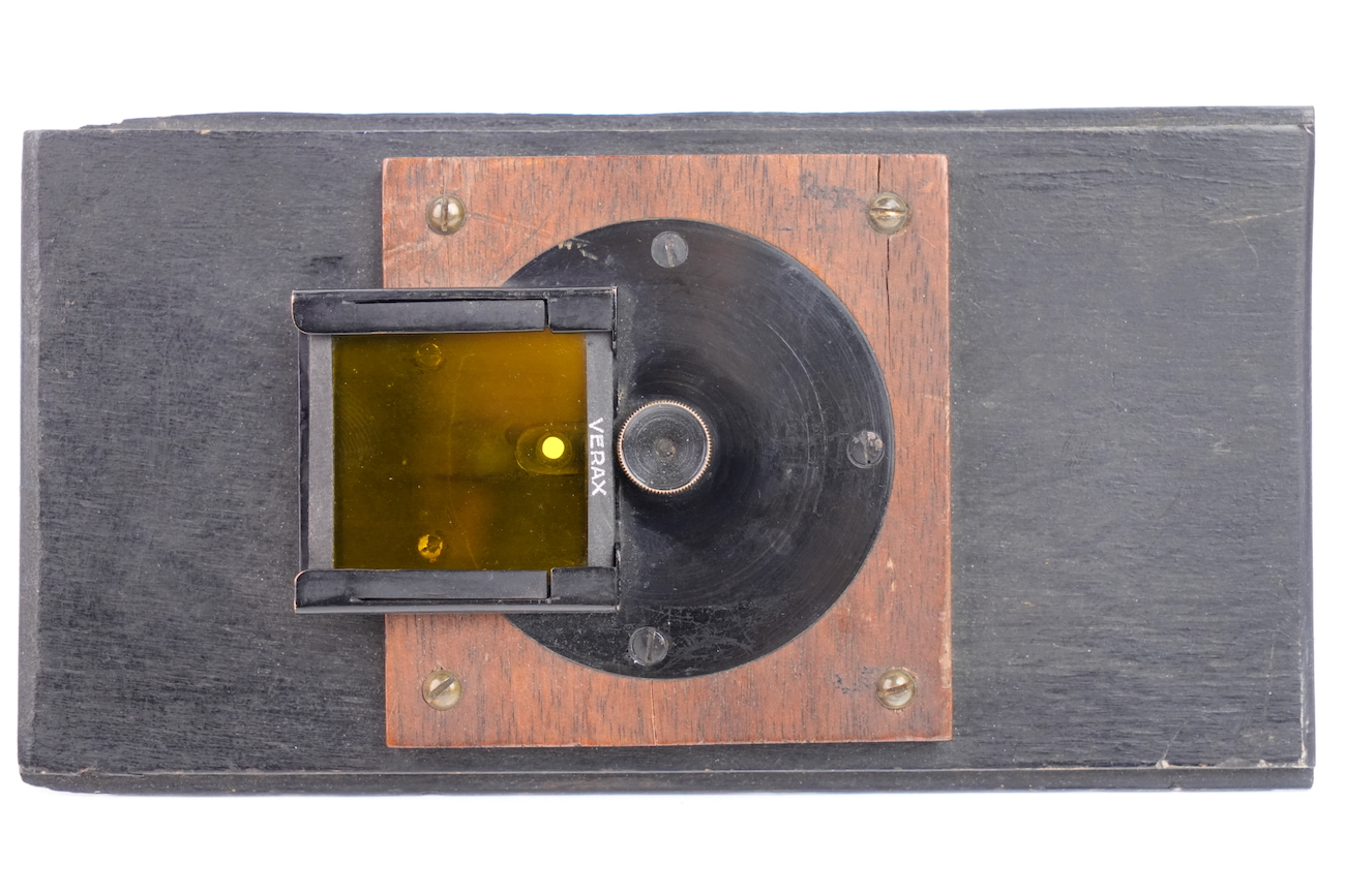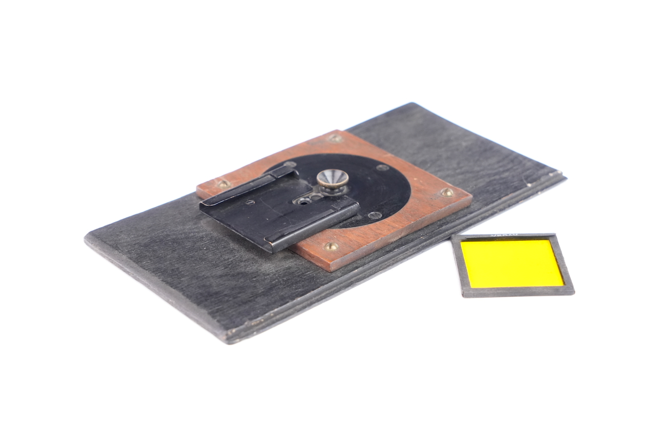 Substitut à un objectif composé de lentilles en verre, le sténopé permet la prise de vues grâce à un minuscule trou. Le présent sténopé est composite. Il s'agit d'un assemblage de planchettes dont la plus grande fait 9x17 cm. Une deuxième planchette, carrée, y est fixée. On y trouve une molette permettant de faire tourner un disque métallique sur lequel sont percés huit trous de taille variable. Certains sont numérotés suivant une logique de taille croissante, d'autres non. On note la présence d'un porte filtre à l'avant du dispositif permettant d'utiliser des filtres carrés de 4x4 cm. Un filtre Jaune de la marque "Verax" est présent. L'inscription "Frennet" ou "Trennet" est lisible sur la planchette carrée  et constitue une piste quant au fabricant de cette pièce. Peu commun.