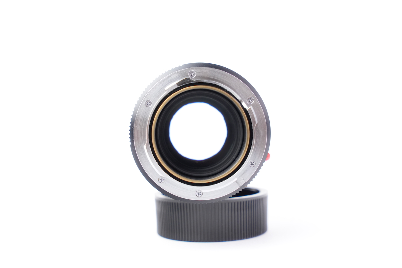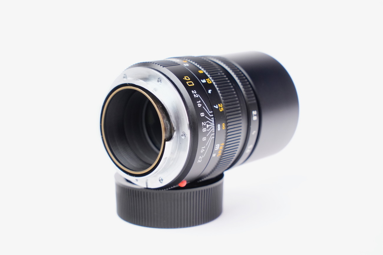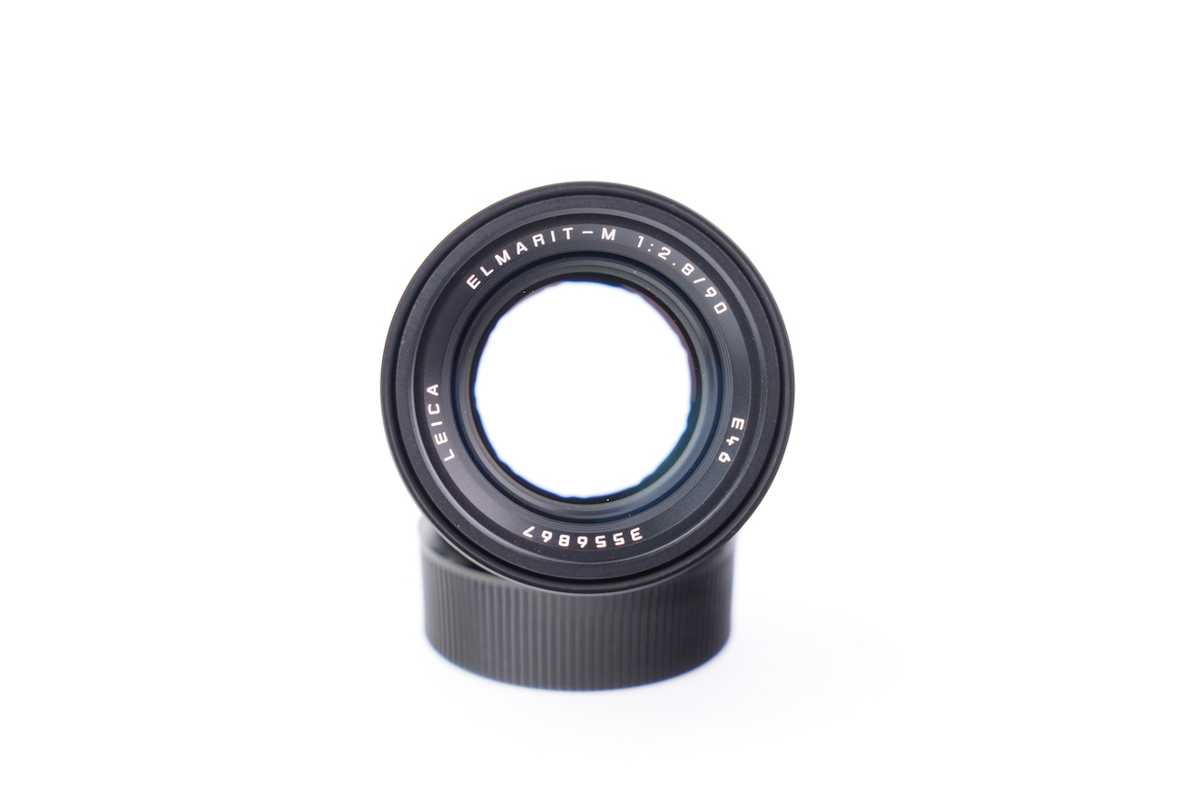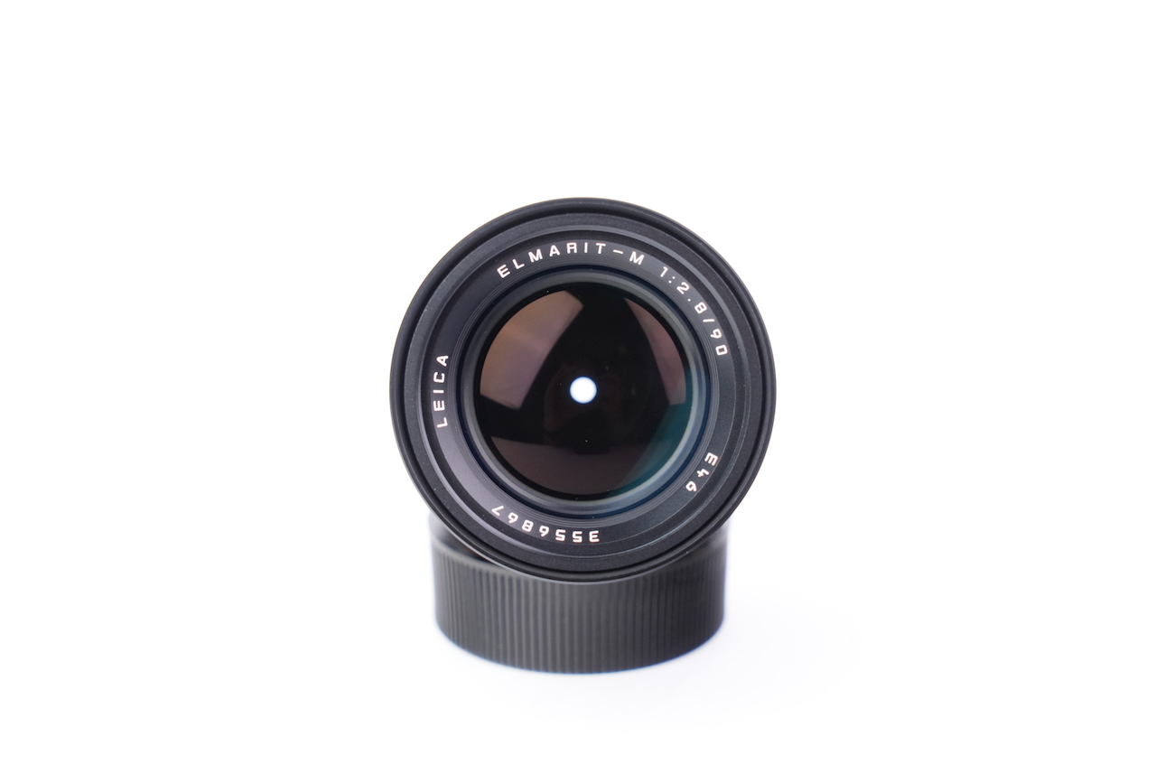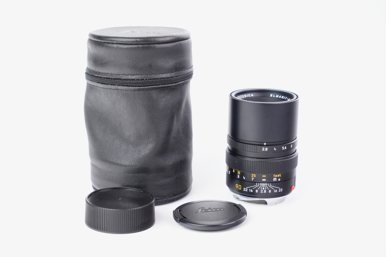 Télé-objectif de la gamme Elmarit, focale idéale pour le portrait. Pare-soleil intégré. Bagues de mise au point et de diaphragme fluides. Lentilles propres sans rayures, ni décollement, ni brume, ni champignons. Numéro de série 3556867.  Compatible Leica M. Avec bouchons avant, arrière et étui souple en cuir noir.