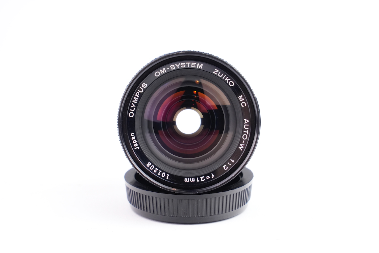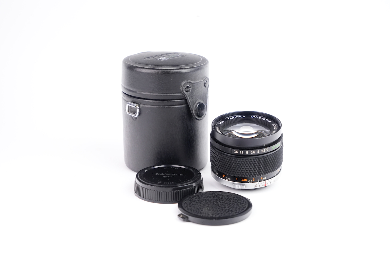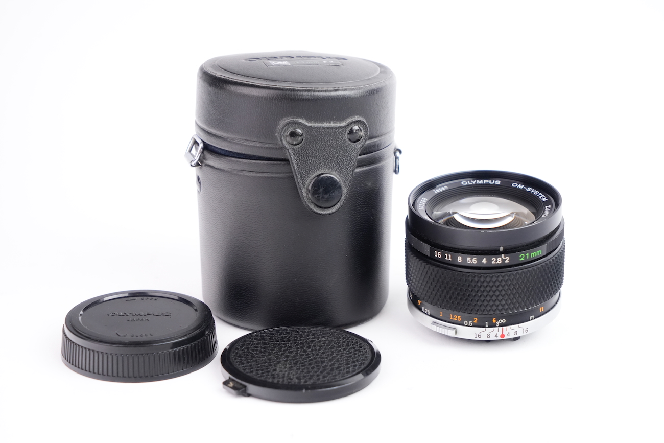 Objectif du fabricant japonais Olympus en monture OM, 21/2. Les lentilles, traitées, sont en bon état, pas de décollement, pas de champignon ni de rayures. On note la présence de très petites poussières et d'une infime brume. Les bagues de diaphragme et de mise au point sont fluides. Vient avec son bouchon avant, arrière ainsi que son étui de rangement original. Couleur noire, numéro de série 101208.
