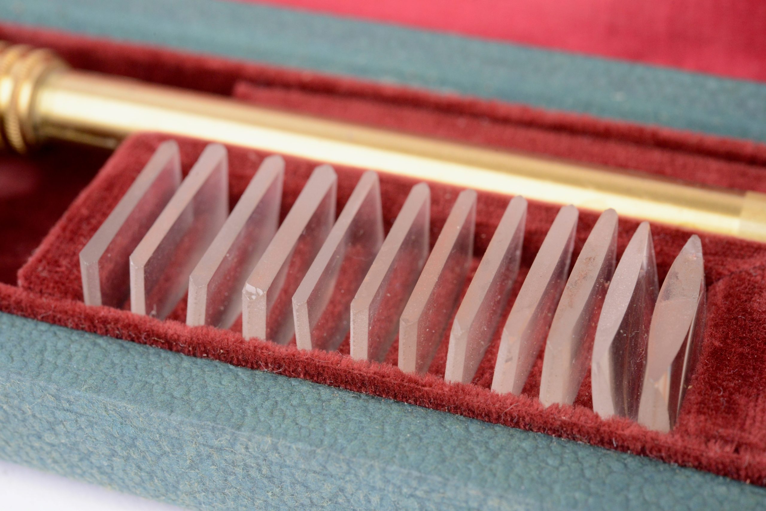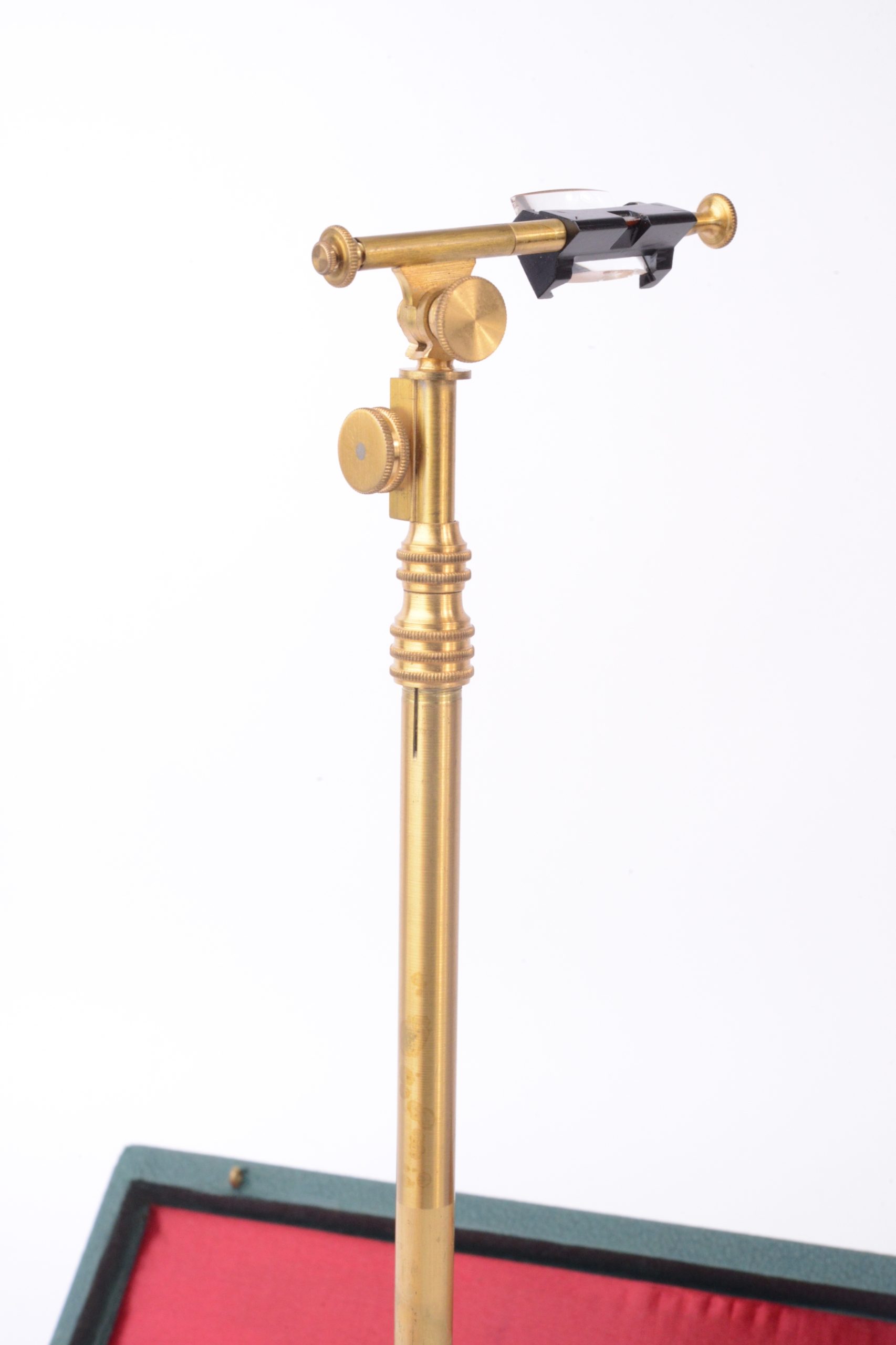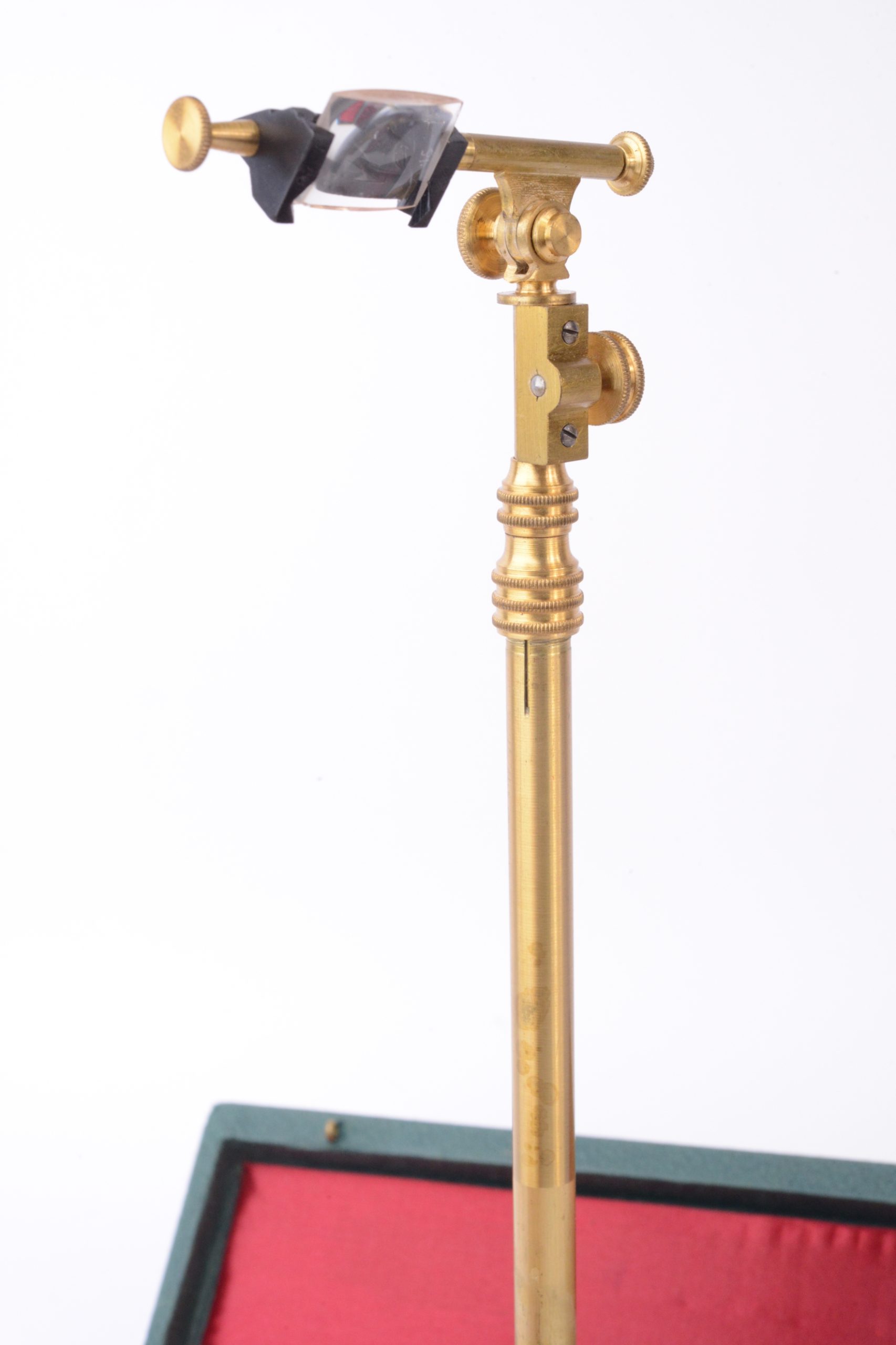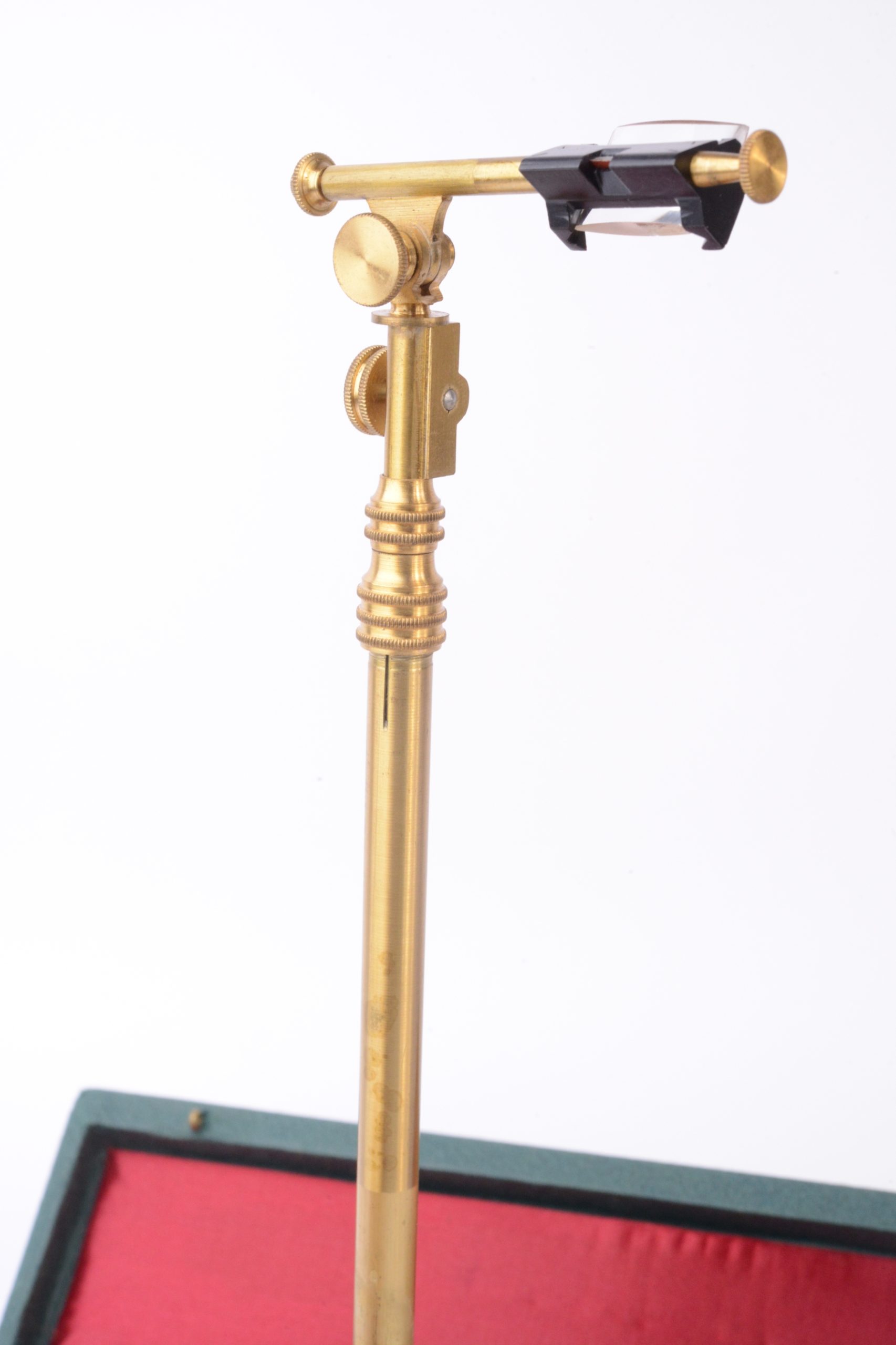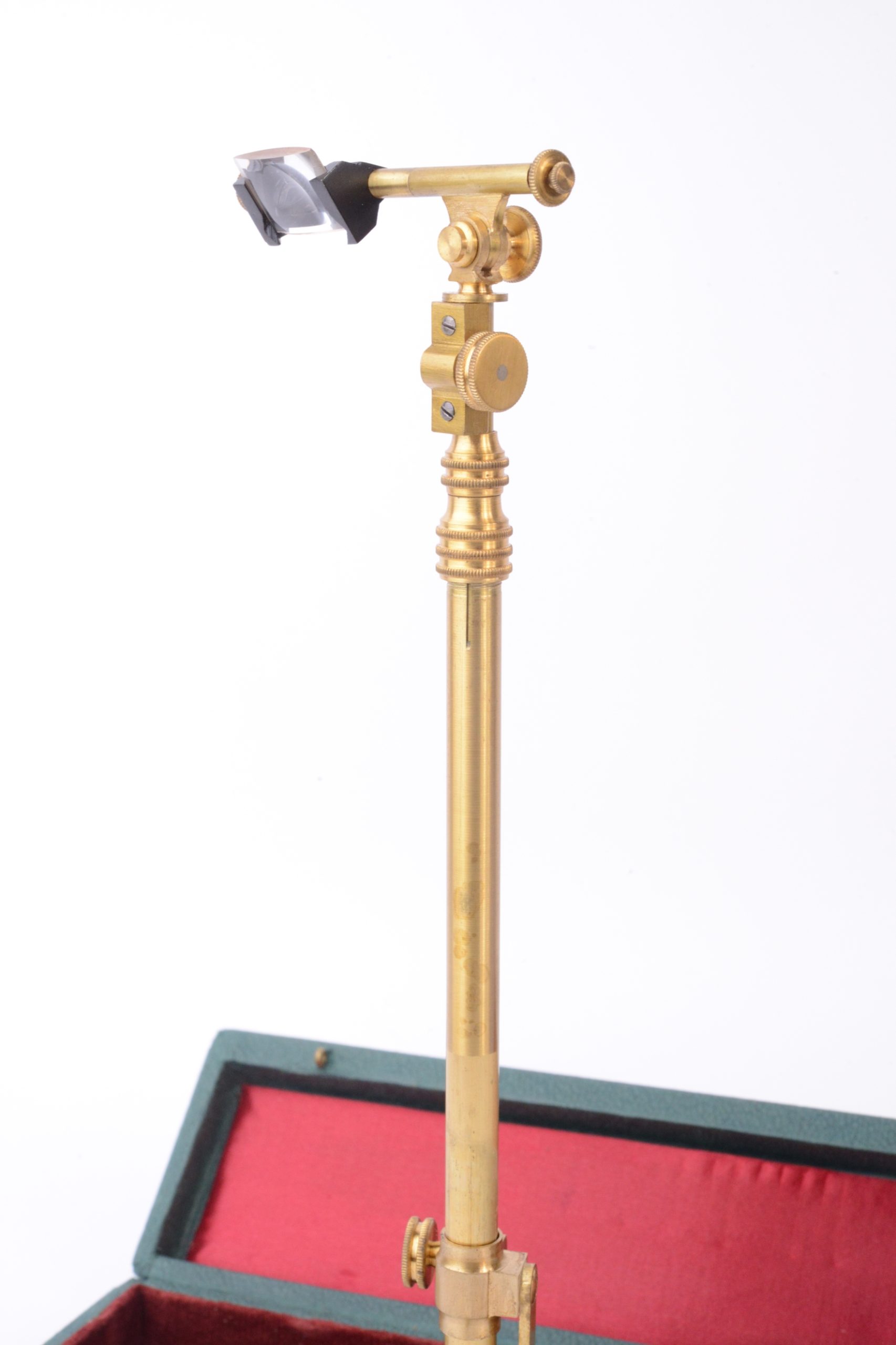 Chambre claire Pierre BERVILLE. Cet appareil est présenté ainsi dans des documents d'époque (première moitié XXème) : "La Chambre Claire Universelle BERVILLE sert pour dessiner, et peindre rapidement et exactement n'importe quel sujet d'après nature et d'après document à n'importe quelle grandeur même sans savoir dessiner ; elle permet de forts agrandissements ainsi que des réductions ; de plus elle laisse bien visible la pointe du crayon. Son prisme triangulaire et argenté est deux fois plus lumineux que ceux des anciens appareils et son angle de visée étant double : 90° au lieu de 45°, elle permet de dessiner d'après nature, depuis les premiers plans jusqu'à l'horizon. L'image est mise au point sur le papier par l'interposition d'une des 12 lentilles à foyer différent qui, en rendant le dessin immobile, supprime la parallaxe". La chambre claire présentée porte la signature « P.B. ». Elle est en cuivre verni et vient dans son étui, complète de ses 12 verres optiques. Très bel état.