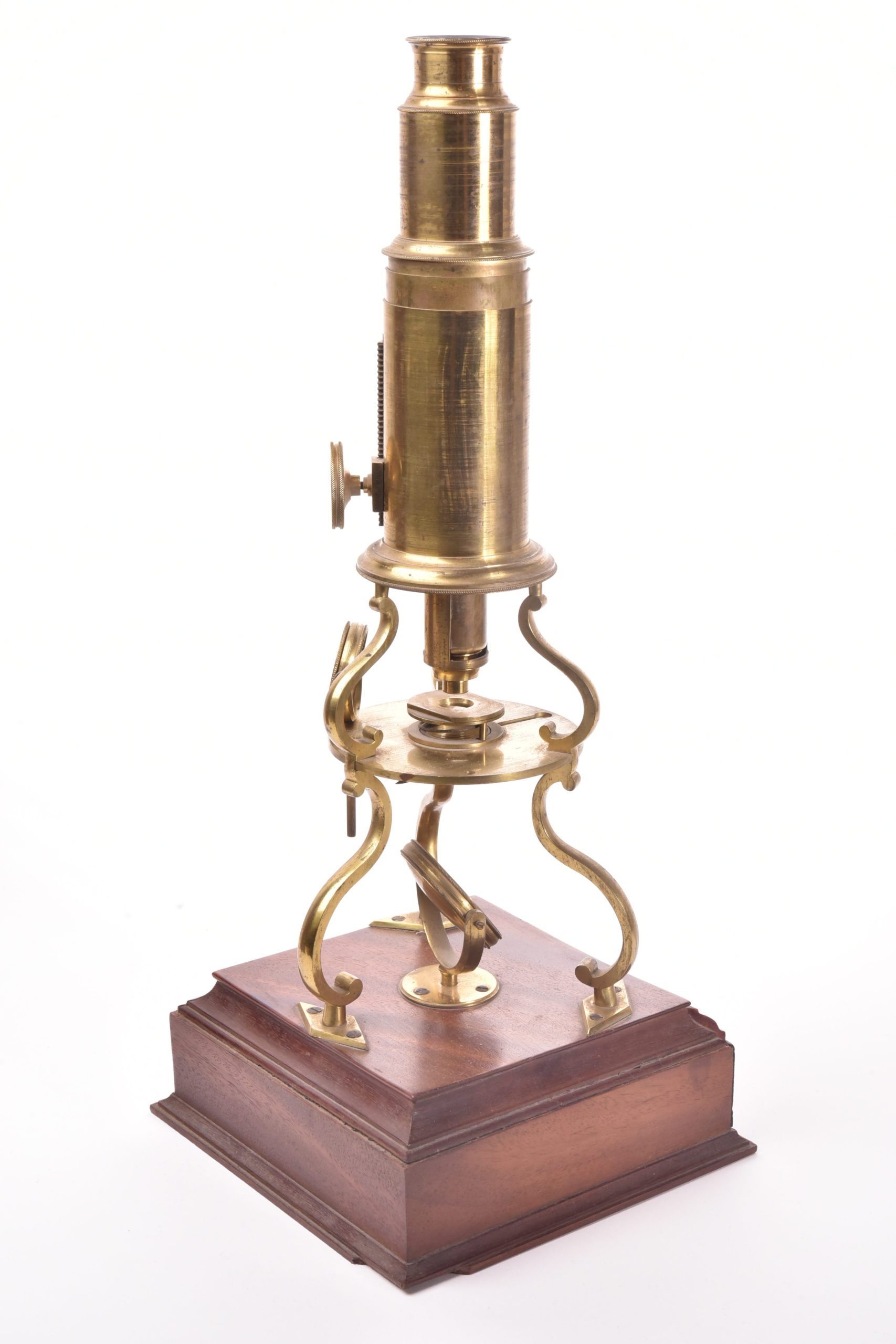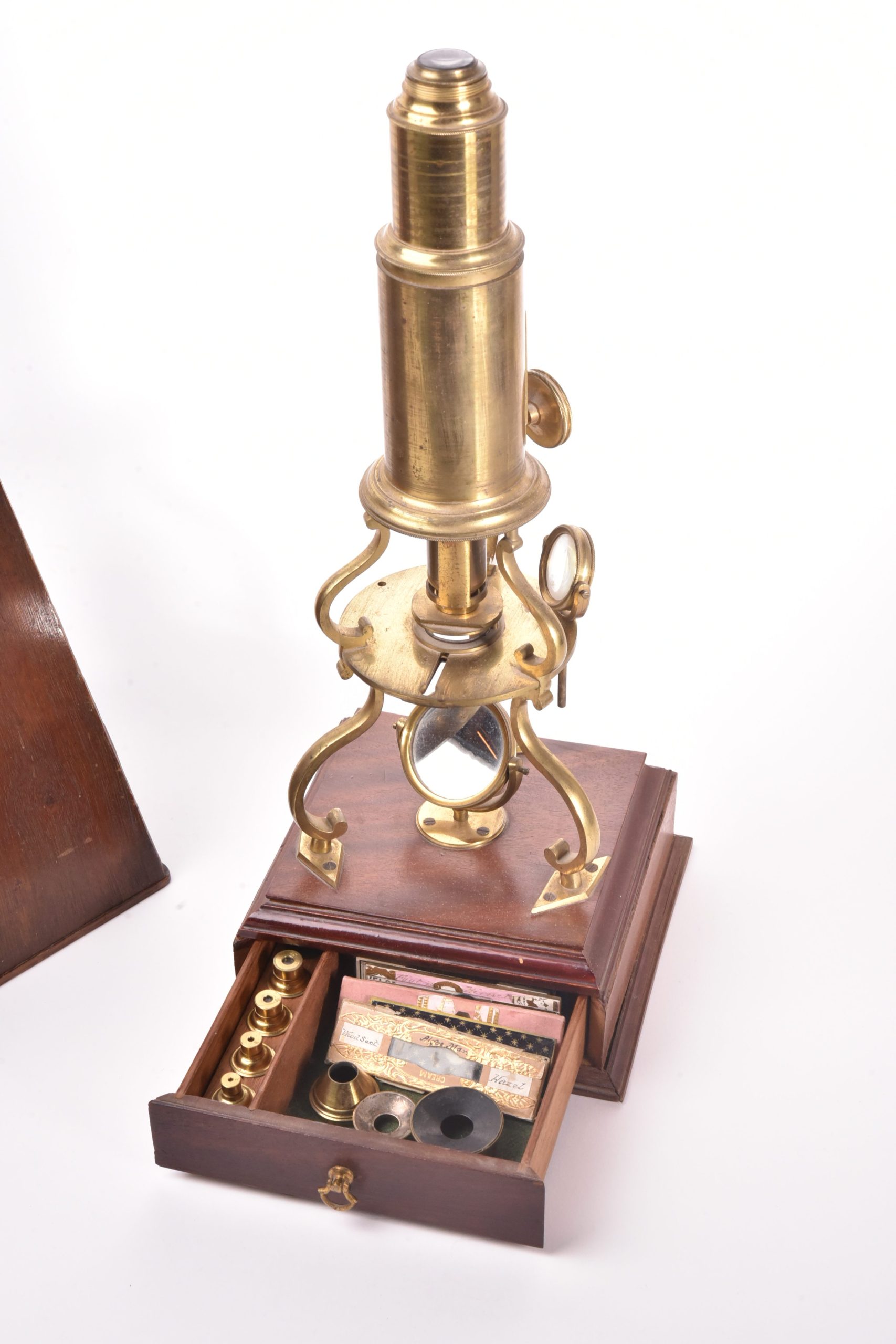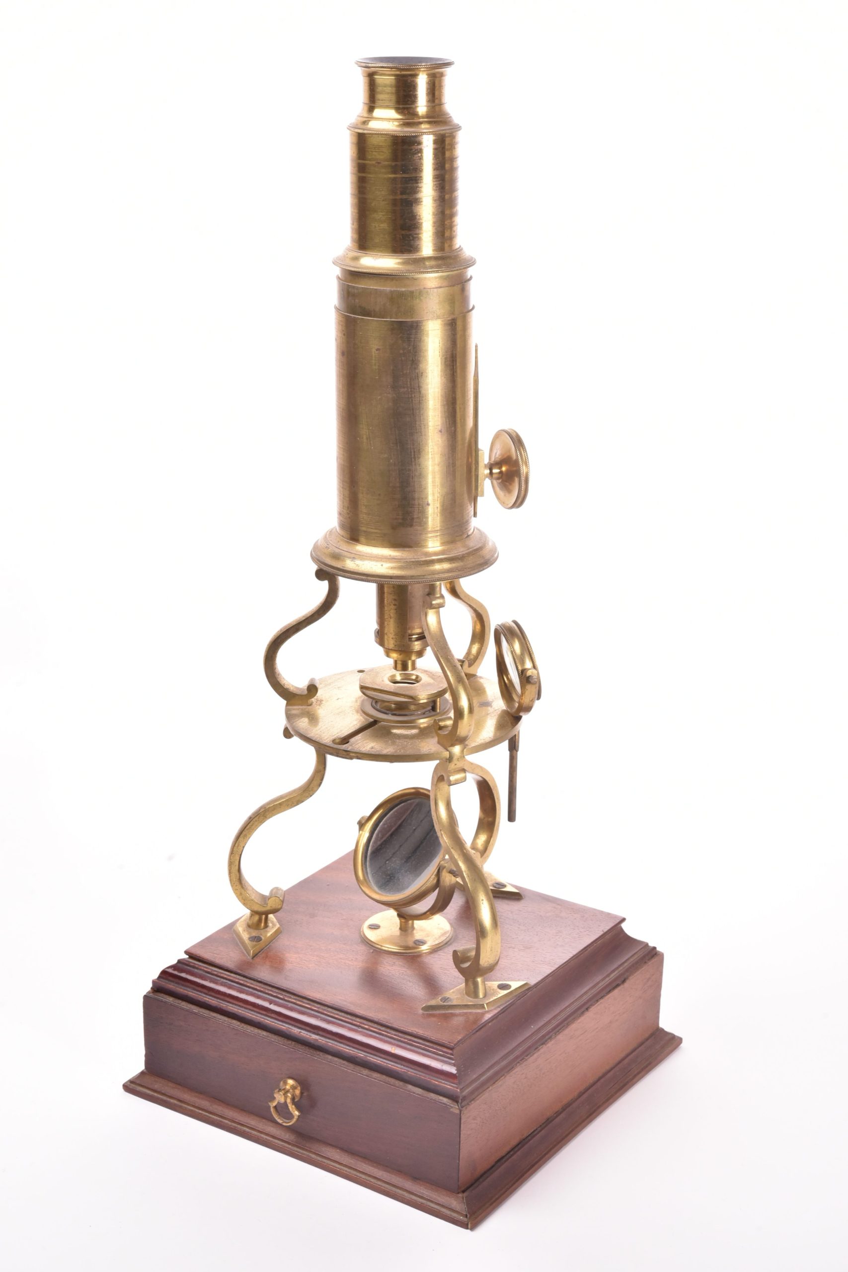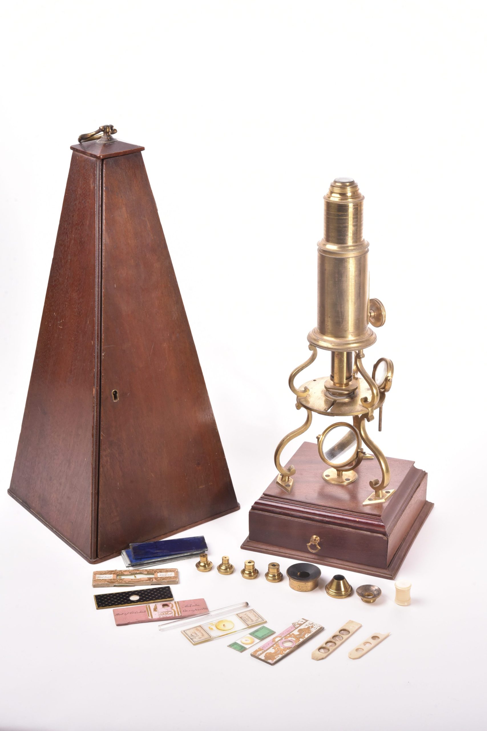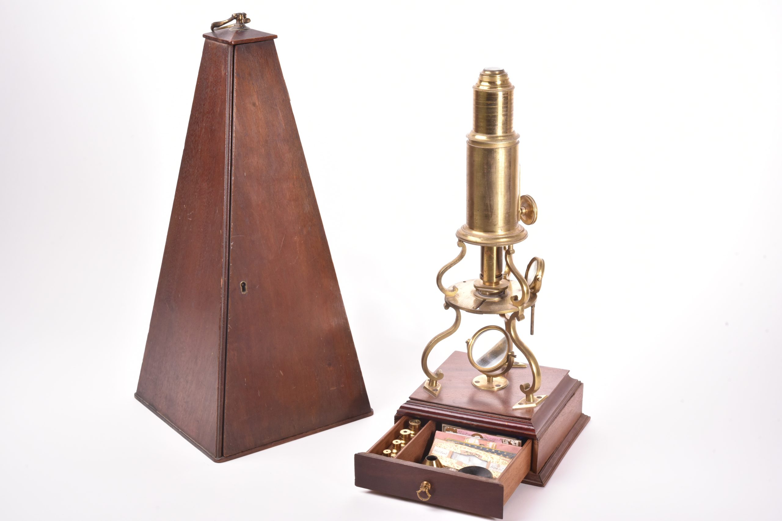 Grand microscope de type Culpeper sur son socle en acajou contenant un tiroir avec de nombreux accessoires. Dans son étui pyramidal. Angleterre, fin XVIII ème siècle. Hauteur de la boite : 42 cm.