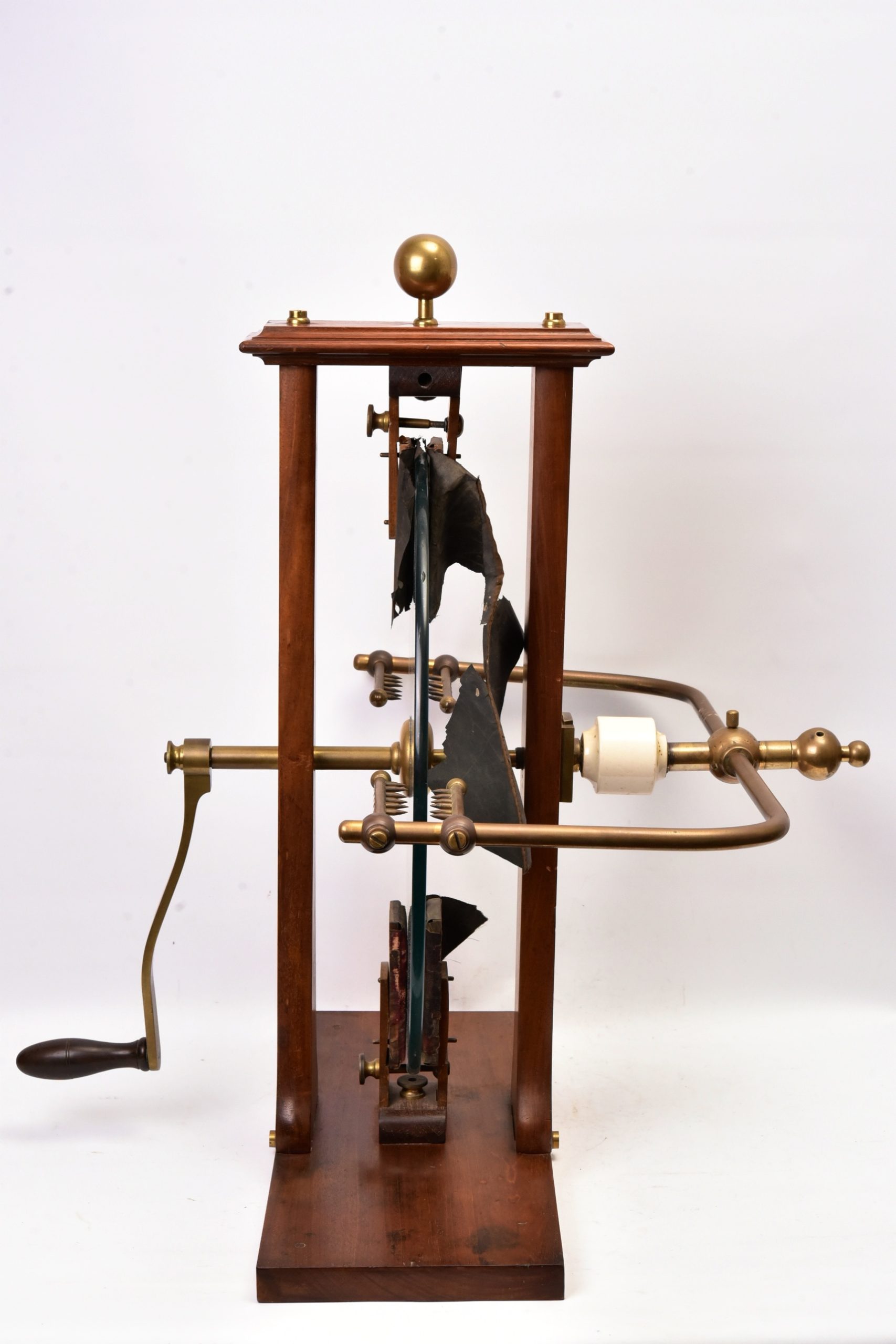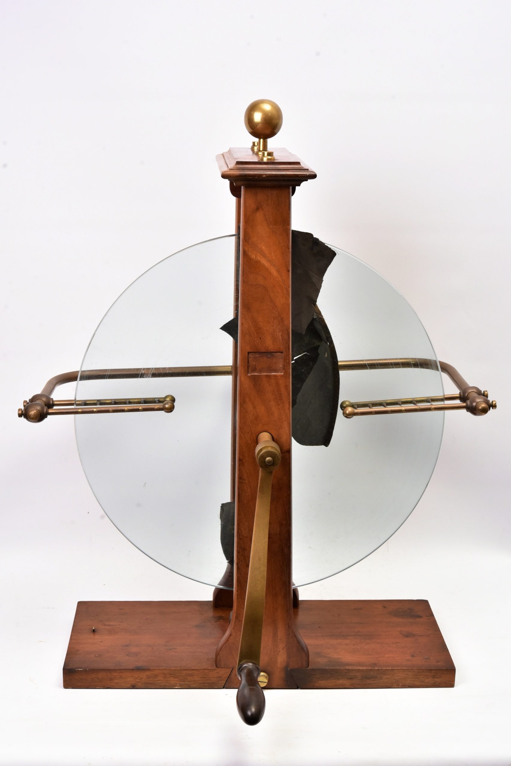 Rare machine électrique de Ramsden. Ce type de machine électrostatique est inventé en 1776 par l’anglais Jesse Ramsden. Elle est capable de produire une décharge électrique par frottement d’un plateau de verre en mouvement. La puissance mécanique engendrée par la rotation du plateau est ainsi convertie en puissance électrique, L’électricité produite l’est sous forte tension mais très faible intensité. Le modèle que nous présentons est de grande taille ; sa hauteur est de 70 cm. Vers 1840. Belle fabrication.