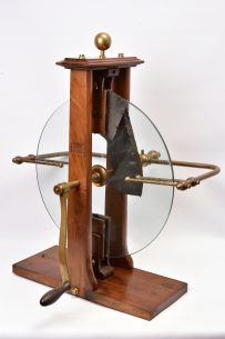 Rare machine électrique de Ramsden. Elle porte une plaque sur laquelle est gravé : « Pixii (...)Ce produit m'intéresse -