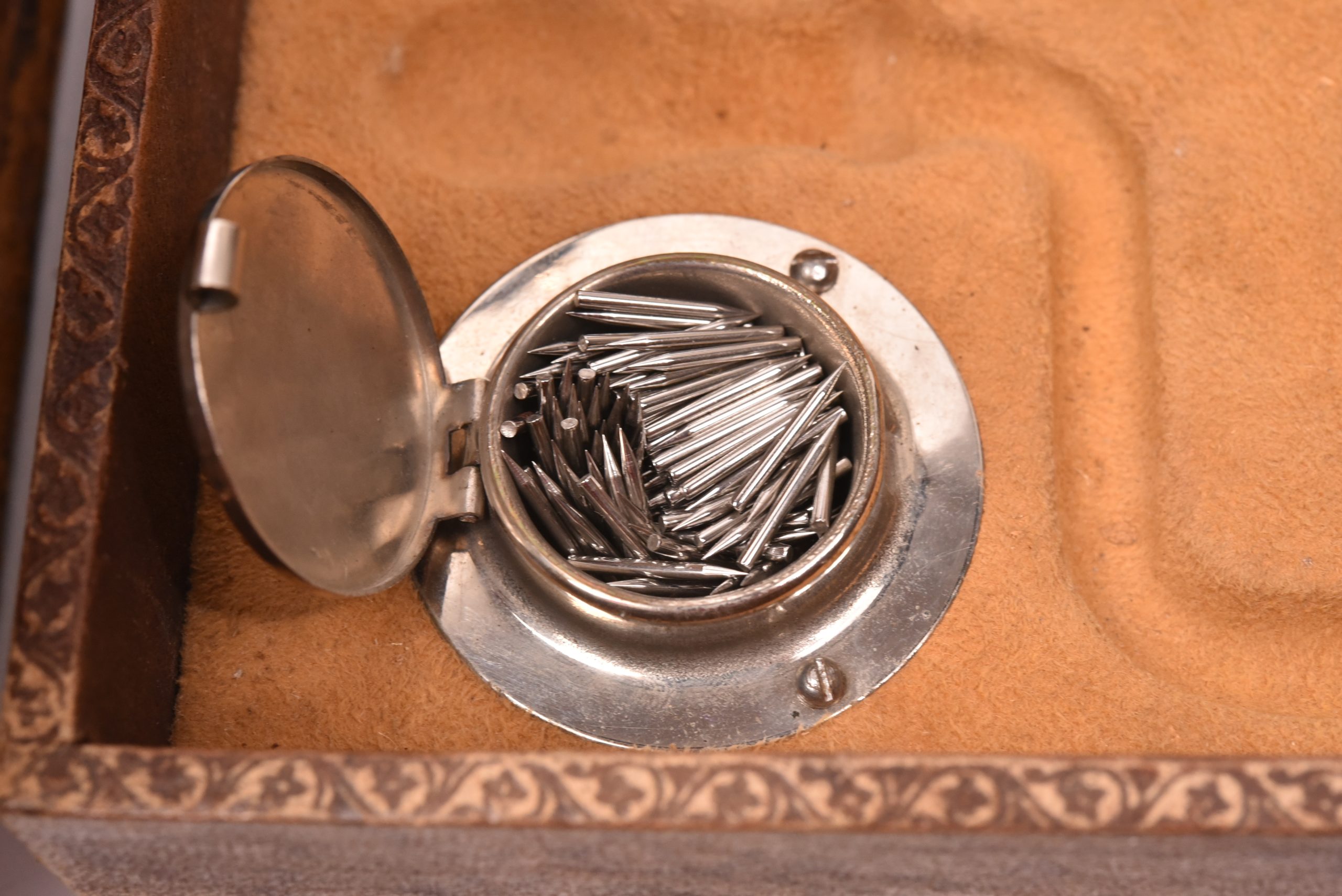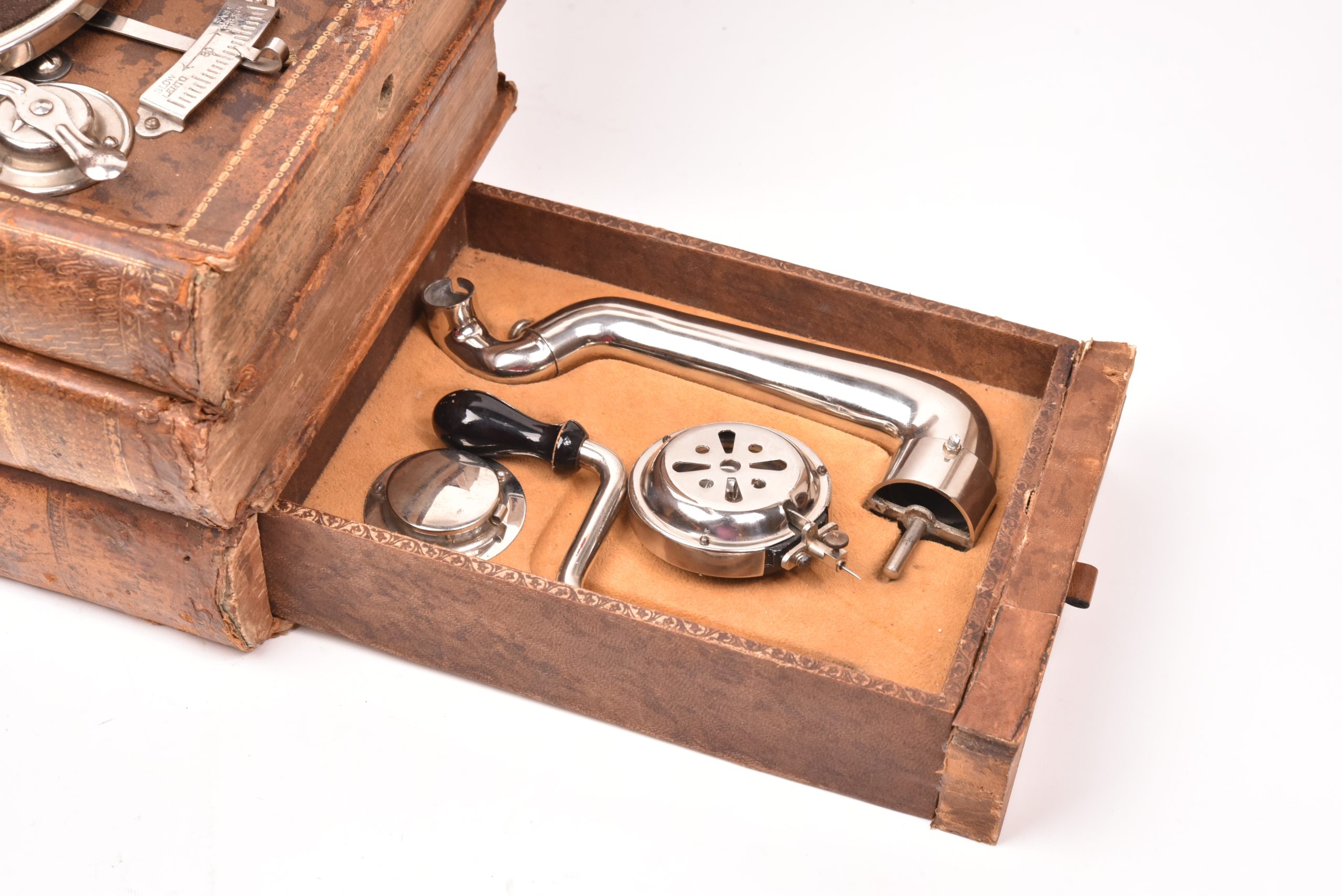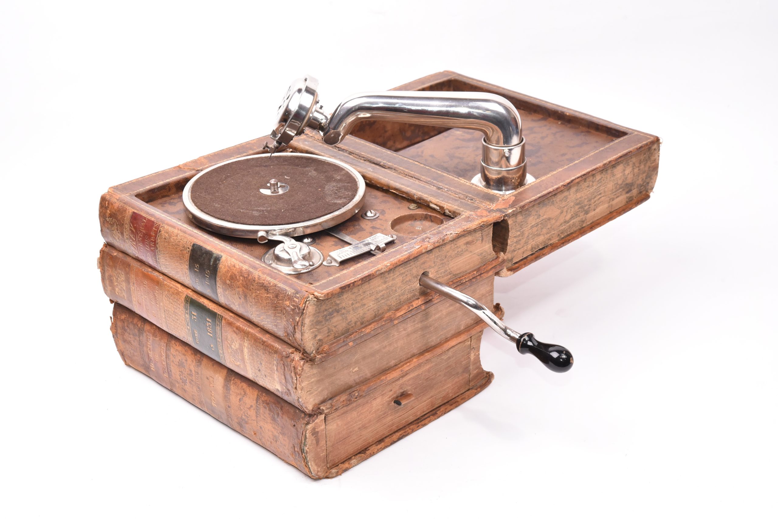 The apparatus is concealed in a stack of 4 bound books, hollowed out, to hide the device. The phonofraph is from the "Paillard" brand and manufactured in Switzerland. Needle diaphragm. H : 22 cm; W : 22 cm; L : 28 cm
