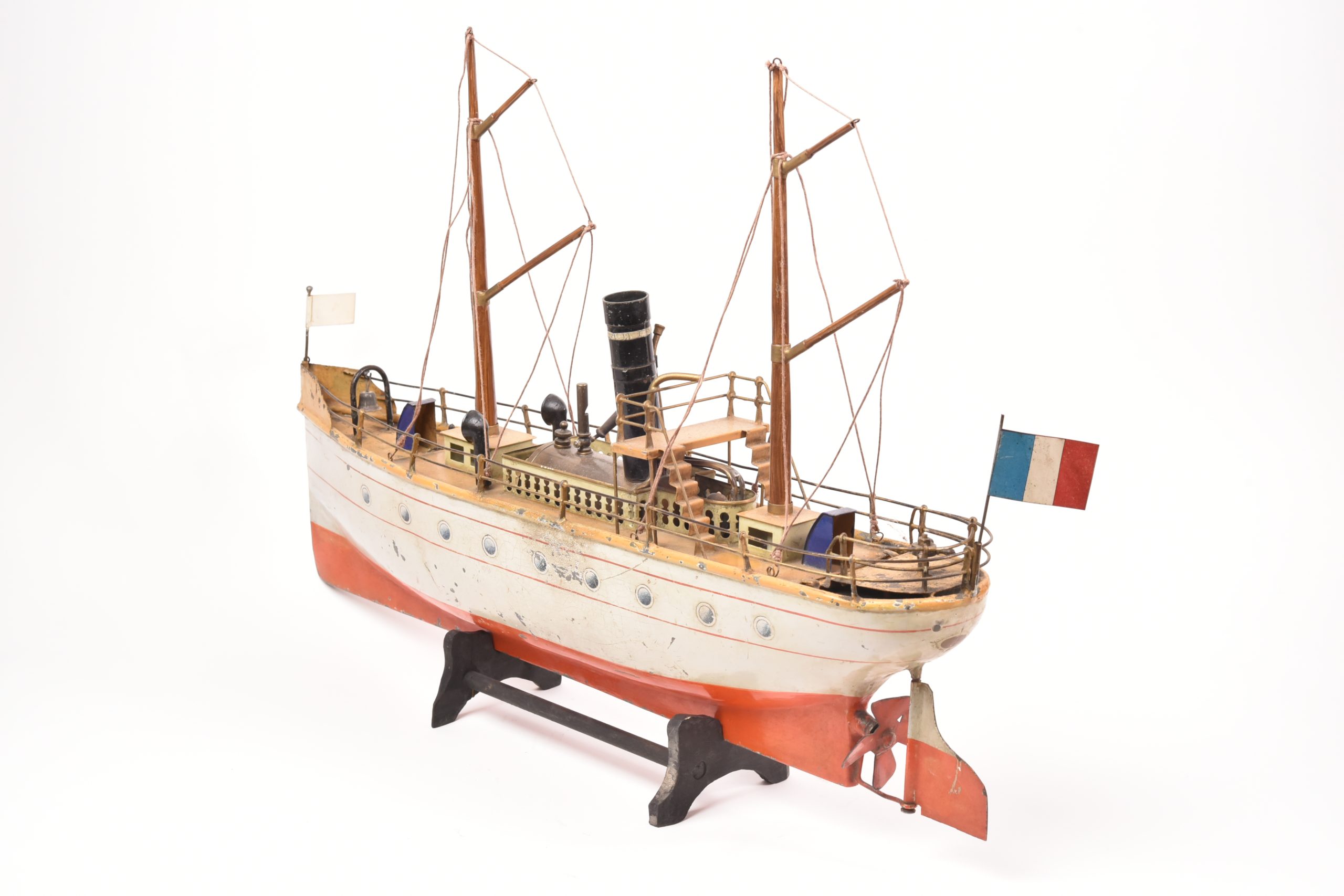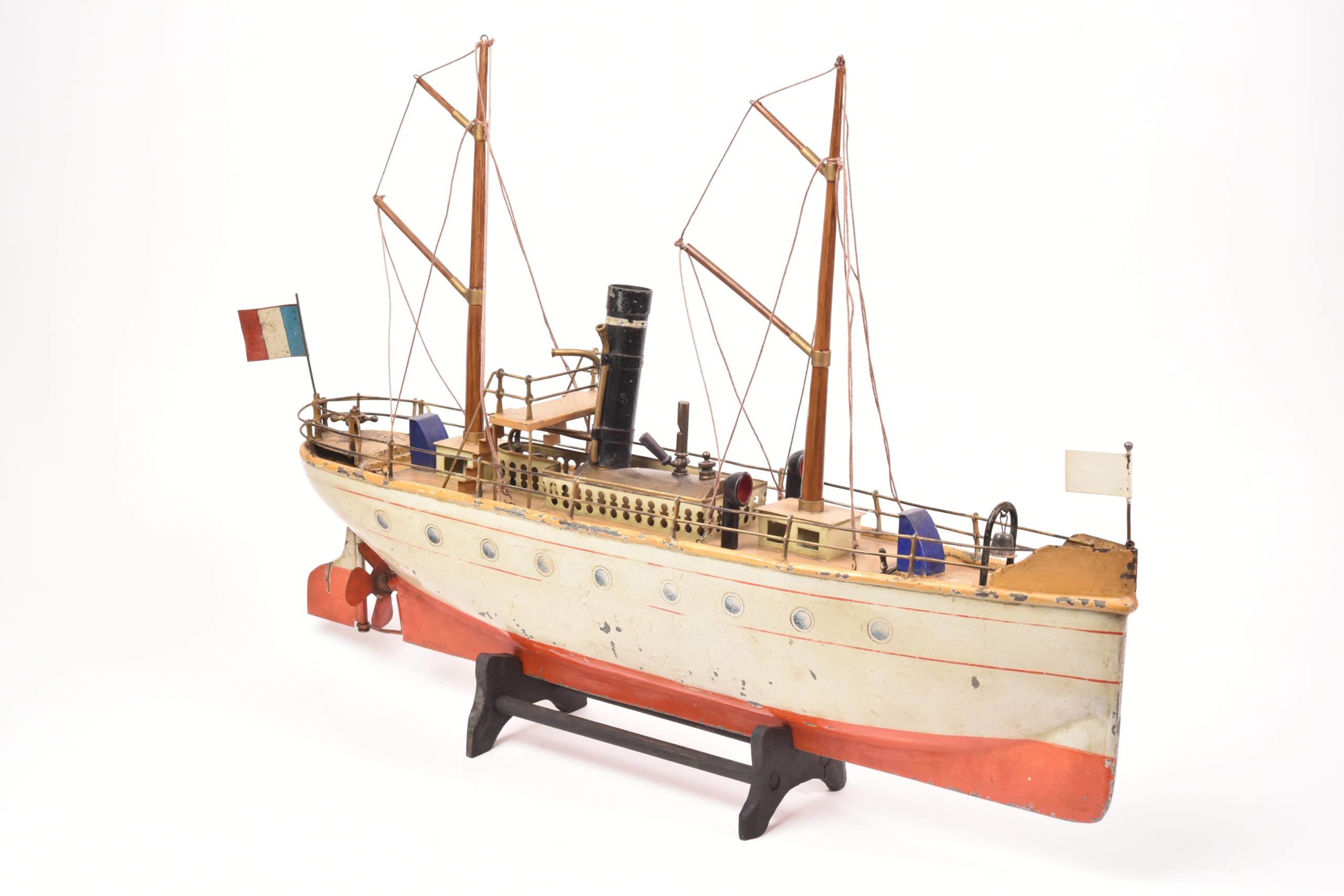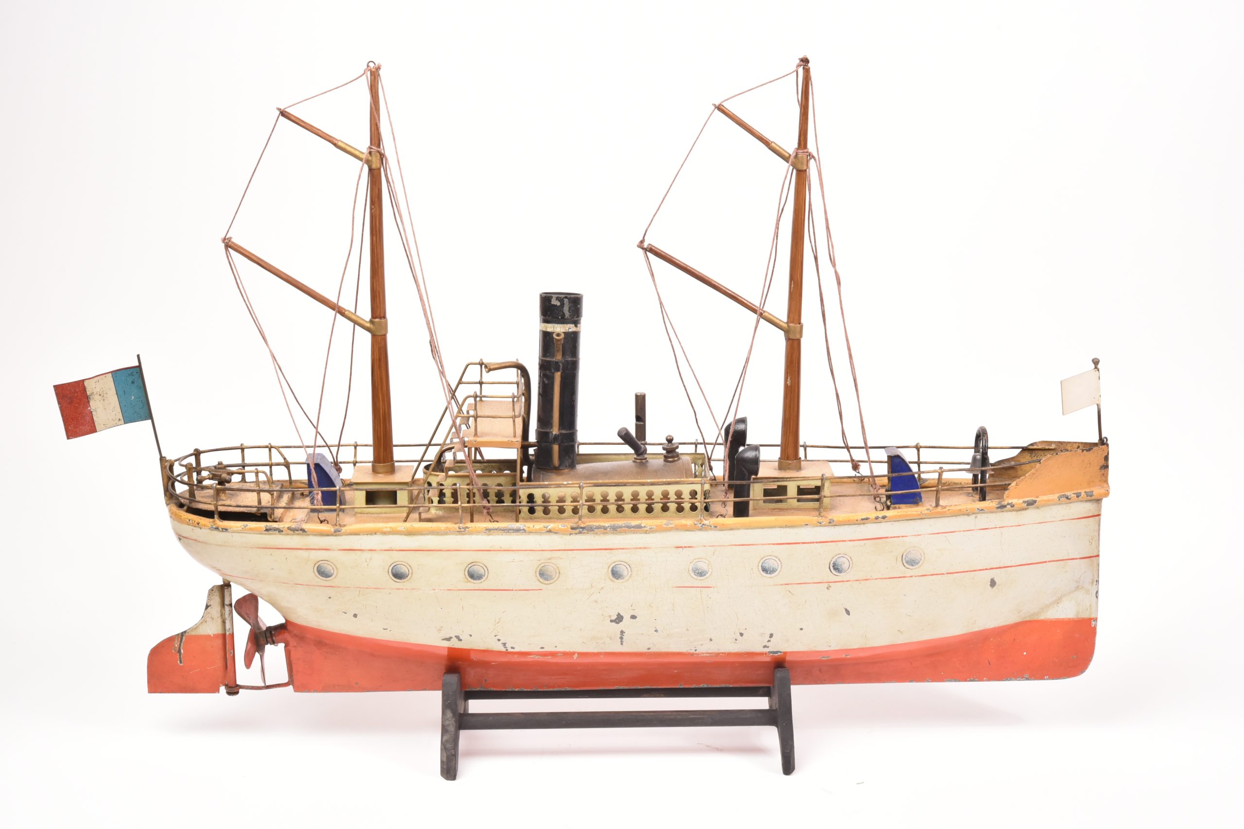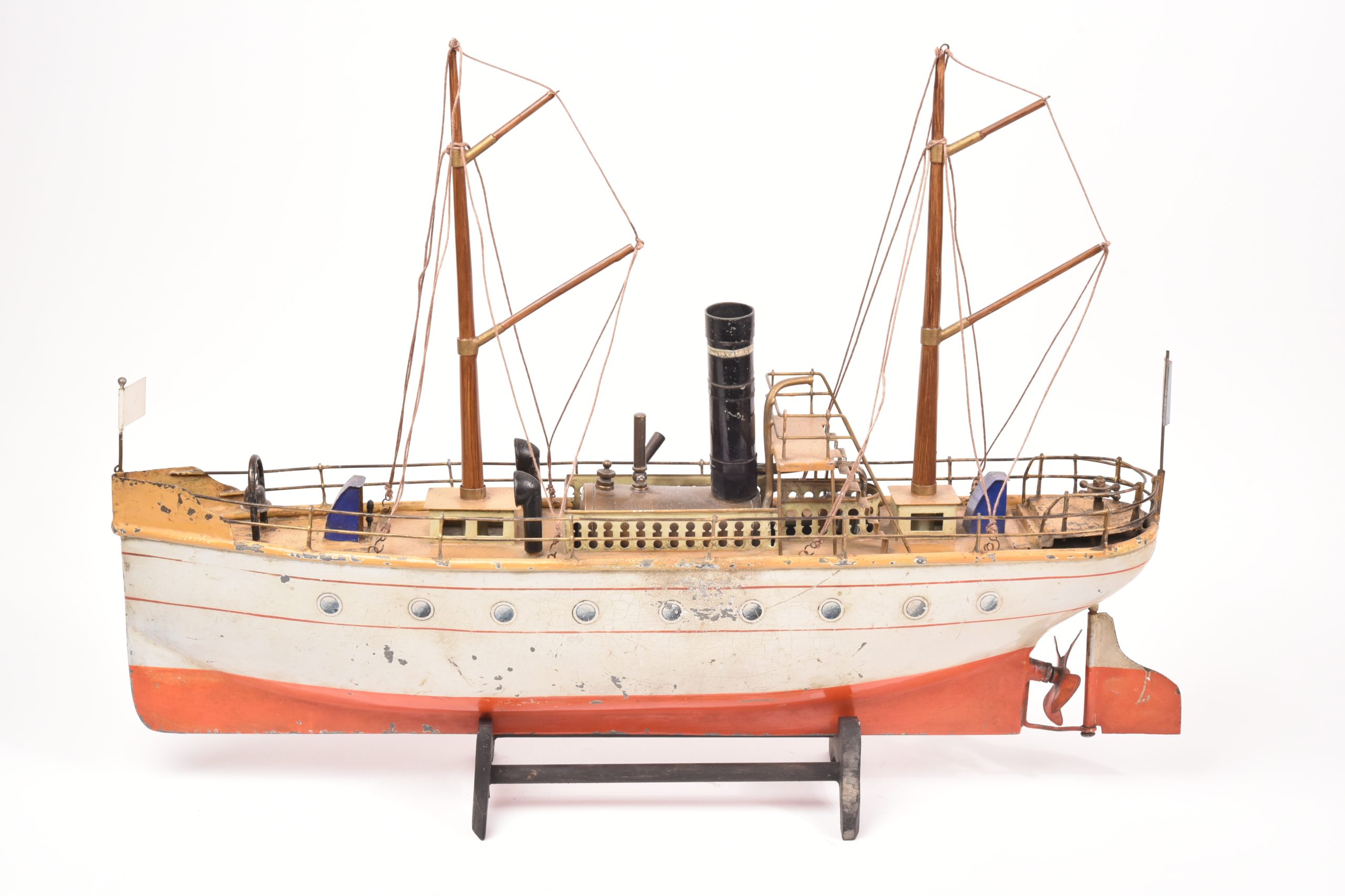 Manufactured by the German toy maker, Carette. This ship is fairly long, measuring 54 cm from bow to stern. The hull is made of painted sheet metal, it features a live steam mechanism, horizontal boiler and oscillating drum. This model might be the very first ever made by Carette with this mechanism. The boat is complete with original paintwork. The super structure features some paint renovations.  Beautiful condition.